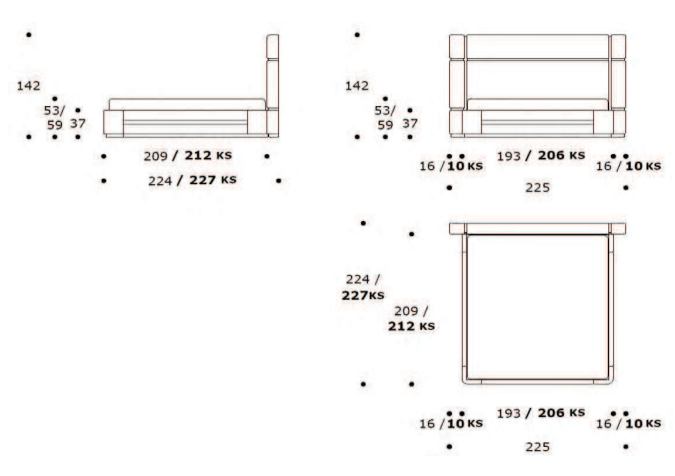 Dimensioni: larghezza 225 cm, altezza 142 cm, profondità 224 cm