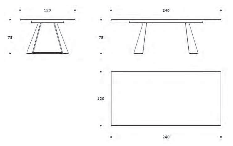 Dimensioni: larghezza 240 cm, altezza 75 cm, profondità 120 cm.
