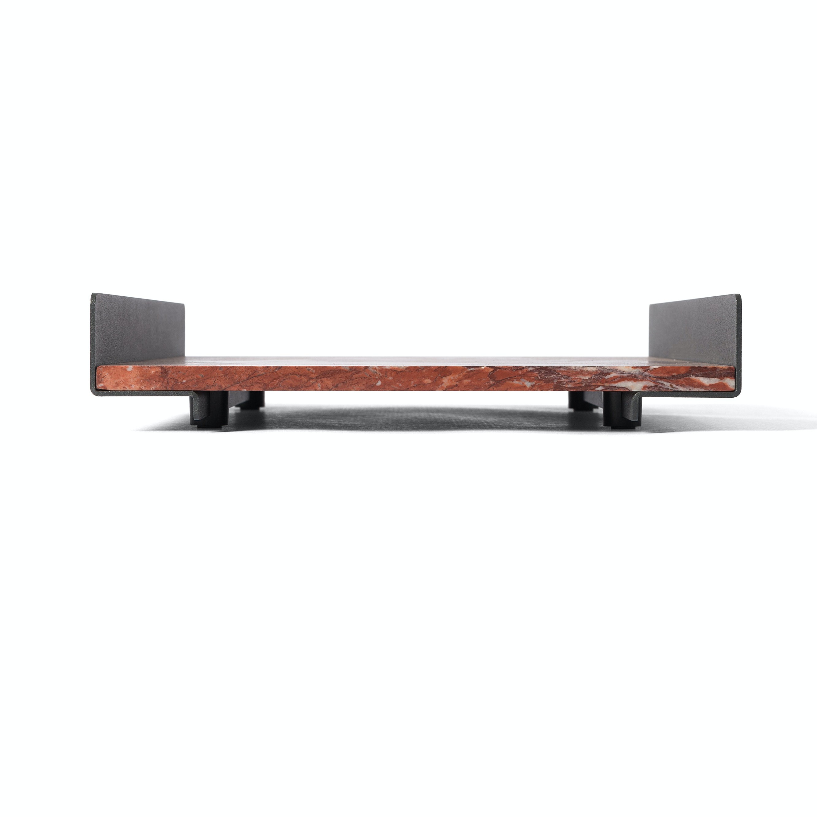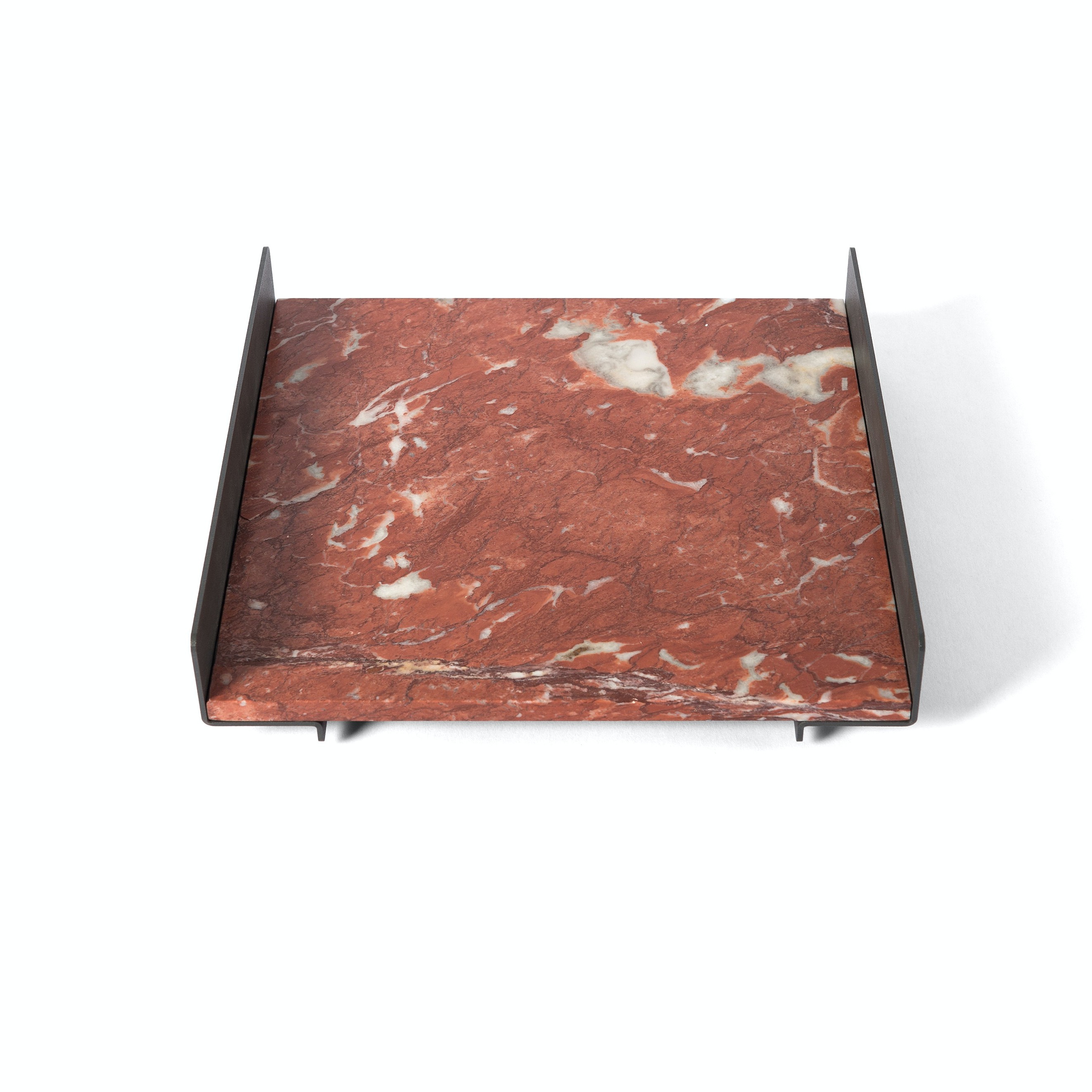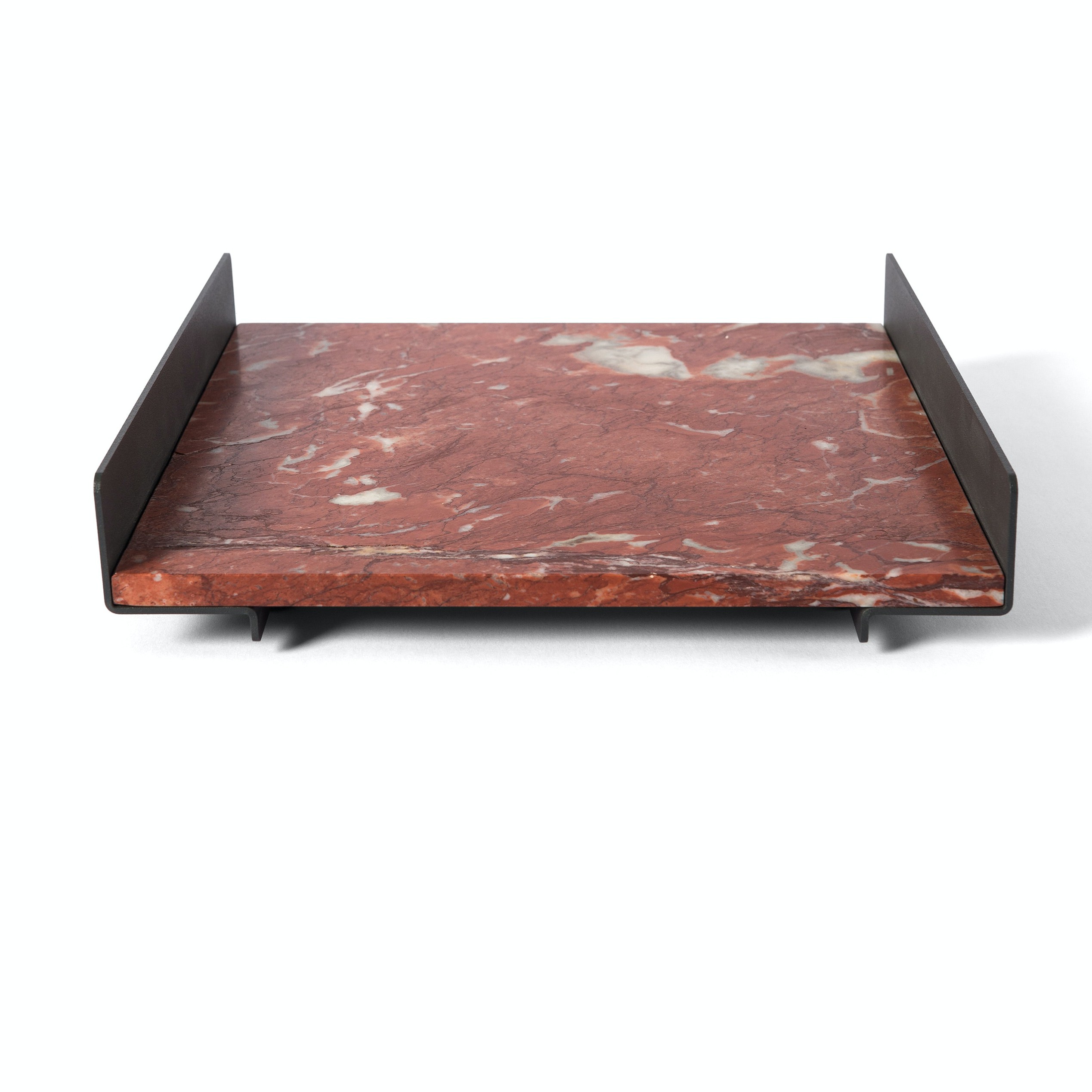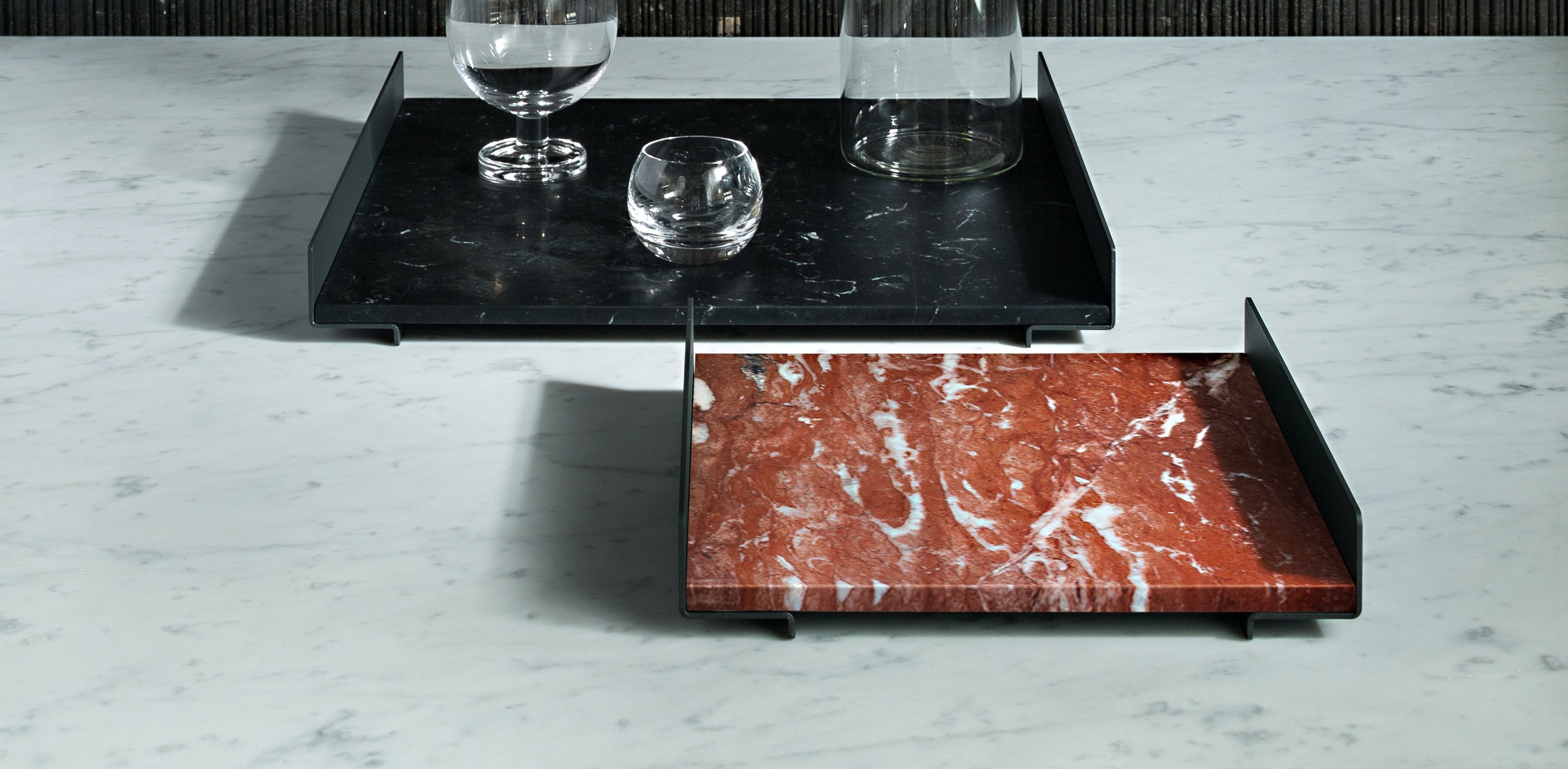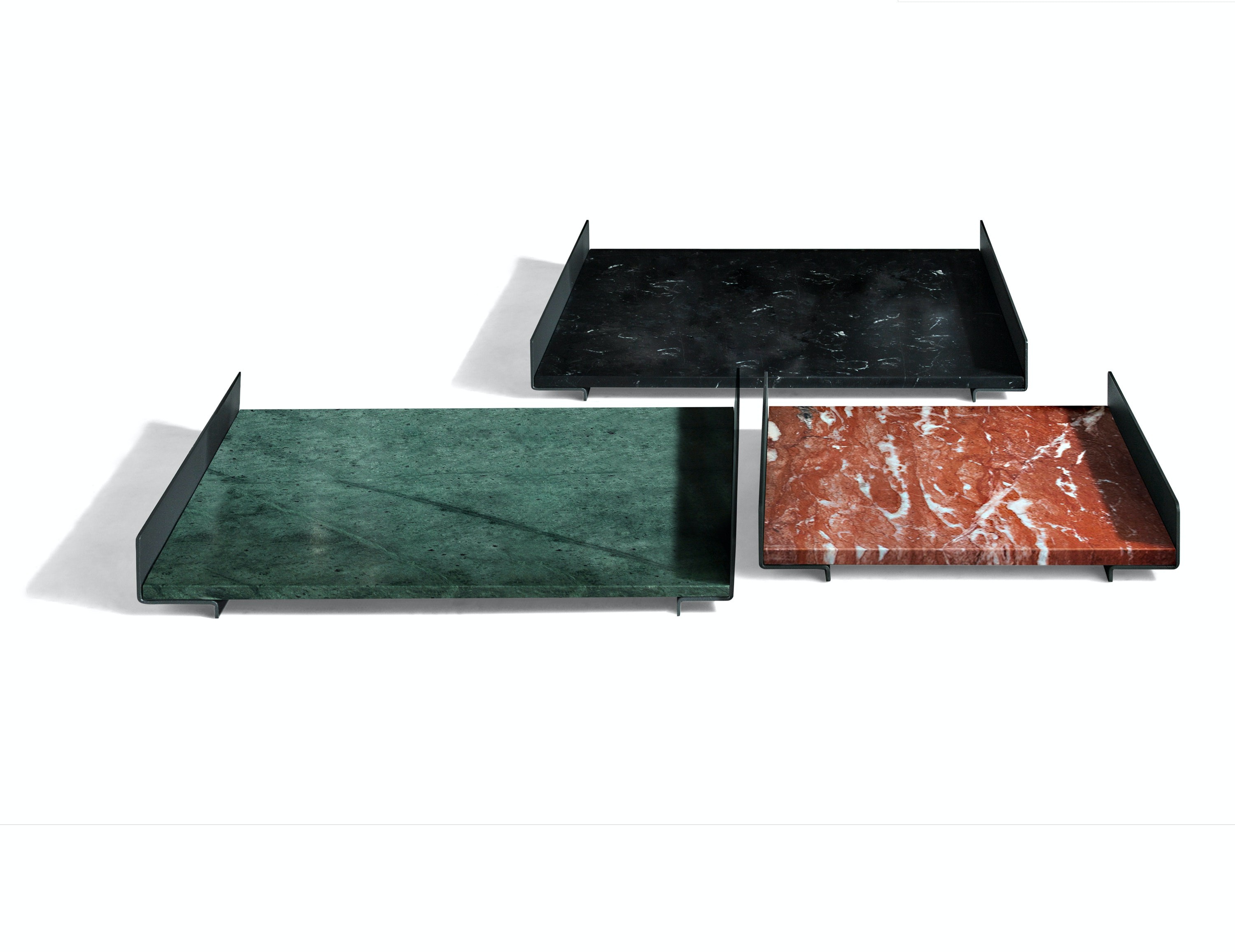 The L Collection 03 trays are square or rectangular slabs of marble flanked by a bracket of dark iron.
