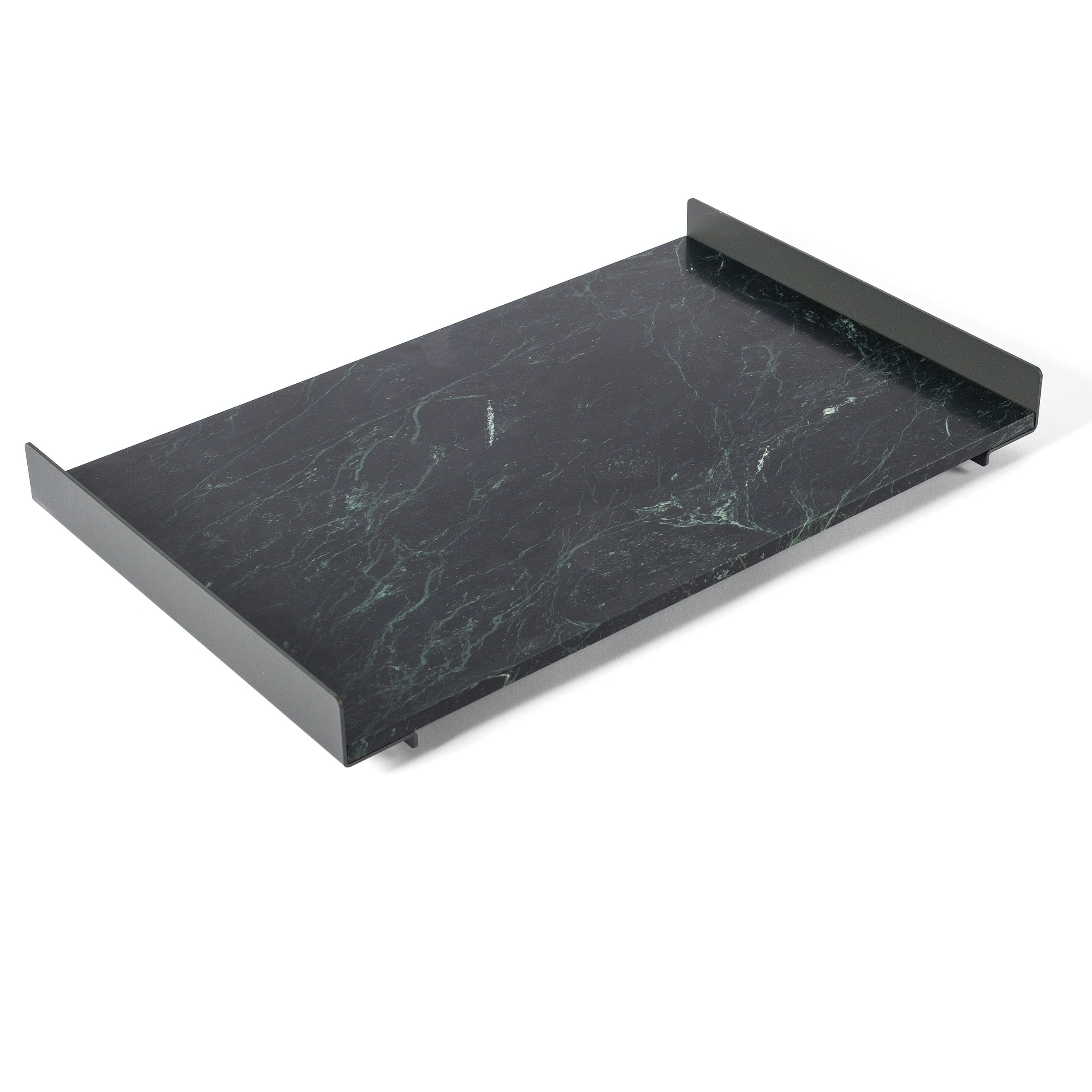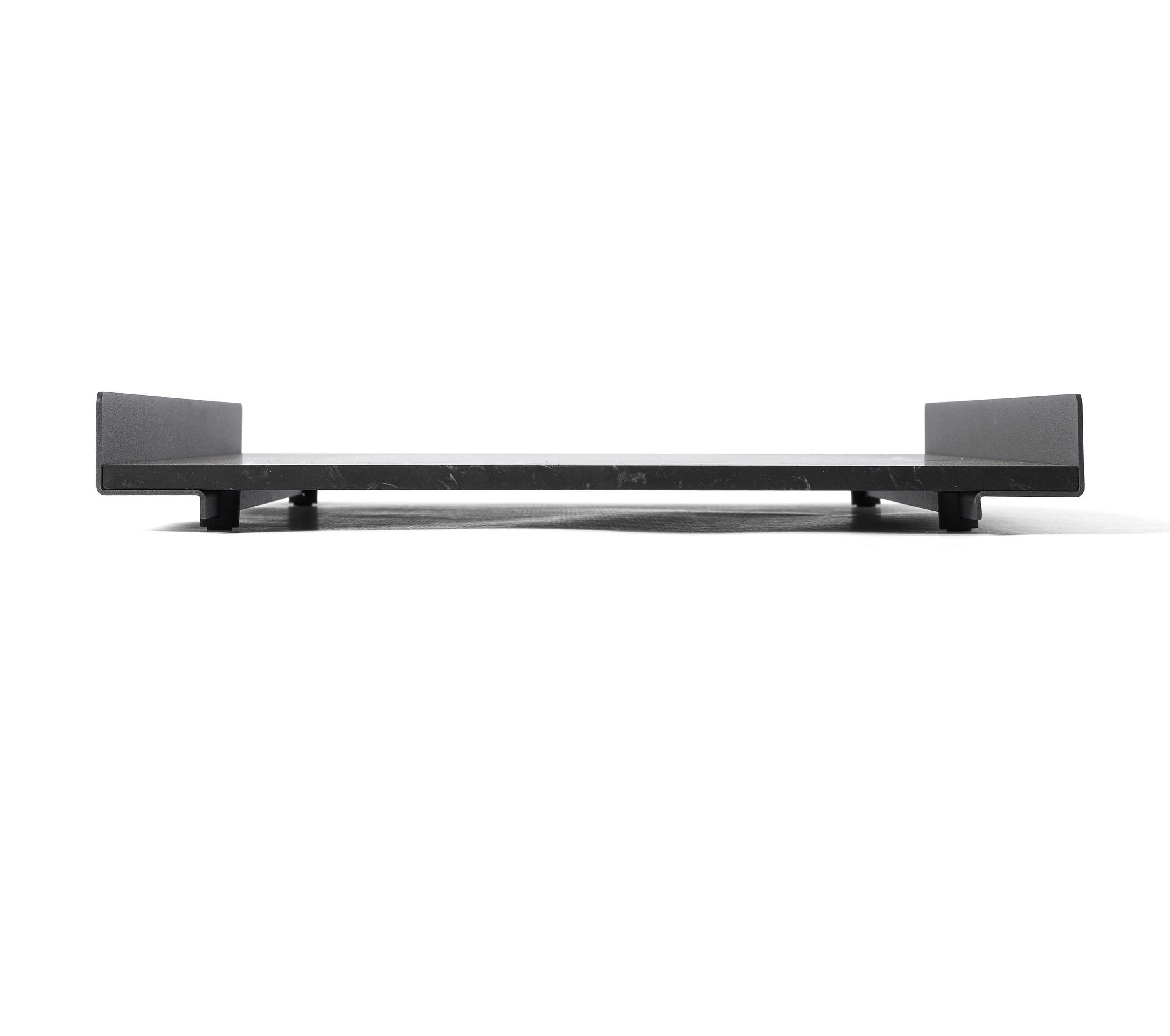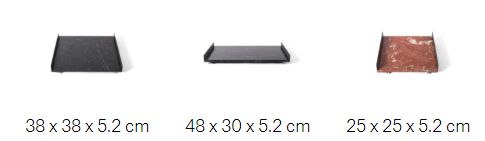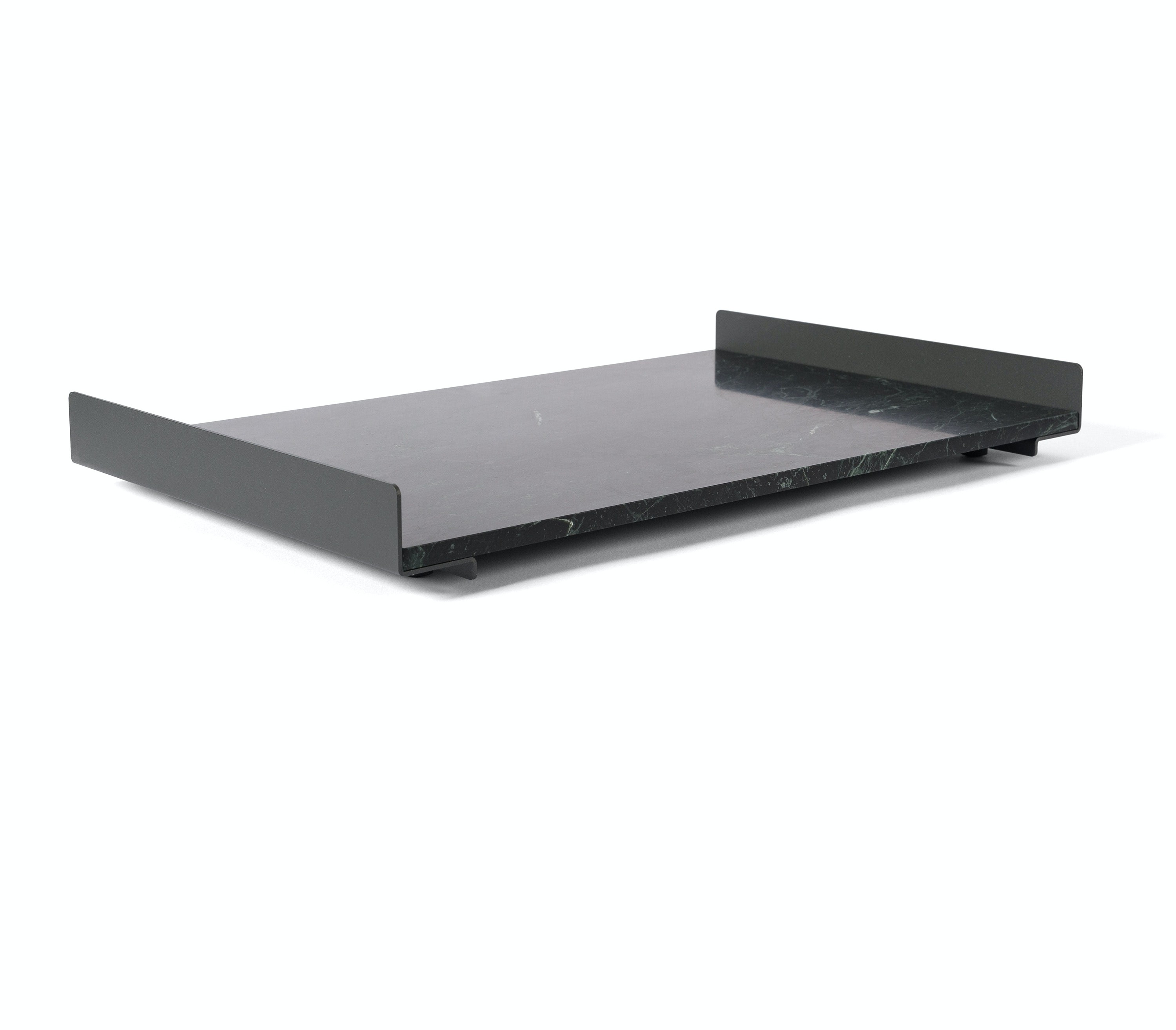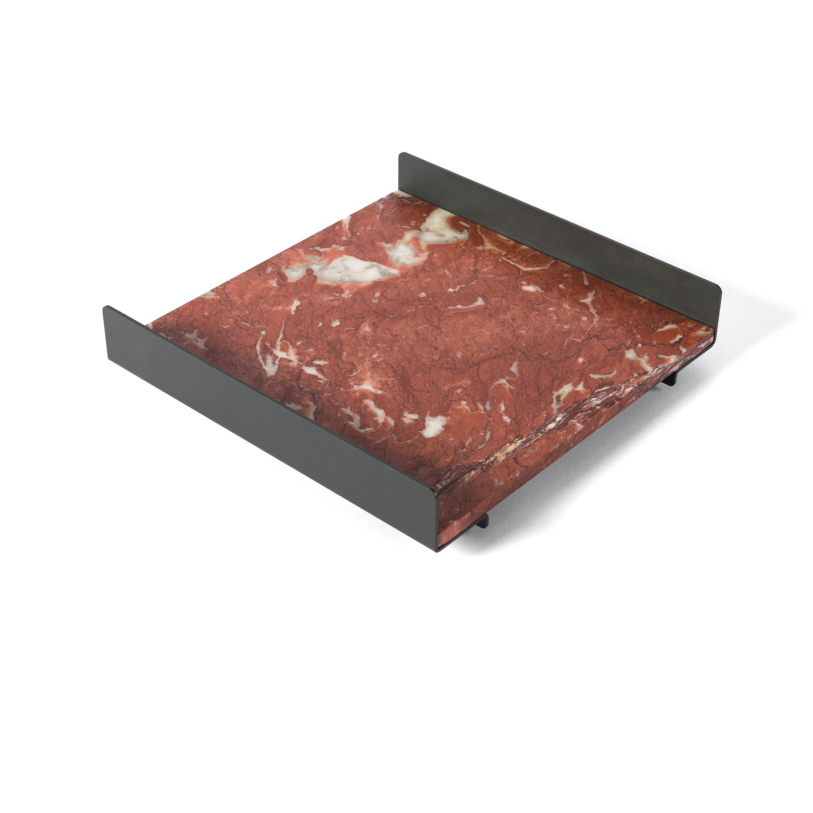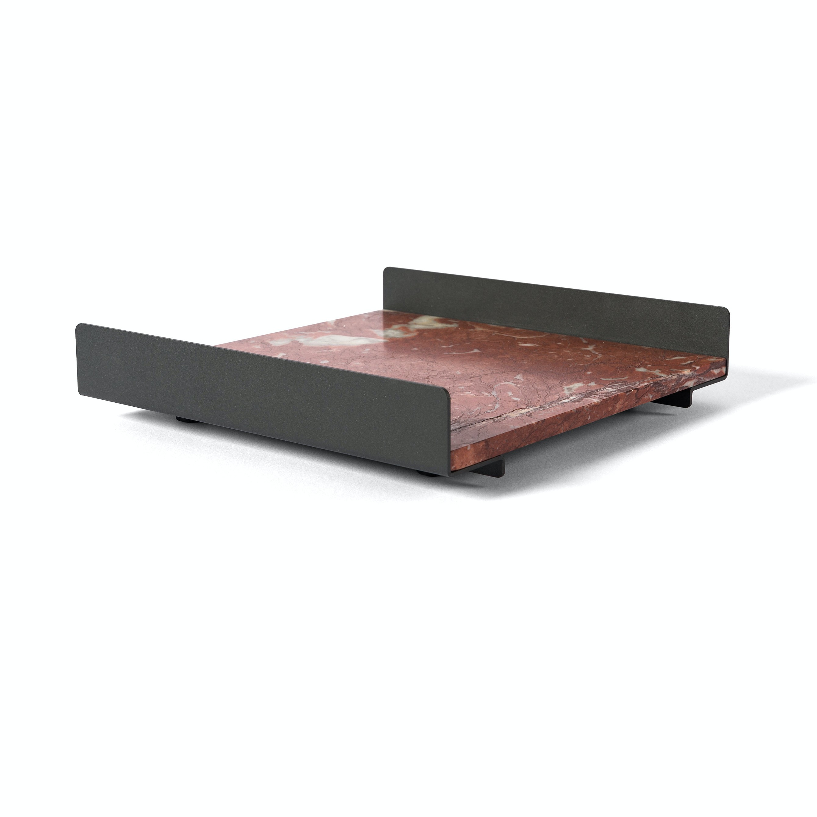 The L Collection 03 trays are square or rectangular slabs of marble flanked by a bracket of dark iron.