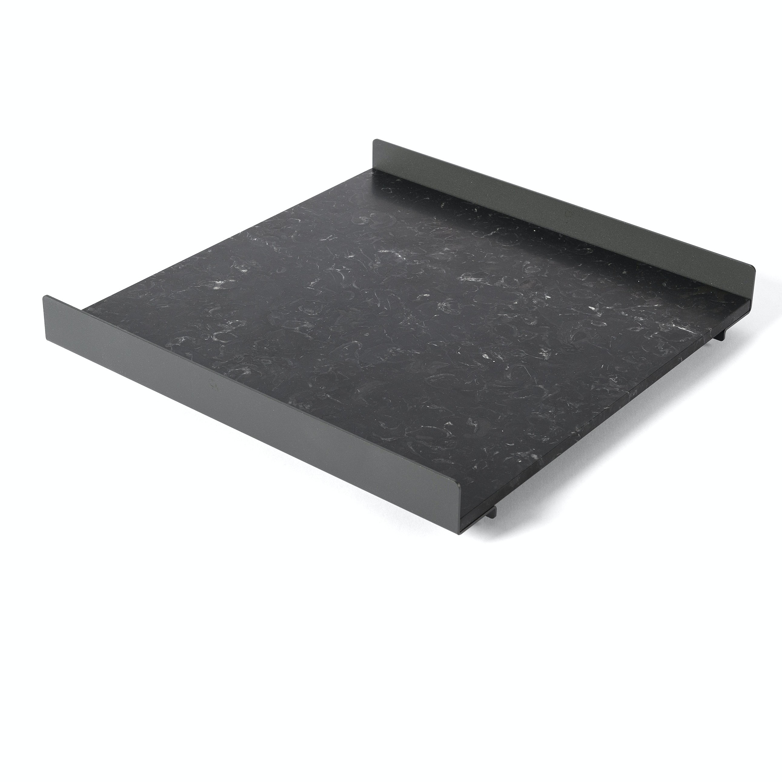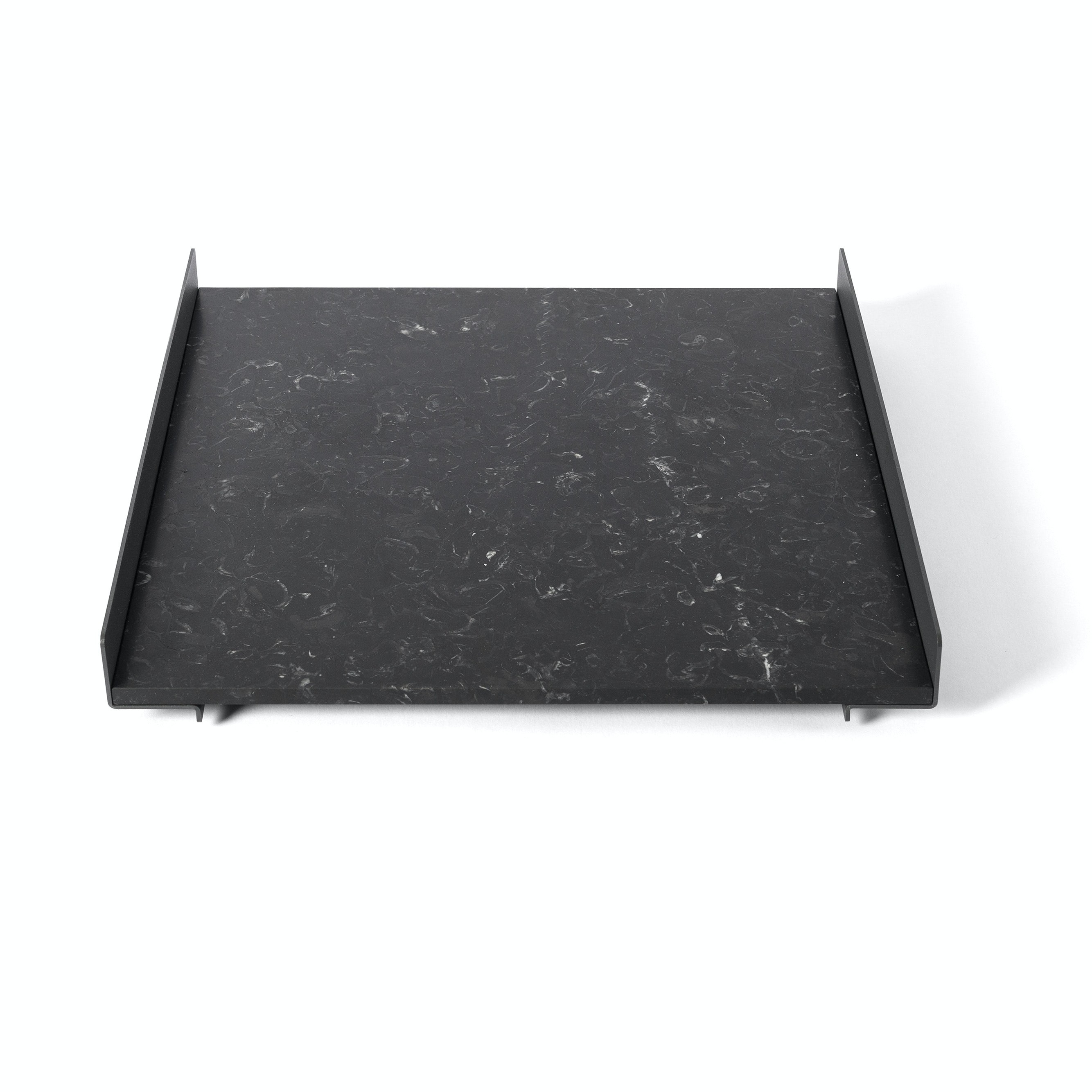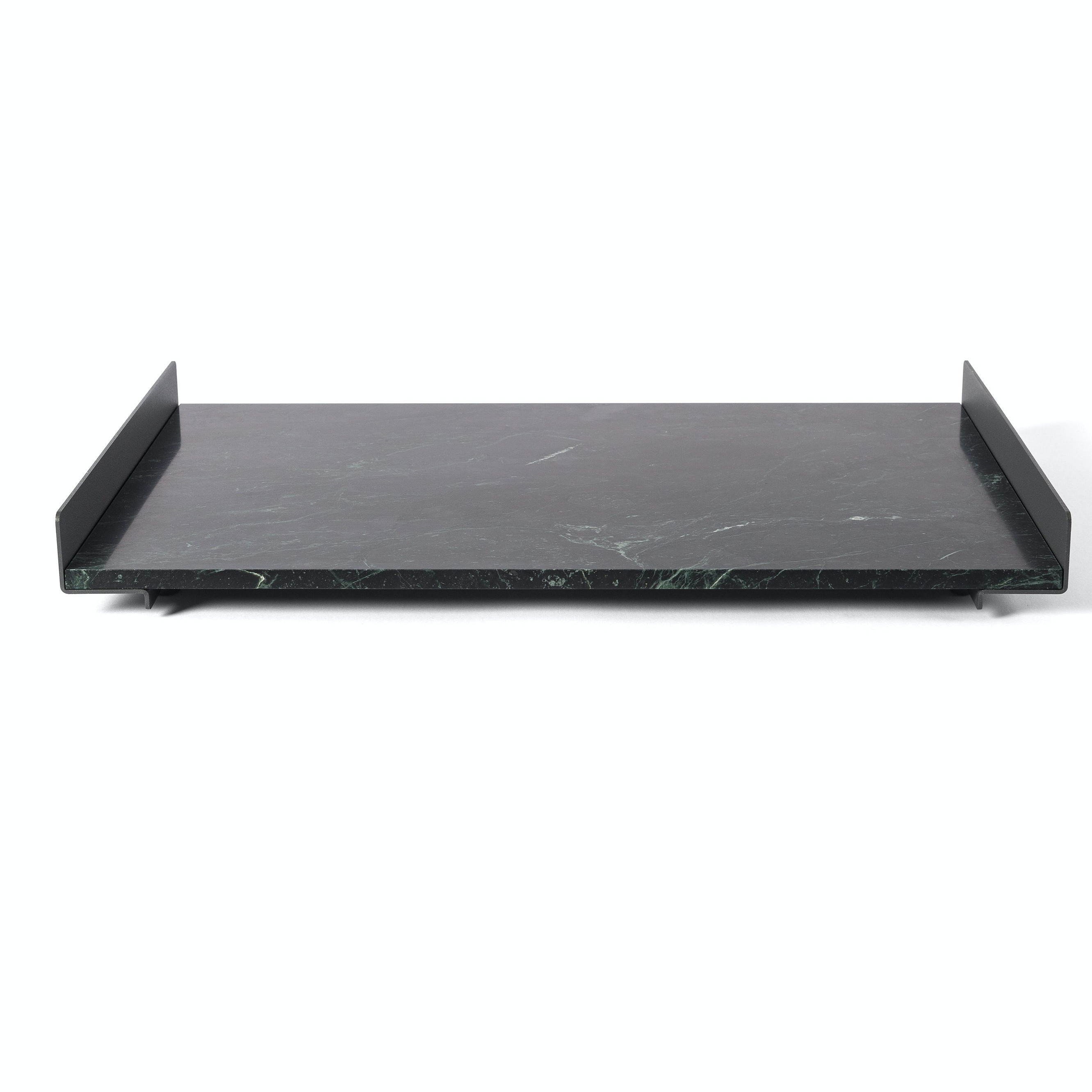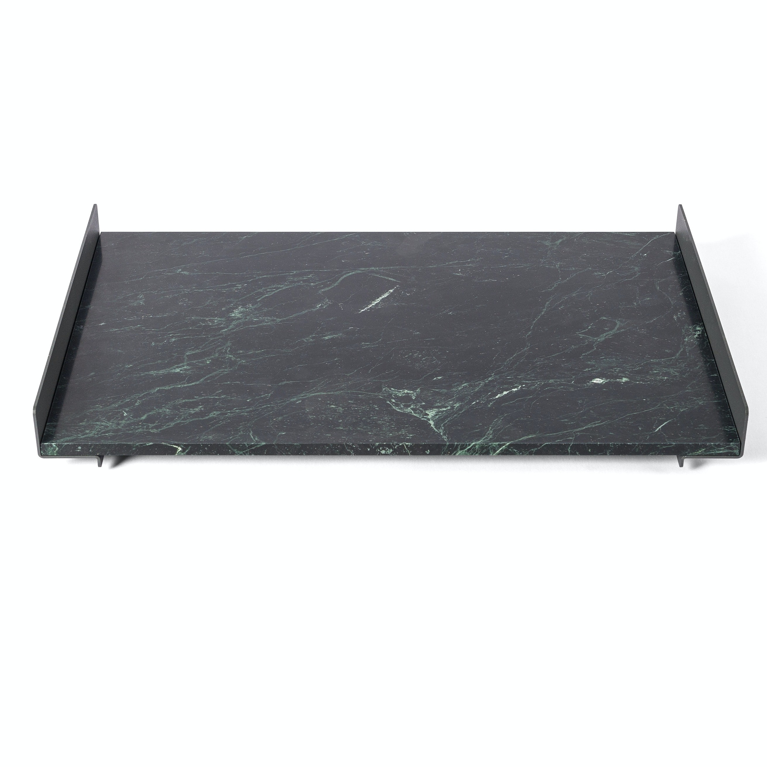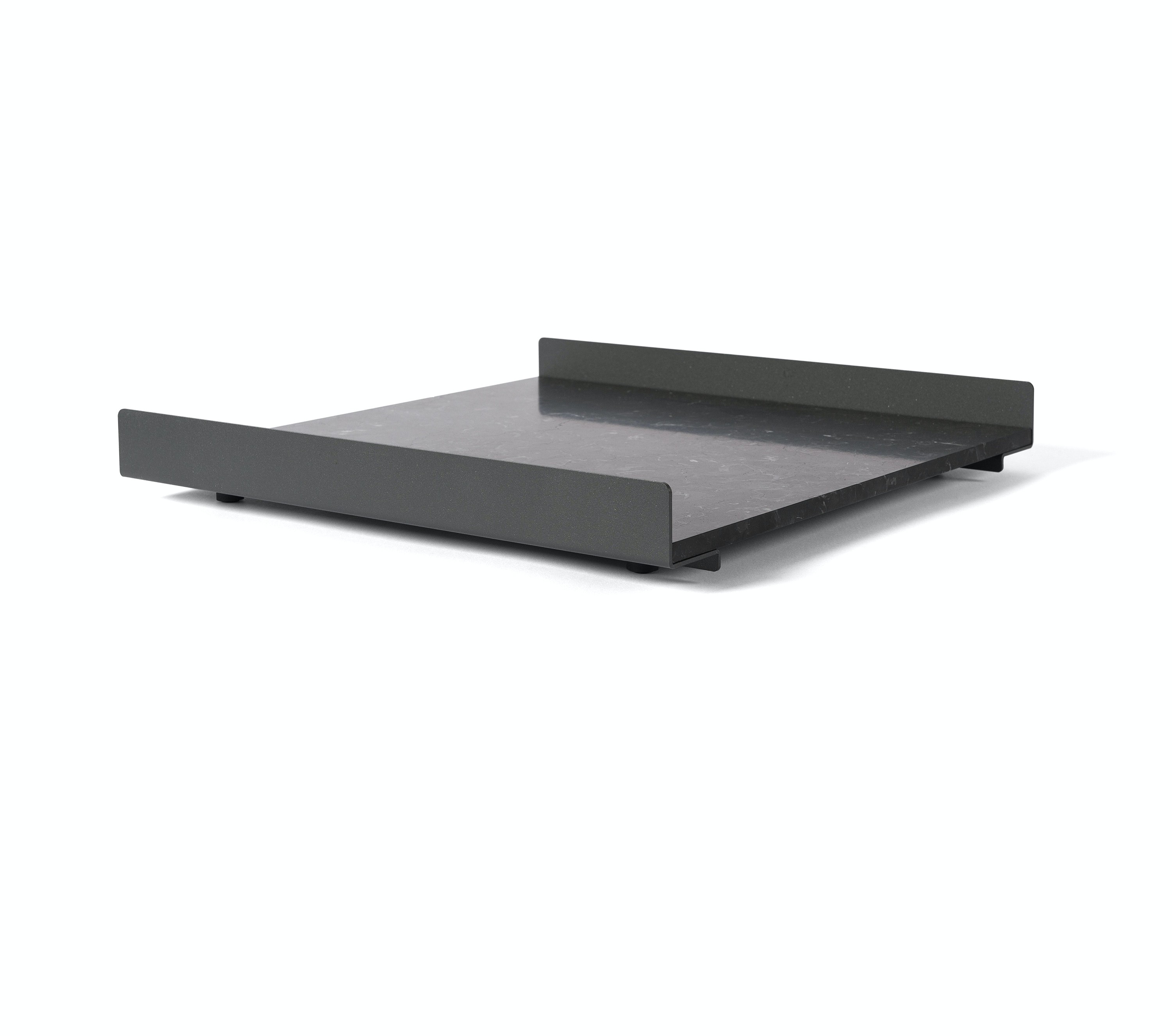 The L Collection 03 trays are square or rectangular slabs of marble flanked by a bracket of dark iron.