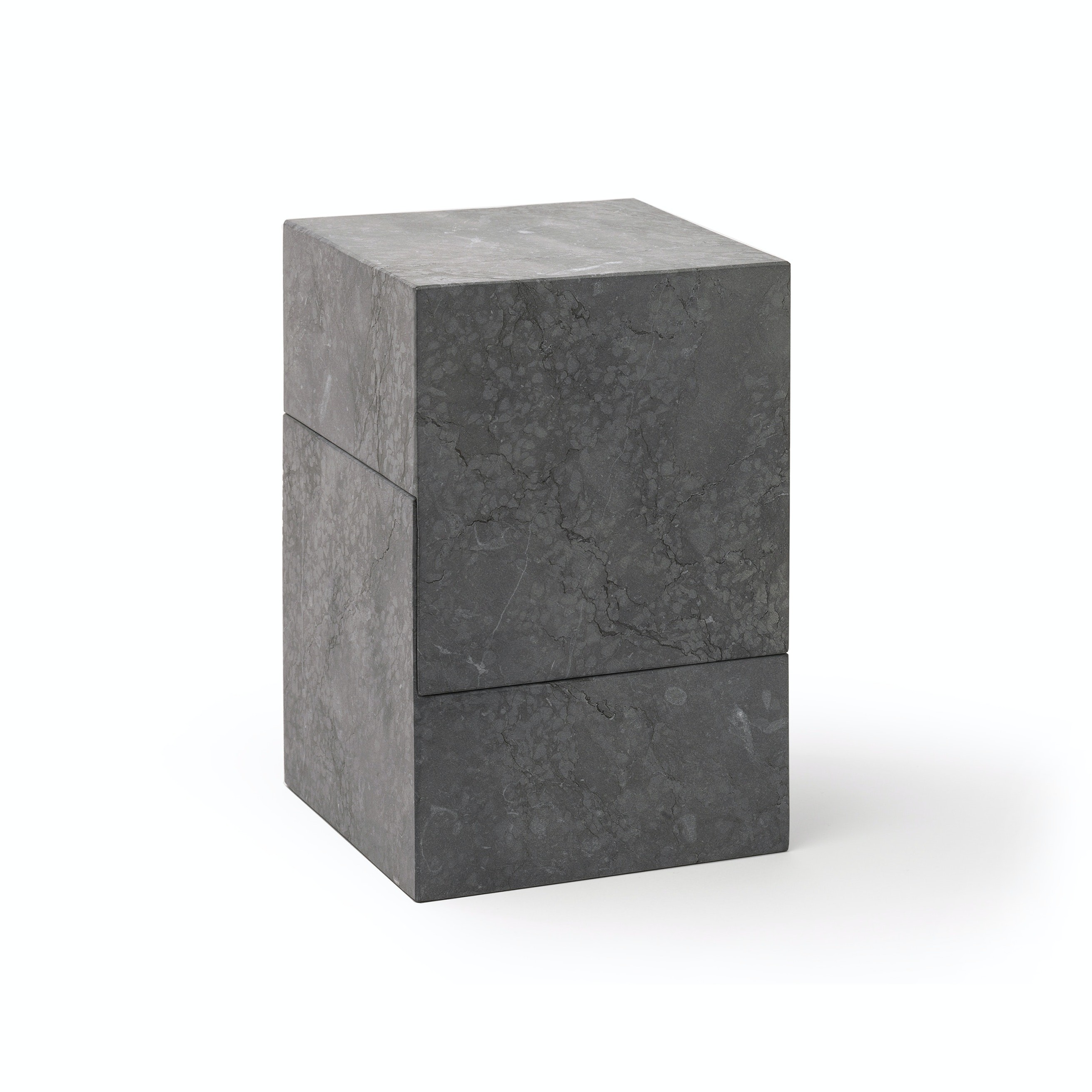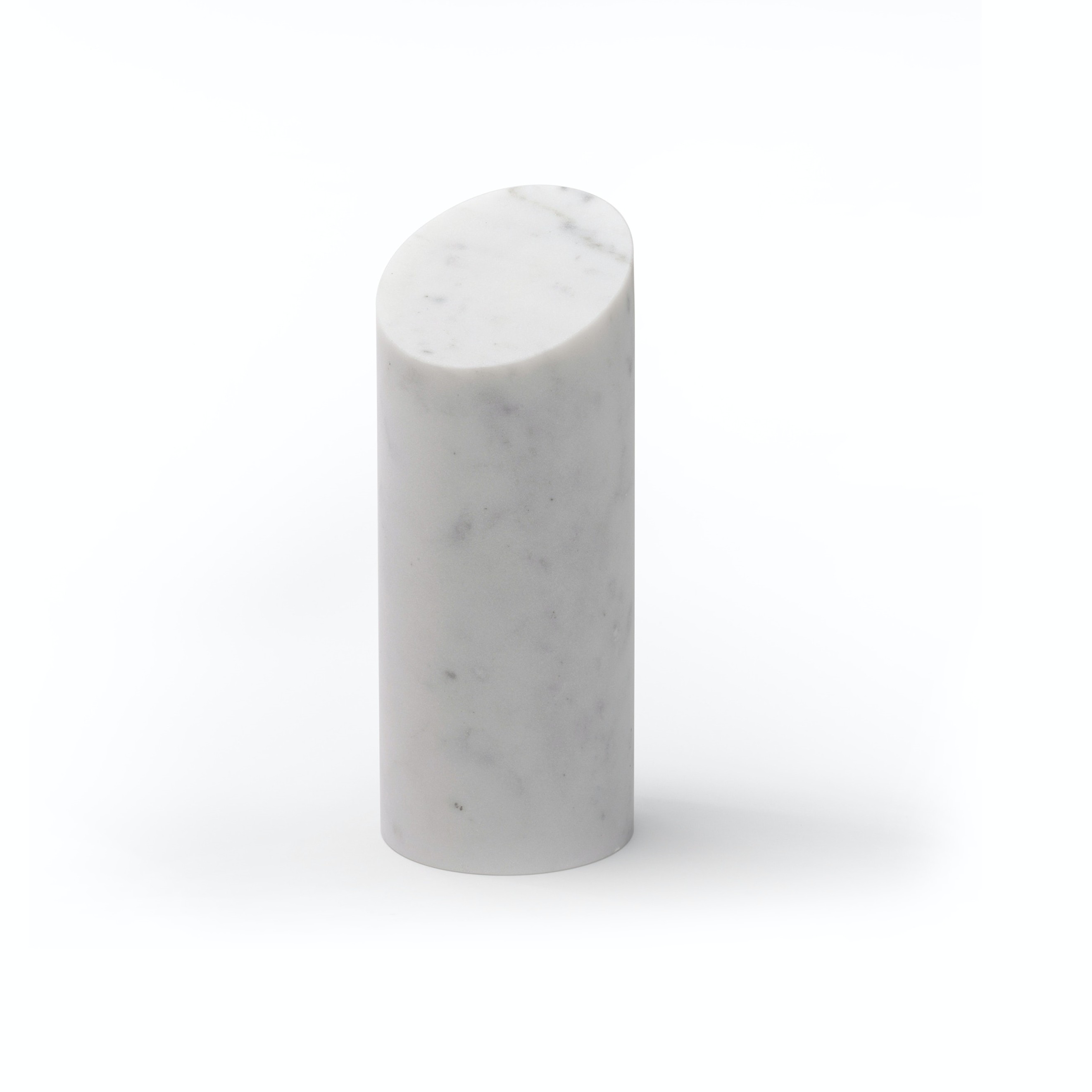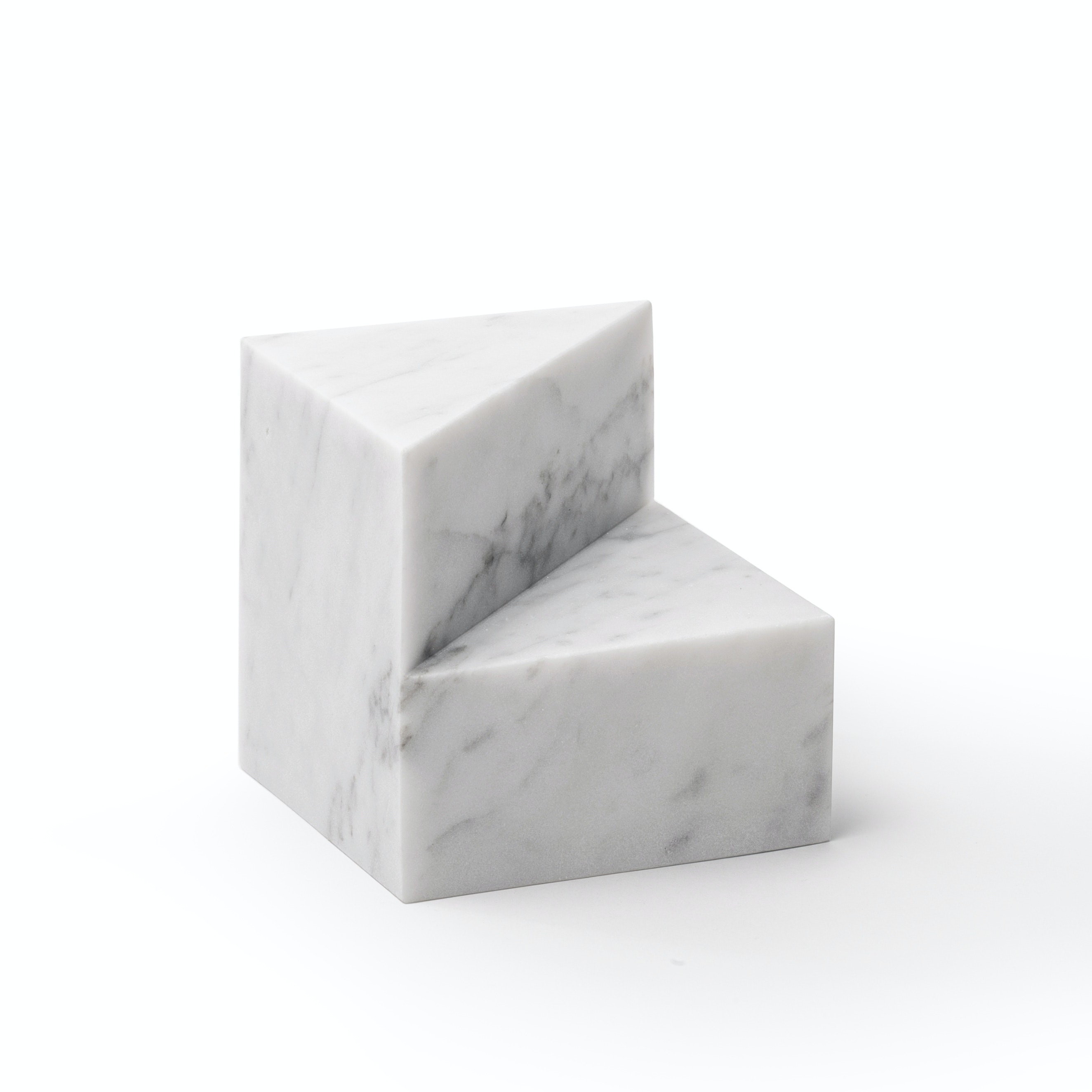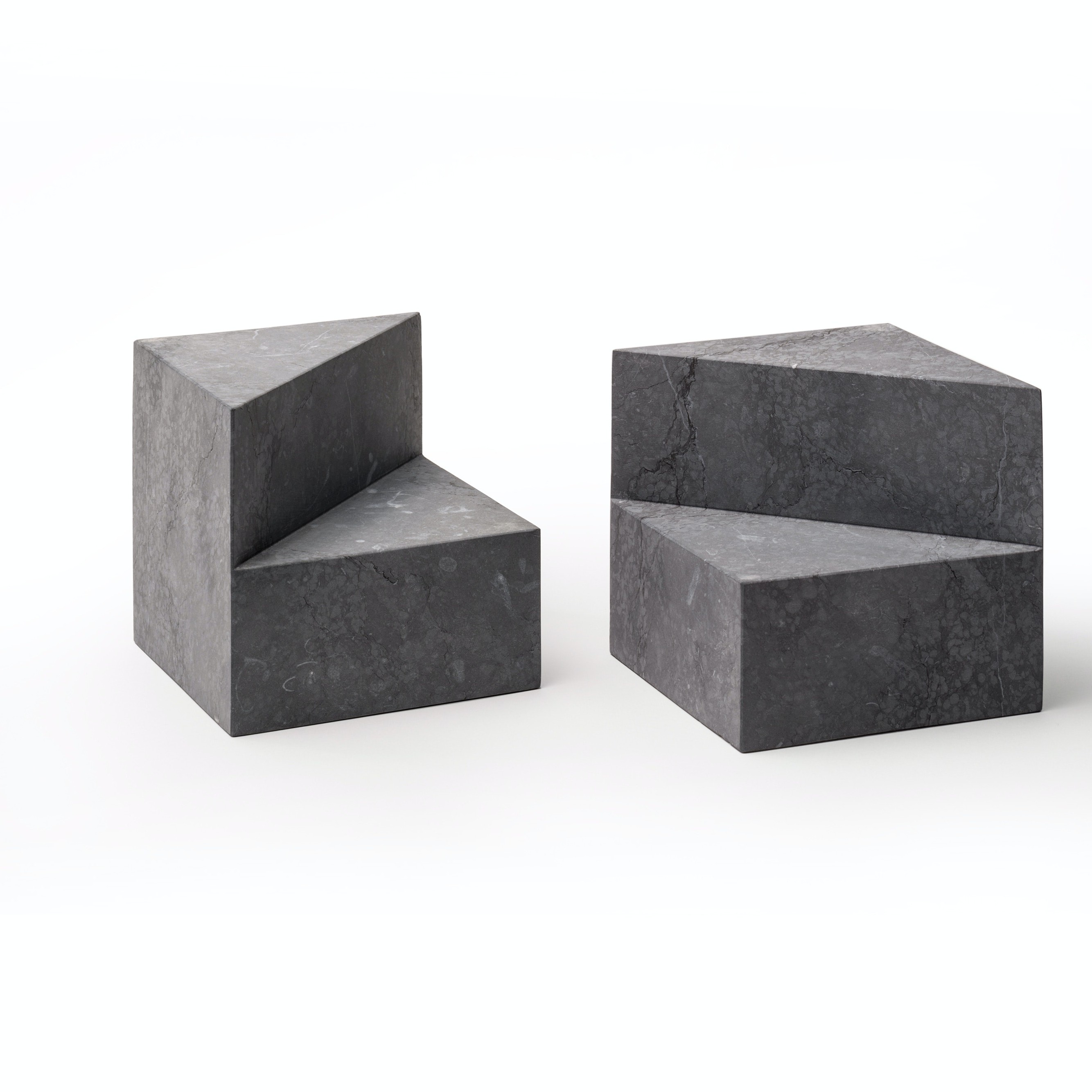 Available in a single sloped cylindrical tower or set of monolithic stepped blocks, the bookends are formed of either white Bianco Carrara marble from Tuscany or dusky black Nero Marquinia.