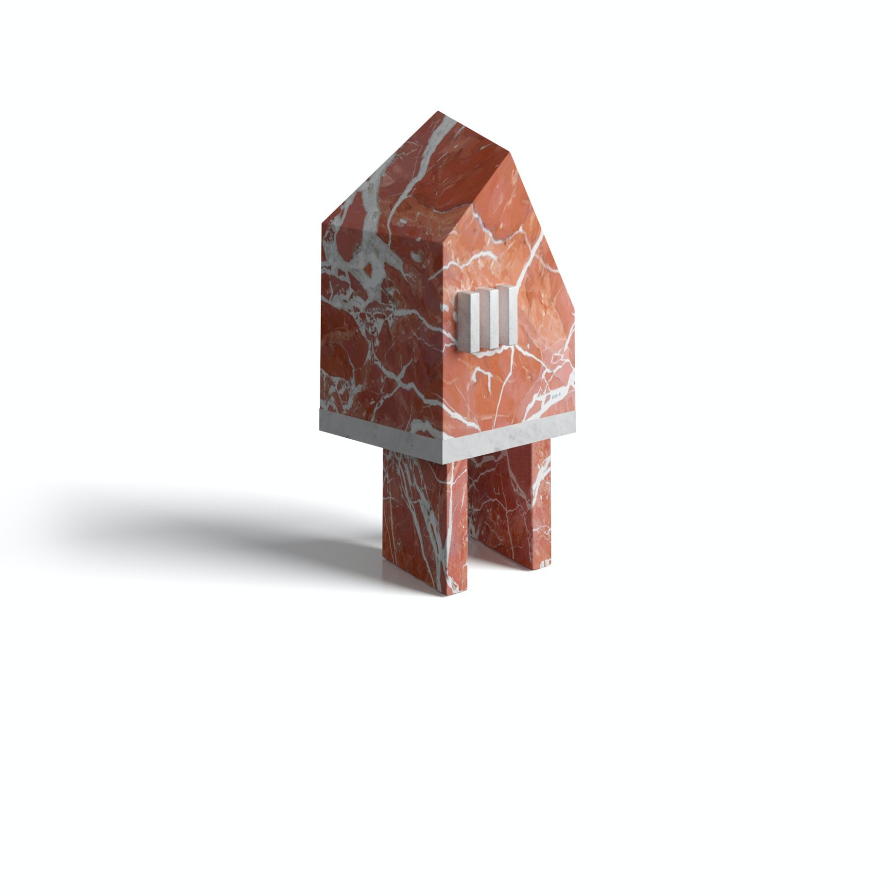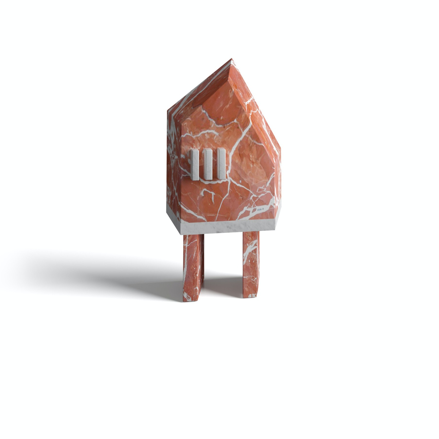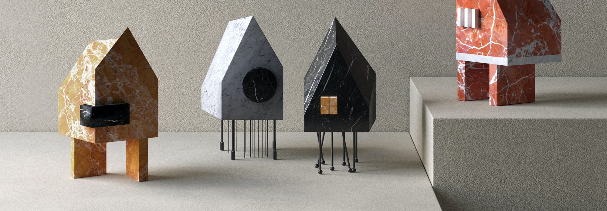 A series of architectural sculptures in natural stone, playing with the notion of the archetypical house, make up a fantasy neighbourhood, with each piece their own tiny contained world to be explored, lived in and experienced.