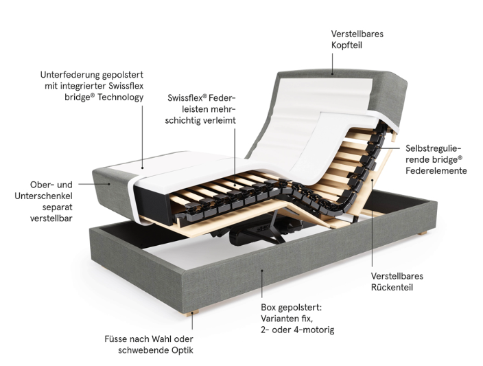 Now innovative comfort is dressed in the modern boxspring look: the Swissflex? Box bed systems combine the adaptable, pressure-relieving bridge? technology with the popular design of a boxspring bed.