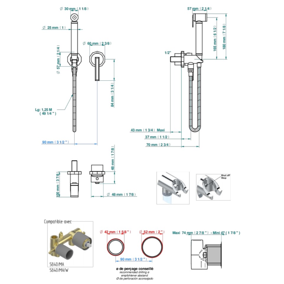 Trim only for WC douche including: trigger spray, wall mounted single lever mixer, reinforced hose (1.25m), wall outlet with integrated elbow with safety stopper