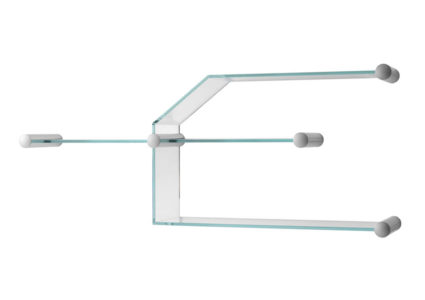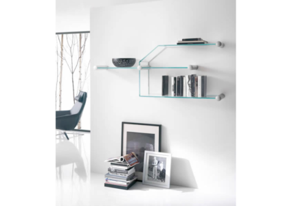 Modular shelves. The wall fixing is given by a cylindrical aluminium joint. The glass shelves are in different sizes and shapes and are available in transparent glass or extraclear glass.