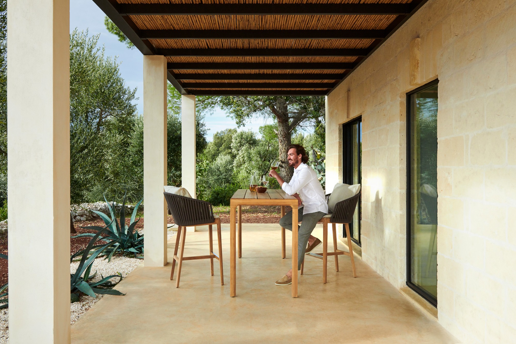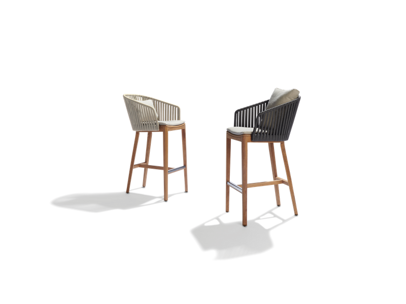 The airy design of the Mood collection and its warm combination of teak and handwoven backs will immediately create an intimate atmosphere on your patio. The rounded design of the durable teak gives the bar chair a warm and friendly tone. The weave in Tricord has a very soft touch, but can nevertheless defy all weather conditions. Tribù has developed a range of natural colours that fit in with any type of outdoor environment. The back cushions are available in various styles to match every taste.