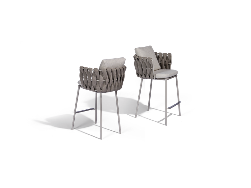 The Tosca counter-height chair is a perfect fit for a pool-house kitchen counter. Or pair it with the Illum counter-height table, which is 13cm lower than a regular bar table for poolside cocktails. The chair's elegant seating shell in powdercoated stainless steel is upholstered with an extra- large, vertical weave, developed exclusively by Tribù. A great deal of research resulted in a unique product with a natural and soft appearance, that is nevertheless 100% weatherproof and stain repellent.