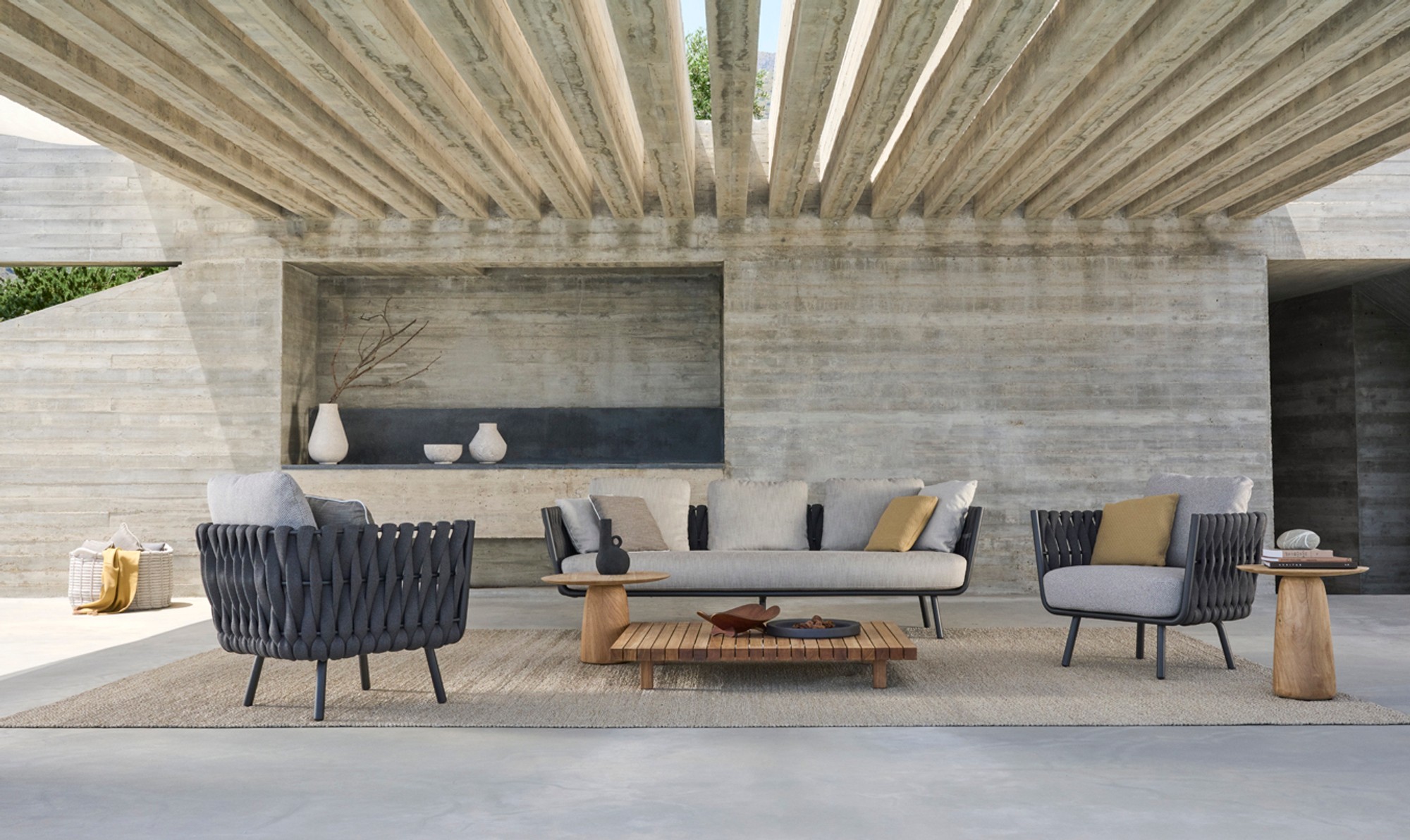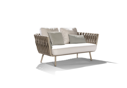 The Tosca outdoor sofa is simultaneously warm and inviting, stylish and intriguing. It was the first time TRIBù called upon a female designer to draw an outdoor furniture piece and that is evident in the design. Rounded forms, tapered legs and an elegant seating shell in powdercoated stainless steel, upholstered with extra-wide braiding. The material for the braiding is genuinely innovative : foam mousse is encased in a seamless sheath of knitted textilene and polyolefine which makes the material weather-resistant, but also surprisingly soft to the touch. The seating comfort is especially pleasant, thanks to the comfortable outdoor cushions.