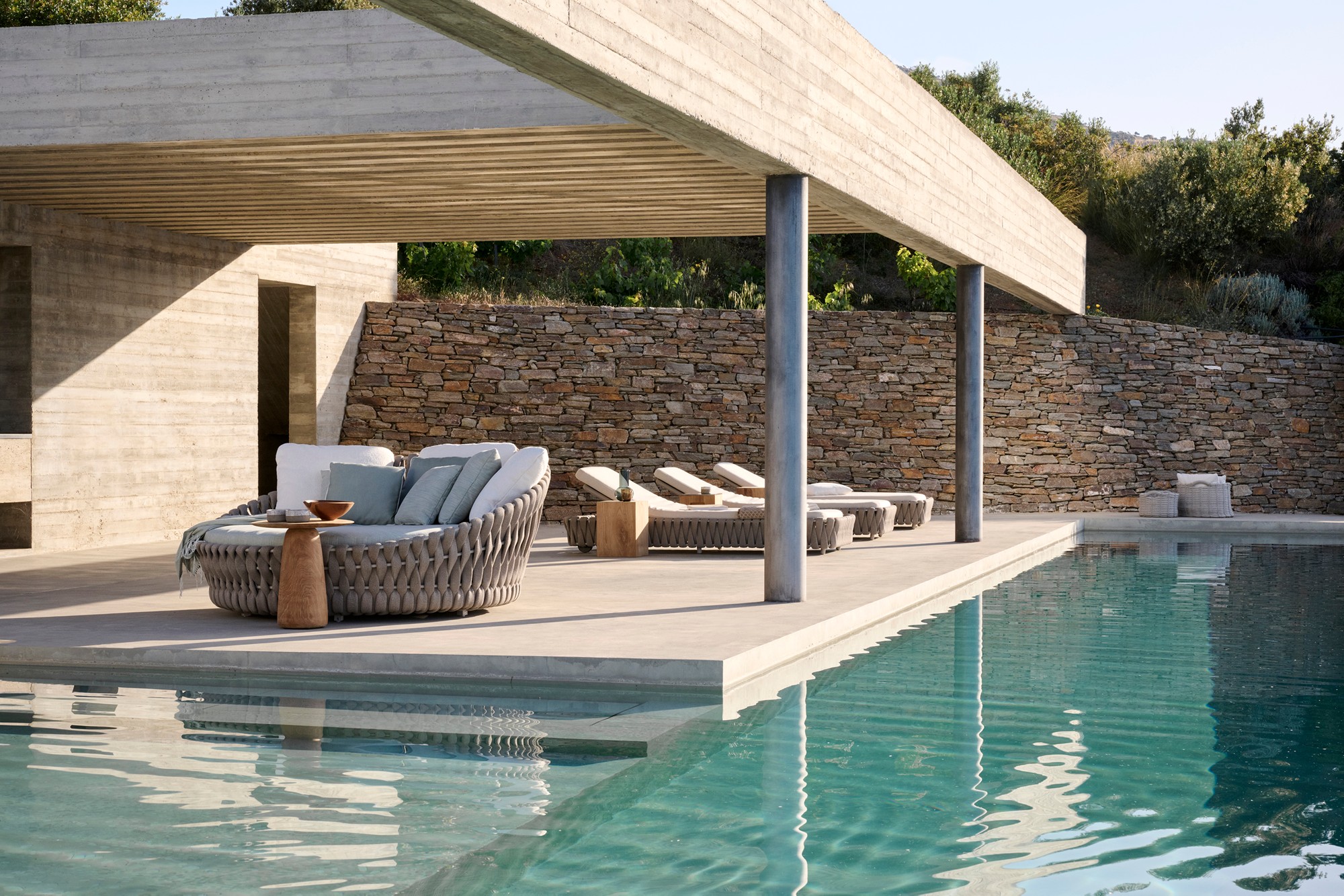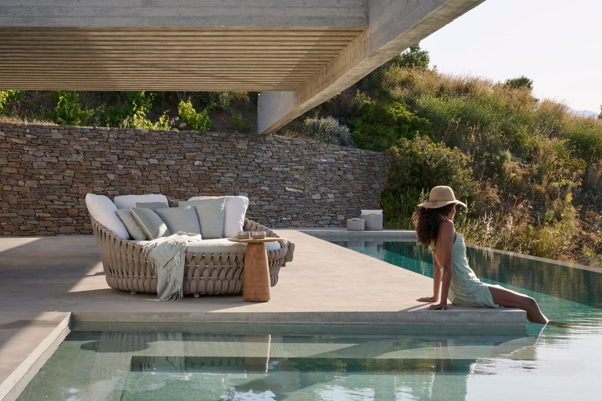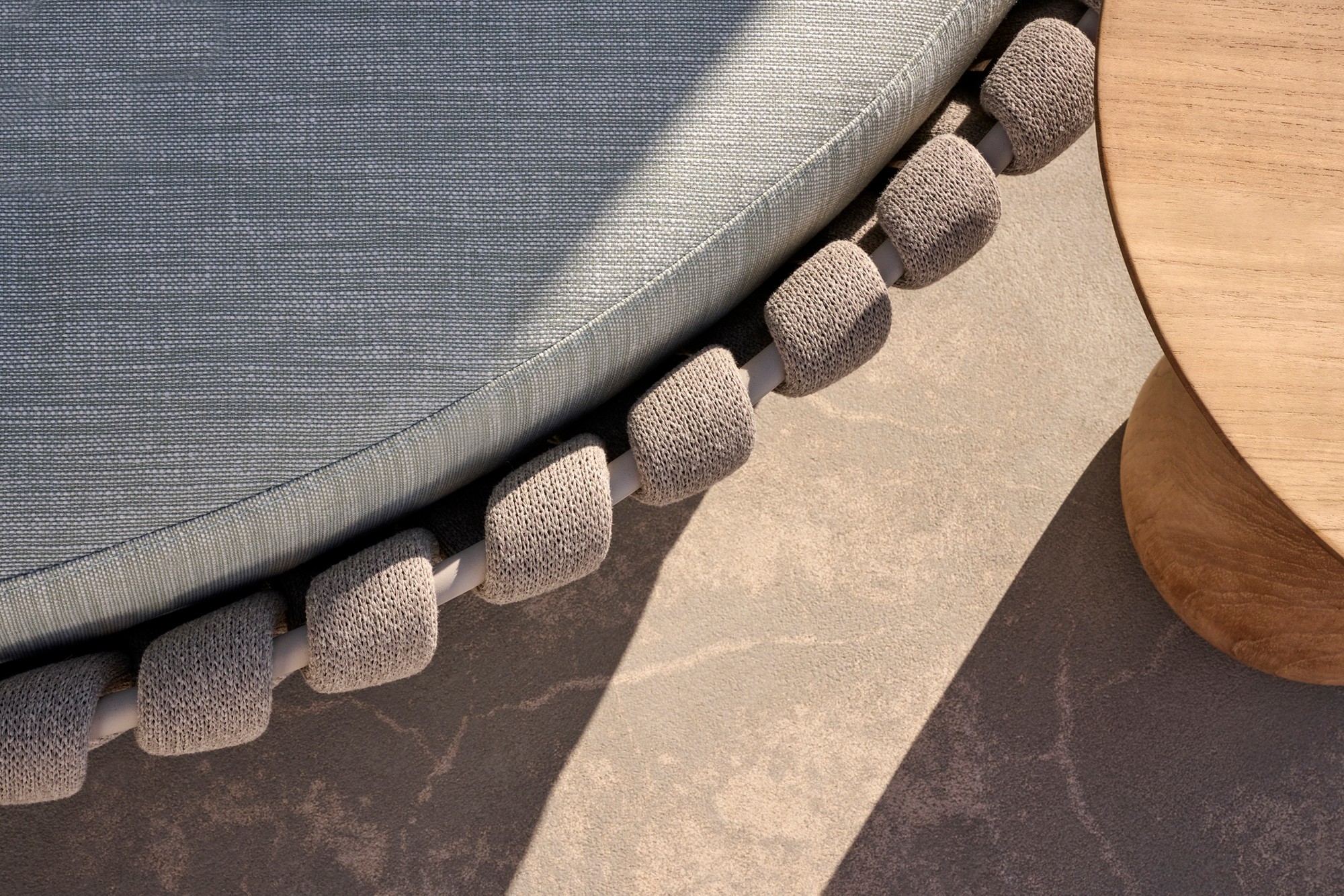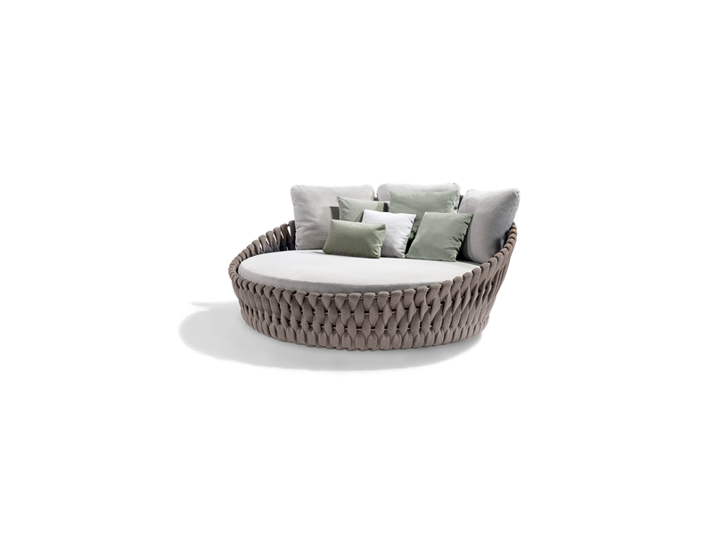 The Tosca outdoor collection is simultaneously warm and inviting, stylish and intriguing. It was the first time Tribù called upon a female designer to draw an outdoor furniture piece with a more feminine touch. Monica Armani succeeded in her challenge: rounded forms, tapered legs and an elegant seating shell in powdercoated stainless steel, upholstered with extra-wide braiding. The material for the braiding is genuinely innovative : foam mousse is encased in a seamless sheath of knitted textilene and polyolefine which makes the material weather-resistant, but also surprisingly soft to the touch. The Tosca daybed is the ideal setting to relax together, especially thanks to the comfortable outdoor cushions.