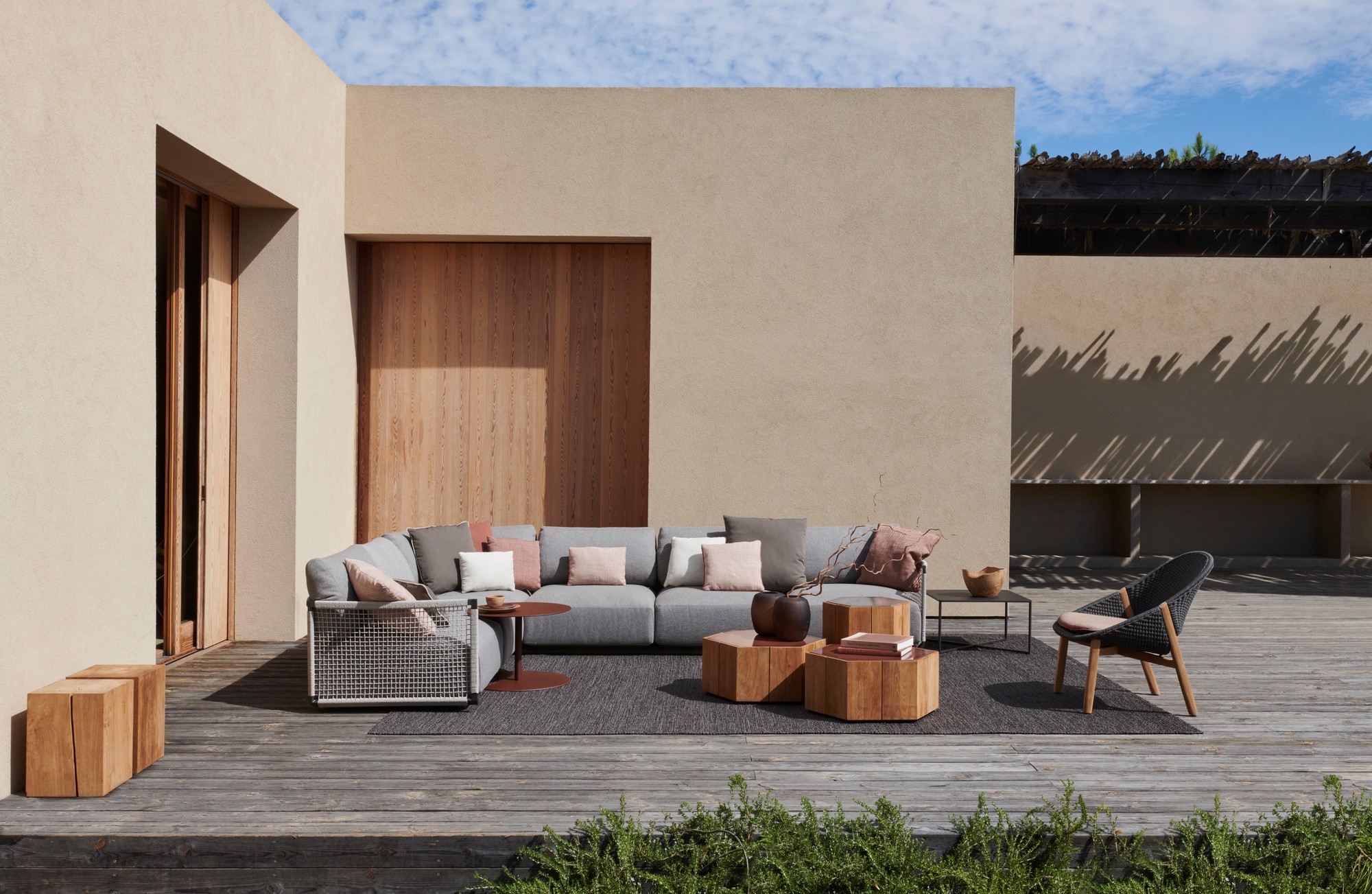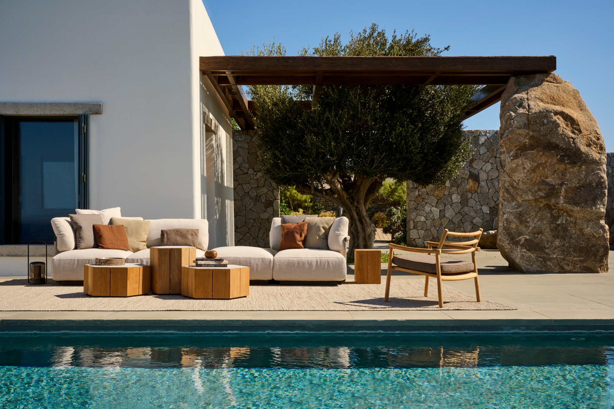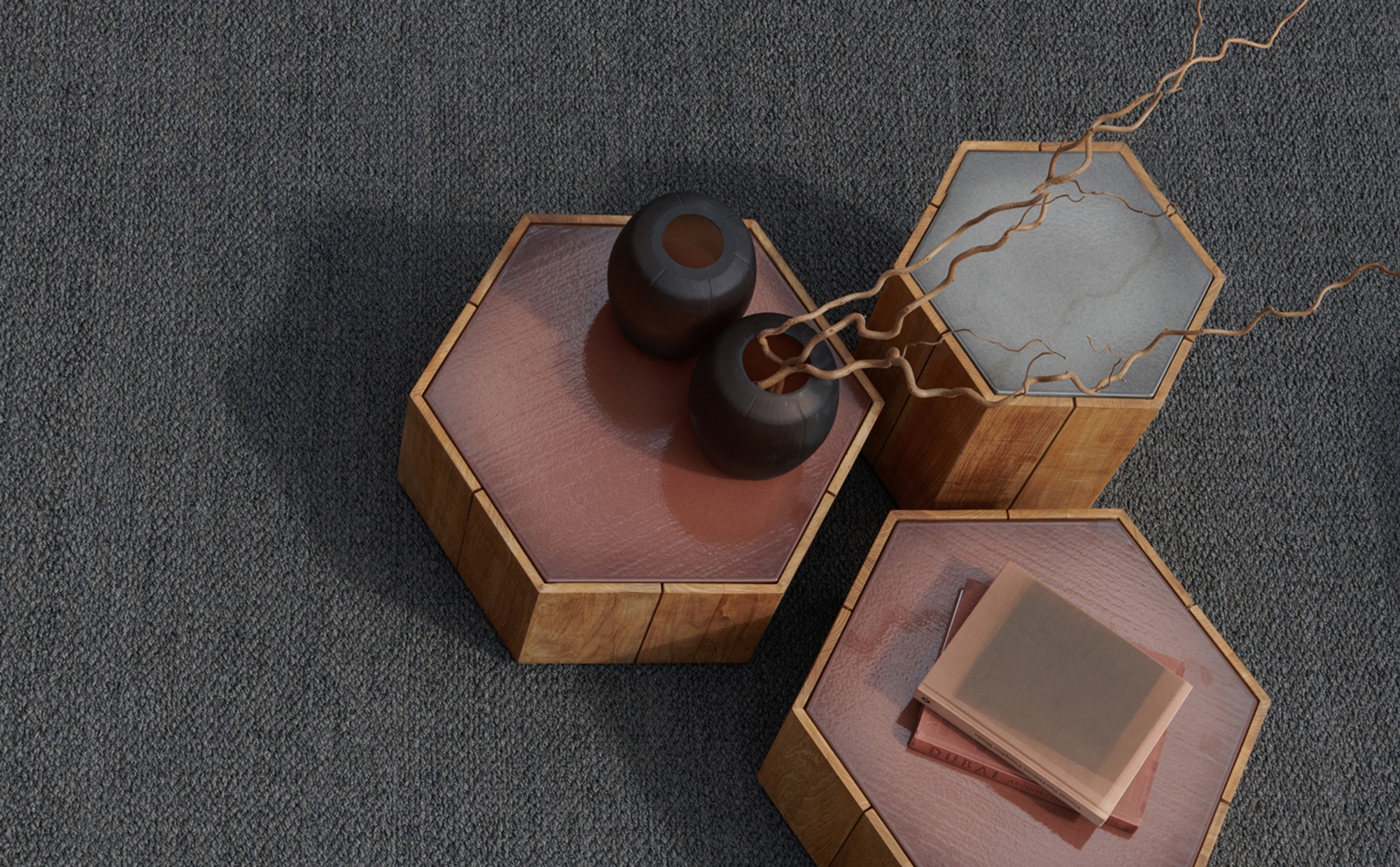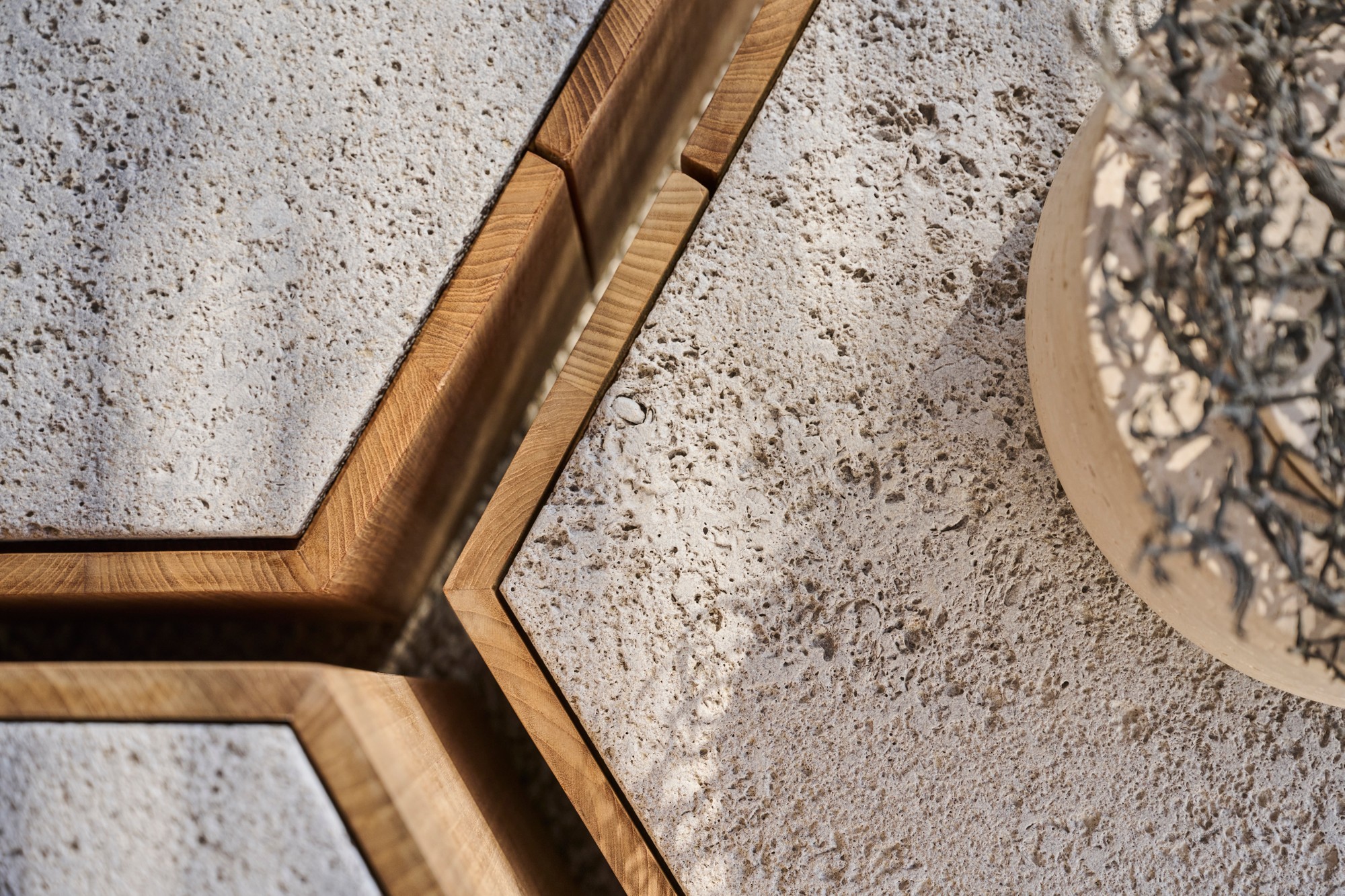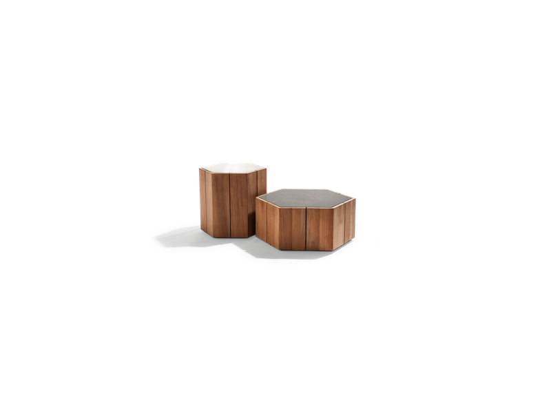 Marc Merckx's Hexagon tables prove that nature is an inexhaustible source of inspiration for new designs. The side tables' teak support refers to the hexagonal basalt pillars of the Giant's Causeway, a rock formation in Northern Ireland that has been declared a UNESCO World Heritage Site. Moreover, Merckx swears by sophisticated proportions, which is why the perfect symmetry of the honeycomb was his second source of inspiration. The Hexagon table top is made of handcrafted glazed lava stone with a subtle craquelure effect that highlights the natural imperfections in the stone. The coloured glaze, applied by hand, ensures that the top is water, heat, frost, UV, and stain-resistant. Hexagon is equally beautiful on its own as in a multiunit layout.