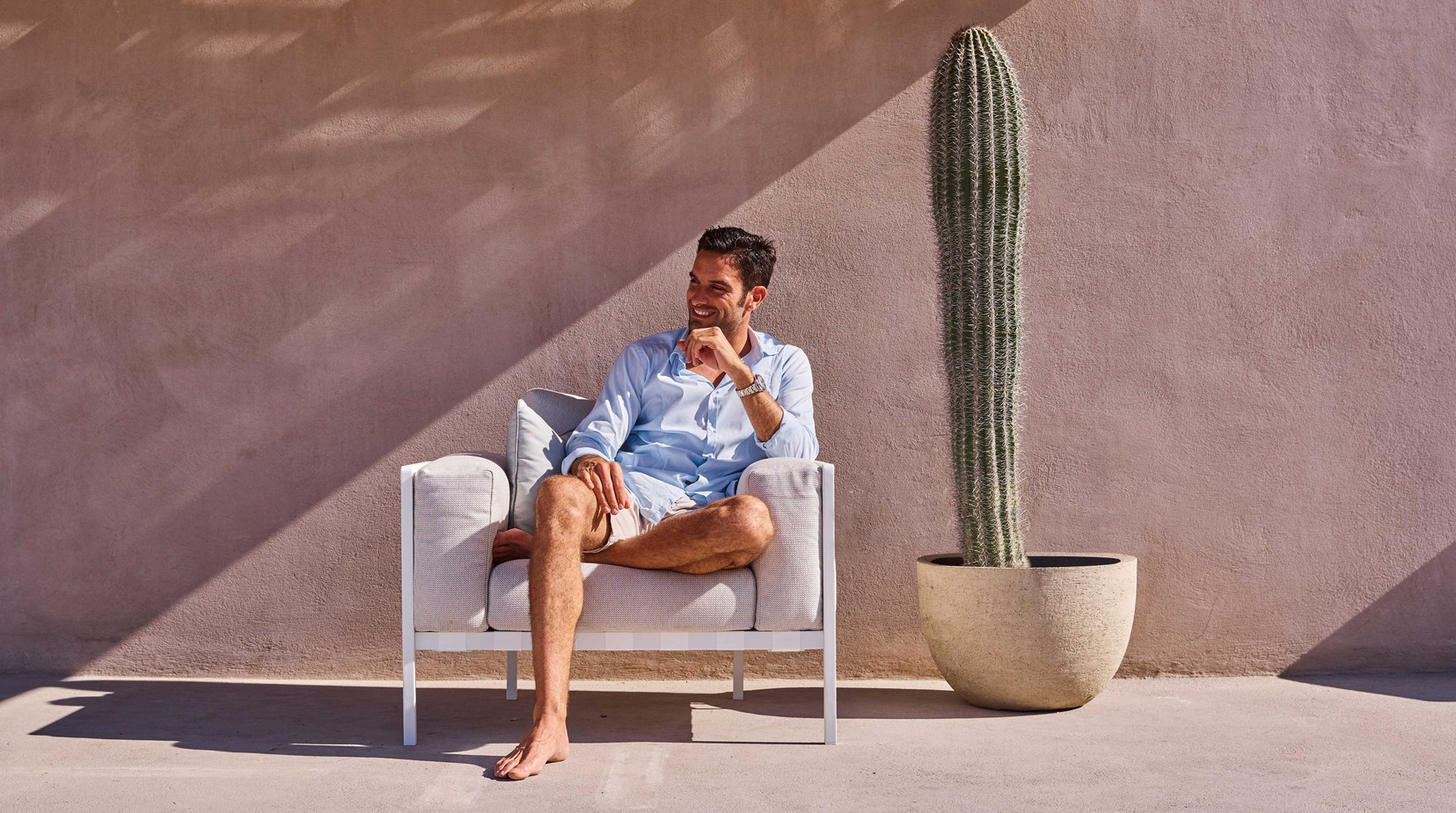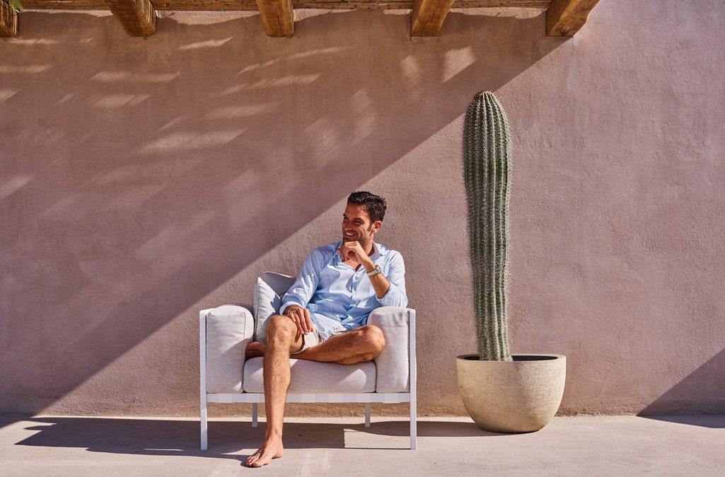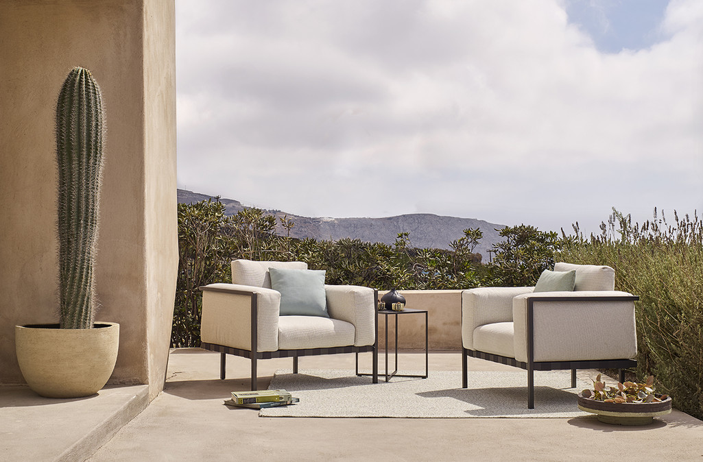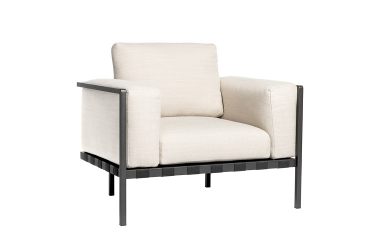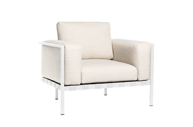 A subtle frame with curved armrests contrasts beautifully with the volume of the cushions, supported by a weave of wide textile straps. Timeless and elegant, the Natal Alu Sofa armchair looks great on any patio. The aluminium frame is powder coated with ultra-durable, UV- and scratch resistant textured lacquer which provides a beautiful matte look. Special attention has been paid to the outdoor cushions, which have a ventilating, water-repellent filling, so they can easily handle a sudden downpour. The seams have an extra inside cover and the thread used to stitch the seams, swells when wet to further prevent water from penetrating. With two different frame colours and over 100 luxurious outdoor fabrics to choose from, the possibilities are endless.