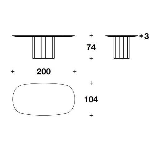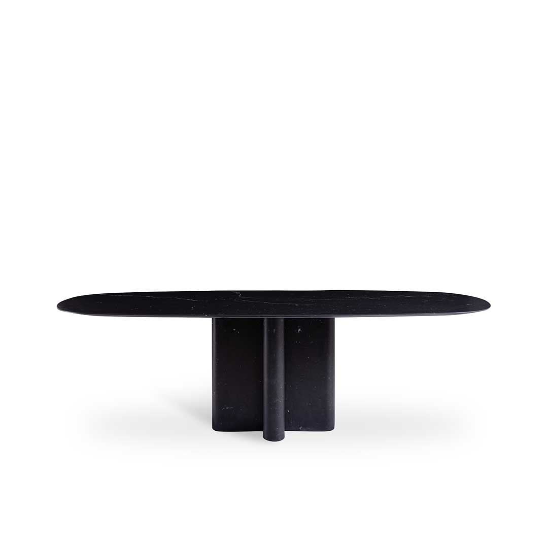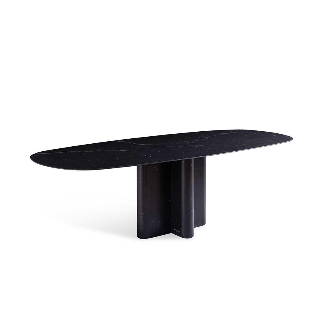 Andrej is a table with a sculptural presence, on which Elisa Ossino has introduced a highly prominent formal contrast between the volume of the base and the extremely thin top featuring a slightly rounded oval shape. The tension between the shape of the elliptical top and the solid mass of the base is echoed once again in the cross-plan base matched with workmanship that dramatically thins out the edges, making them resemble a leaf. Coordinated base and top in Marquina Black, Carrara White marble or Travertino Grey. Internal frame and under top in steel with matt black varnishing.