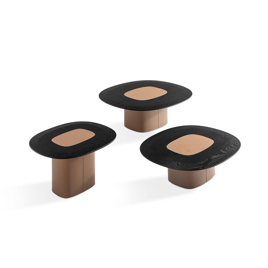The Disk coffee tables combine geometric shapes with a monochrome colour palette, producing a highly dynamic and almost futuristic visual effect. Crafted from natural materials like wood and leather, the tables are shaped and arranged like functional islands. Each product is made from a combination of wood, leather and marble, fusing together modern shapes and classic finishes.