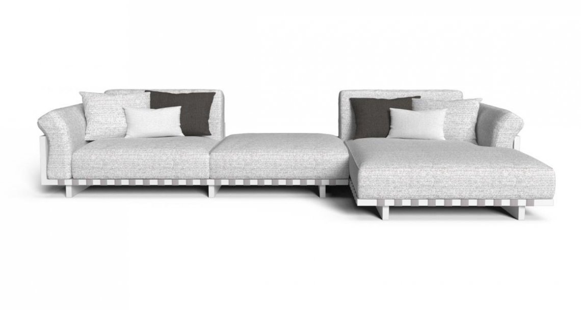 Cuscini sfoderabili realizzati in quick foam, tessuti di qualità attentamente selezionati e resistenti alle intemperie permettono al divano modulare di adattarsi a molteplici location all’aperto.
