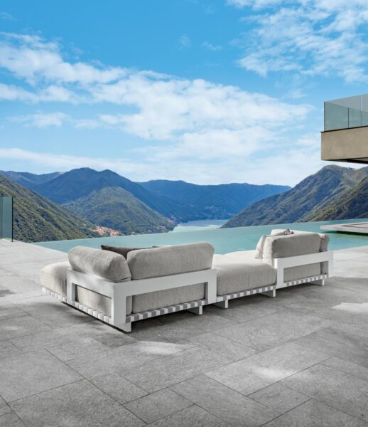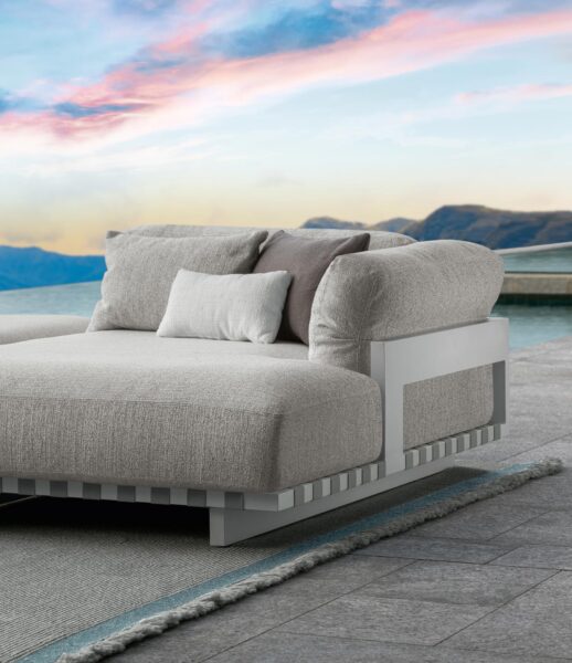 Le molteplici combinazioni che offre il divano modulare della collezione Argo Alu lo rendono il prodotto perfetto per creare il proprio living esterno. Ricerca estetica, libertà nella composizione, solida struttura in alluminio con cinghie a vista contrapposte a cuscini morbidi ed imbottiti, fanno di questo divano l’elemento d’arredo perfetto per passare momenti speciali di relax all’aria aperta.