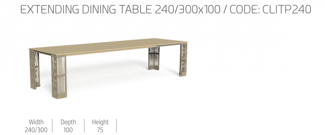 Il piano è sostenuto dalle gambe realizzate con l’intreccio di corde tipico della collezione che identifica stilisticamente questo elemento come Cliff.