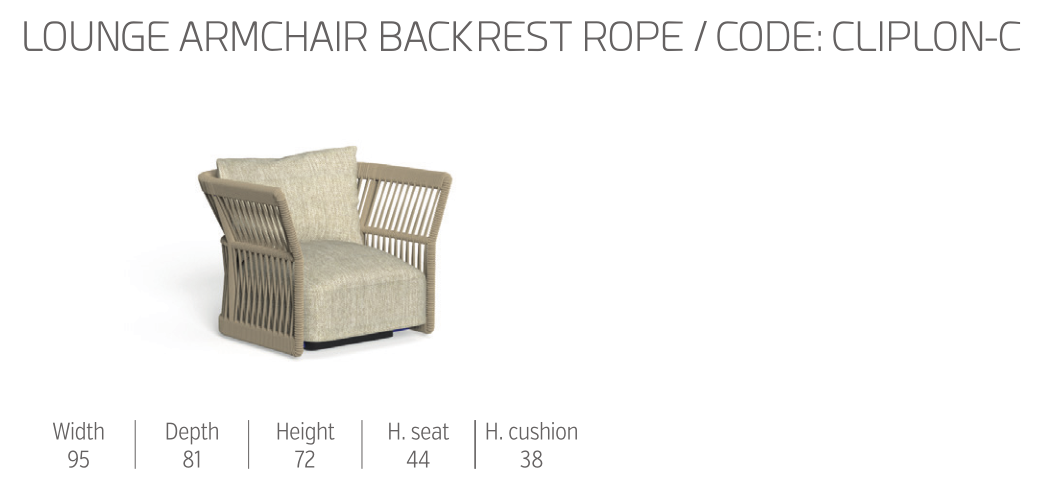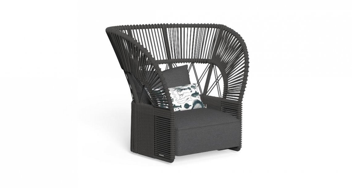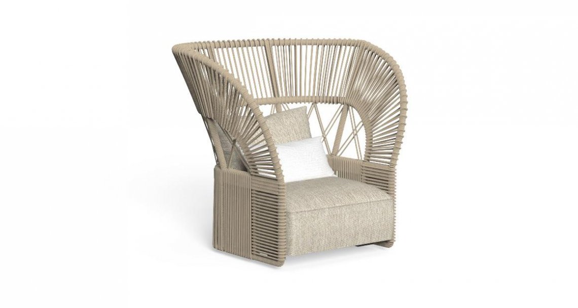 Morbida ed avvolgente, la Poltrona Lounge della collezione Cliff Dèco risulta imponente alla vista. L’ampio schienale, la cui struttura in alluminio è interamente rivestita di corda nautica sintetica, crea giochi di luce, grazie alle forme geometriche degli intrecci. La vivibilità in uno spazio esterno è garantita dai materiali utilizzati. La cuscineria in quick dry foam è infatti rivestita di tessuto, resistente agli agenti atmosferici.