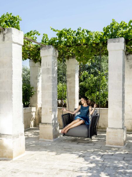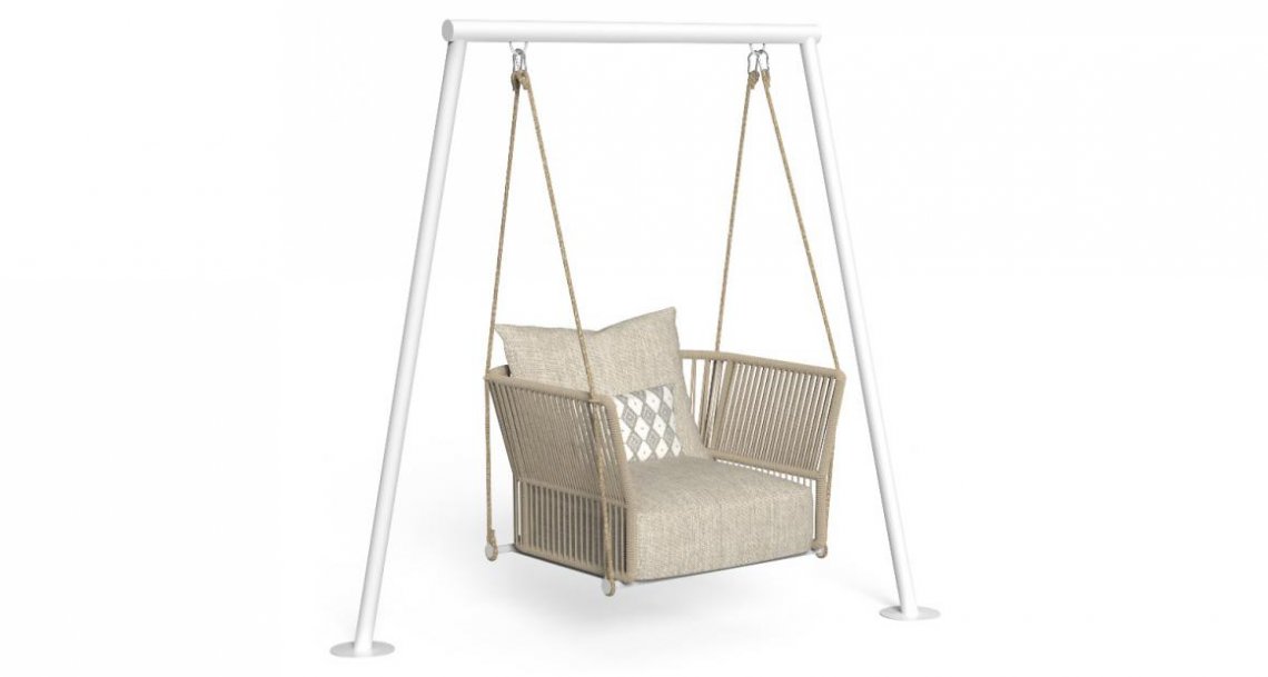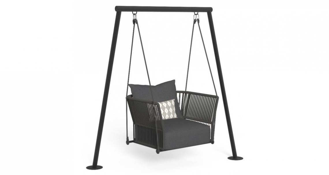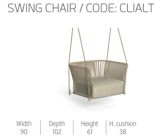 L’Altalena della collezione Cliff è ideale per personalizzare uno spazio da esterno. Gli elementi tipici della collezione, come l’uso della corda nautica sintetica per rivestire lo schienale ed i braccioli, si accompagnano alla forma nuova del prodotto. L’Altalena, sostenuta nel suo movimento da corde agganciate fin dalla base, mantiene la sicurezza dell’alluminio, usato per la struttura, assieme alla comodità della seduta, realizzata in quick dry foam e rivestita di tessuto resistente agli agenti atmosferici.