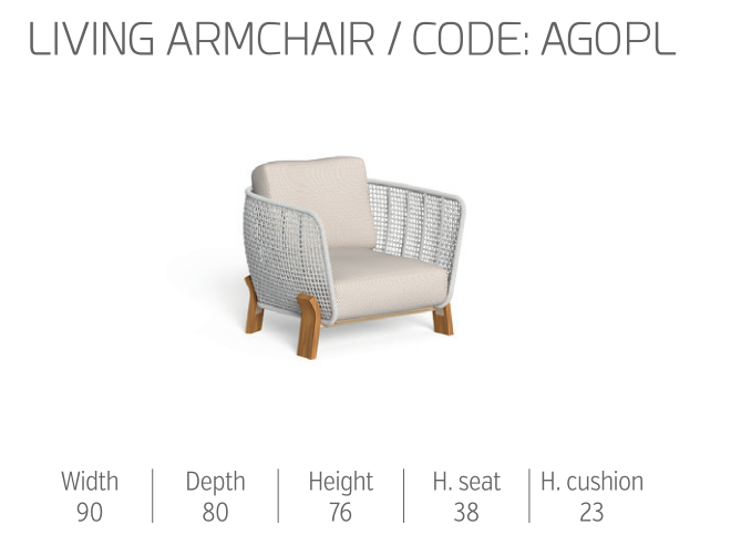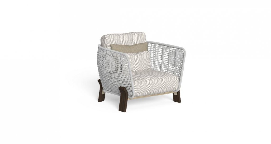 La Poltrona Living della collezione Argo è la scelta giusta per creare combinazioni eleganti e naturali nel proprio spazio outdoor. La cuscinatura della seduta, caratterizzata da volumi abbondanti e scultorei, è valorizzata dalla texture corposa e consistente dei filati impiegati e si coniuga completamente con l’intrecciato dello schienale e dei braccioli realizzati con corde sintetiche a doppia treccia.