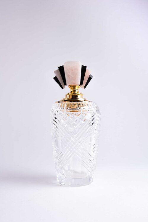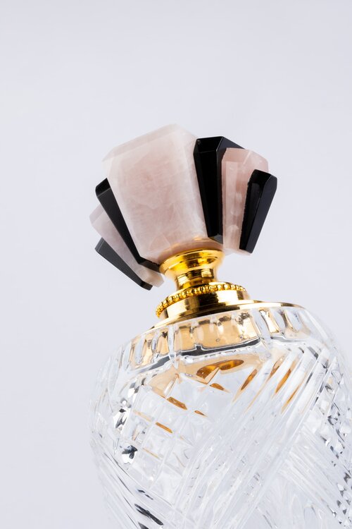The diamond’s brightness of the french cut crystal exalts the deep color and grain of the stone. A jewel detail that embellishes the perfume bottle in a perfectly Art Decò style and yet with a contemporary design. Each crystal is hand-cut and therefore unique.