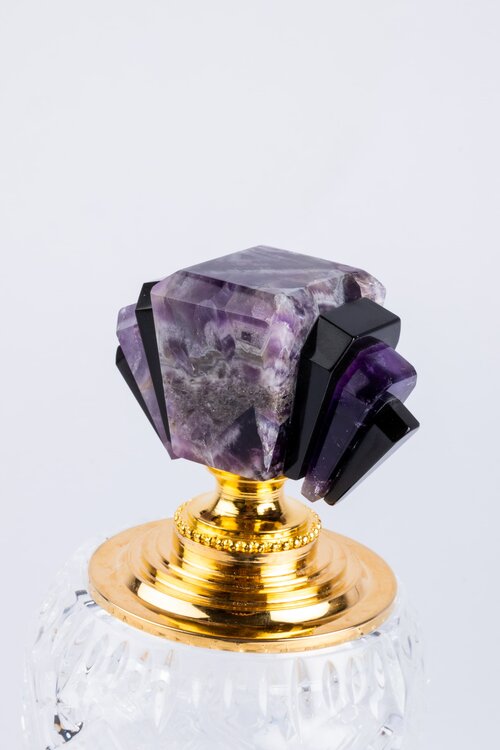 The diamond’s brightness of the french cut crystal exalts the deep color and grain of the stone. A jewel detail that embellishes the perfume bottle in a perfectly Art Decò style and yet with a contemporary design. Each crystal is hand-cut and therefore unique.