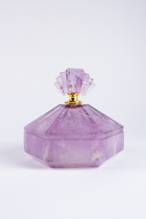 The diamond’s brightness of extra clear amethyst. A jewel detail that embellishes this hexagonal shaped casket box in a perfectly Art Decò style and yet with a contemporary design. Each piece is hand-cut and therefore unique. Available in three sizes.