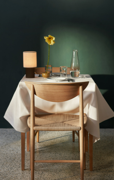 Veneer sheets formpressed together towards a solid wood insert. Milled into shape and lacquered. Natural Rattan weaved around a powder coated stainless steel frame.