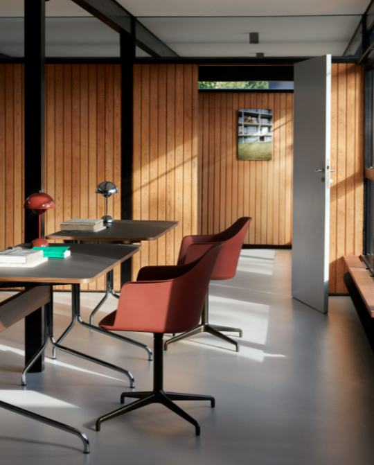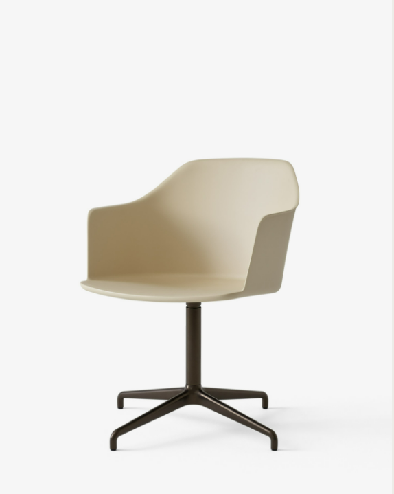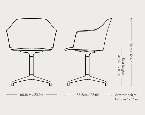 Veneer sheets formpressed together towards a solid wood insert. Milled into shape and lacquered. Natural Rattan weaved around a powder coated stainless steel frame.