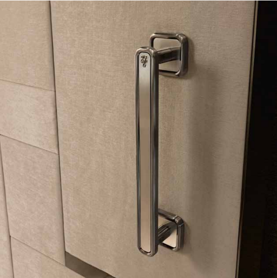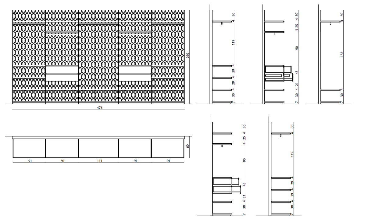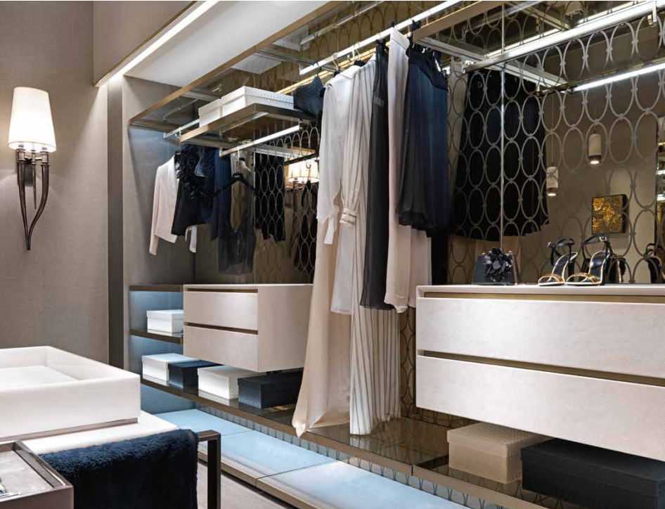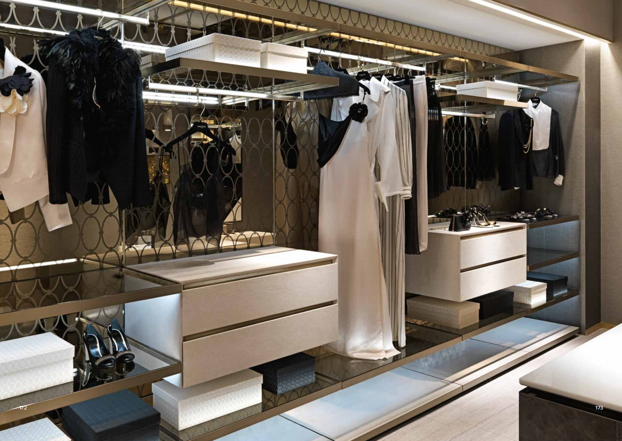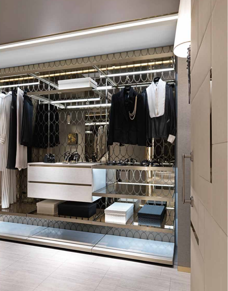 Modular wall system, made of modules by 90 and 110 cm h. 260 cm. Wall carrier panel in MDF covered in bronze mirror glass, decorated with metallized gold lacquer “ovals” graphic. Accessories available: - shelf (90/110 x 52 cm) in smoked glass with profile in satinized stainless steel and internal LED lighting; - shelf (90/110 x 52 cm) in smoked glass with profile in satinized stainless steel with clothing bar and internal LED lighting; - 2-drawer unit (90/110 x 52 h. 45) covered in leather or fabric with handles in satinized stainless steel, including 1 internal drawer; - 1-drawer unit (90/110 x 52 h. 22 cm) covered in leather or fabric with handle in satinized stainless steel; - trouser rails (90/110 x 52 h. 22 cm) covered in leather or fabric with 1 drawer and handle in satinized stainless steel; - base shelf (predisposed for ground laying) in MDF covered in leather or fabric with border in satinized stainless steel. Metal parts available in the metal finishing selection.