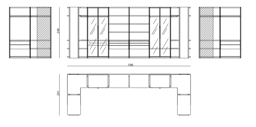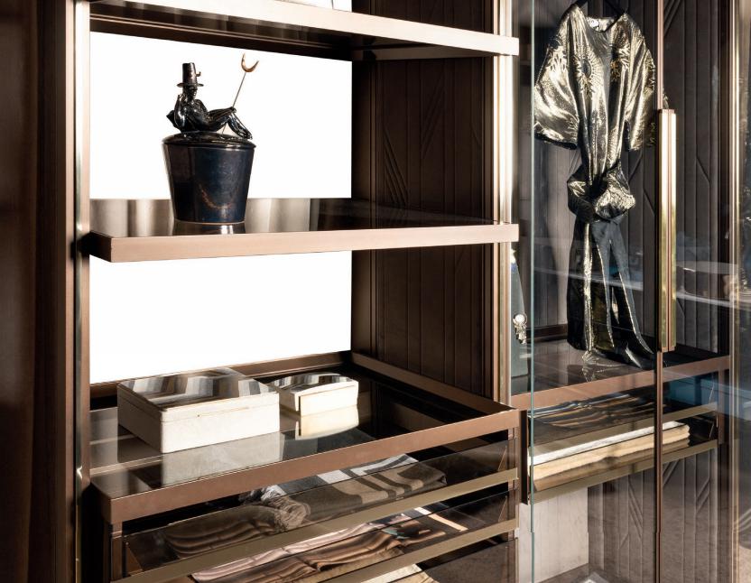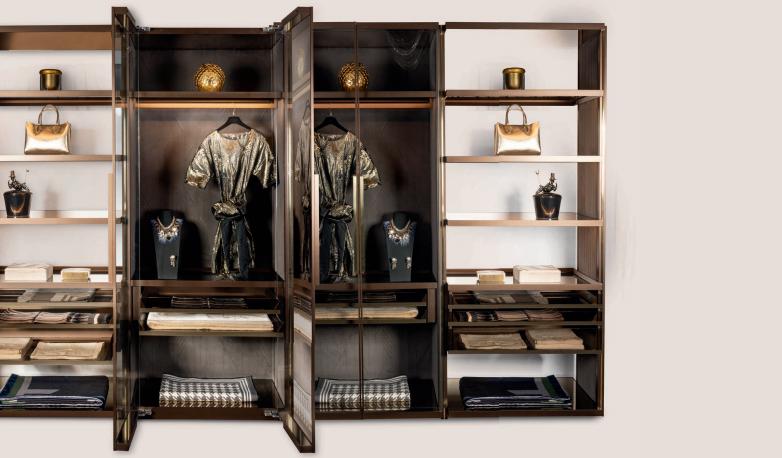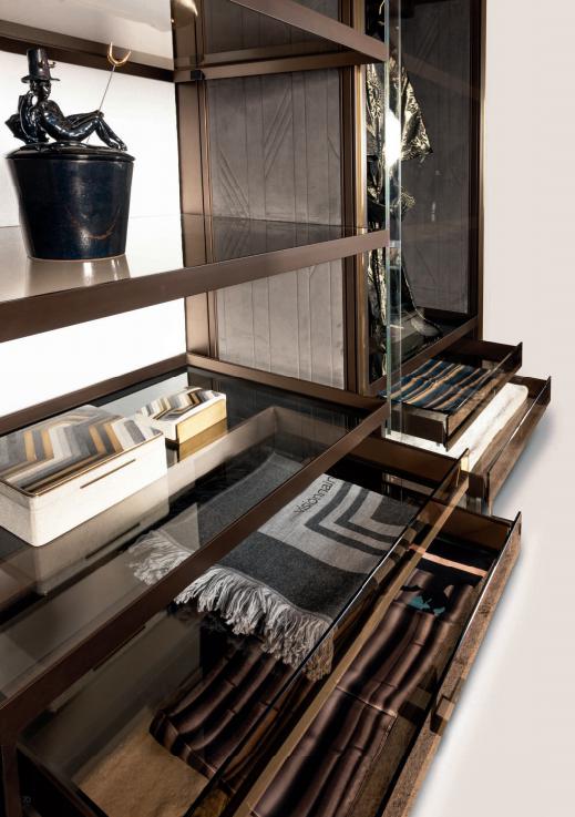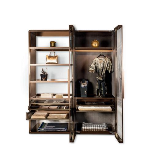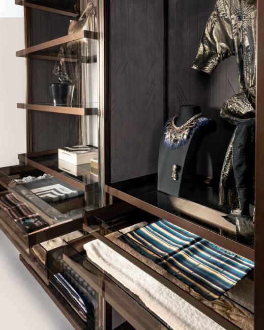 Modular walk-in-closet composition in aluminium and glass. Supporting lateral sides consisting of a double pillar made in powder-coated aluminium with a shiny decorative profile, and lateral panels upholstered in leather or fabric, or coated in veneered wood, marble or decorative laminate. Pillars supplied with electrified track for LED light and hidden predrilled hole, to adjust the height of the shelves. Shelves in aluminium with crystal glass surface and profile with LED light, and equipped with plug & play technology to move shelves without using tools. Clothes racks can be mounted under the shelves. Chests of drawers and pants racks with wooden and aluminium structure, front panels upholstered in leather or fabric, or covered with black glass, top in smoked crystal glass. The modular composition consists of open units with or without back (available either in leather or fabric upholstery, veneered wood or decorative laminate). Modular units can be configured with doors in boxed tempered crystal glass (width 8 mm) with aluminium handles with polished finish or leather upholstery. The modularity of the system allows to include corner elements for customized compositions.