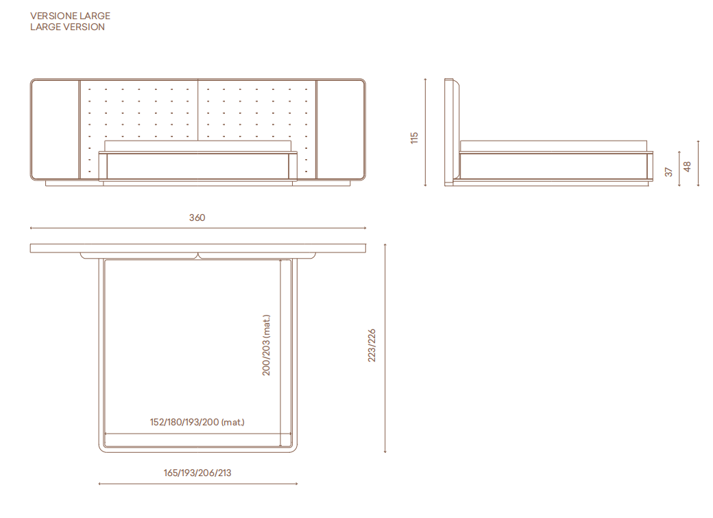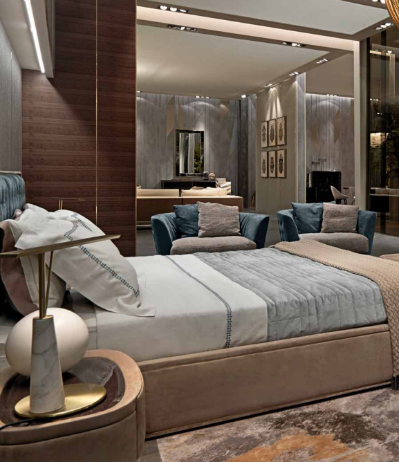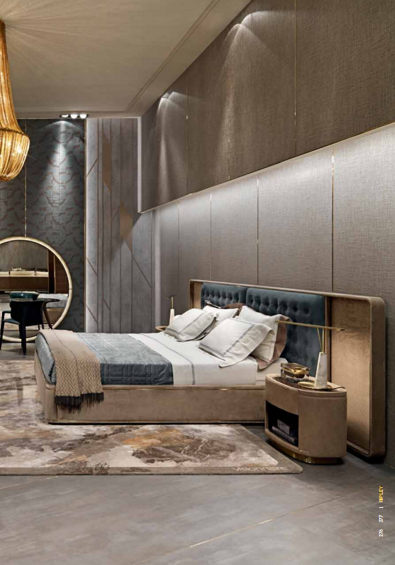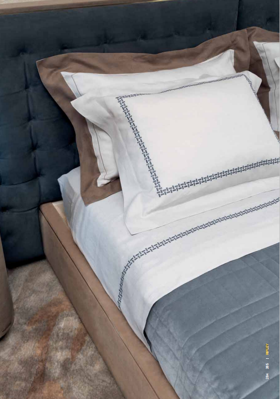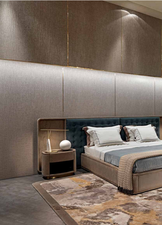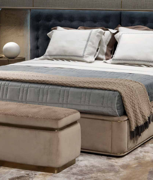 Upholstered bed with quilted headboard in leather or fabric, framed by a wooden profifile covered in leather or fabric with a brass profifile. Headboard sides embedded in the frame covered in leather or woven, slightly padded. Available with LED courtesy light on the sides of the head with touch switches. Sommier in leather or fabric inlaid with brass profifiles around the bed frame. Internal structure in solid and multilayer wood, solid wood slatted base. Height adjustable slats/mattress supports.