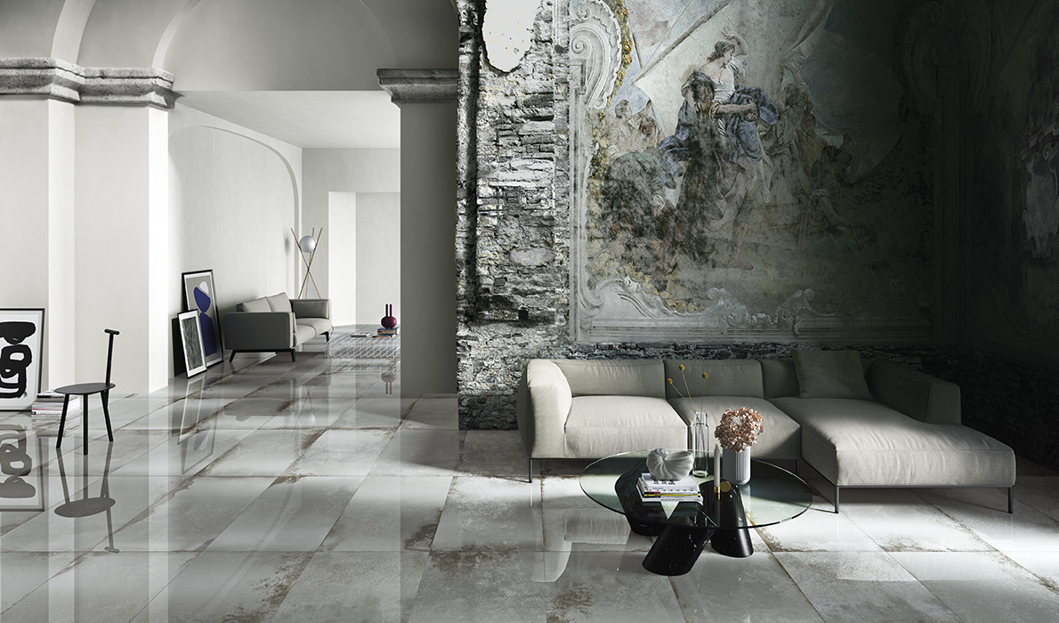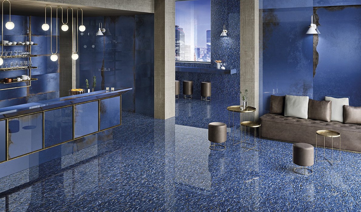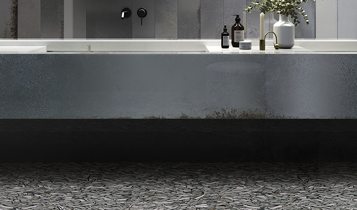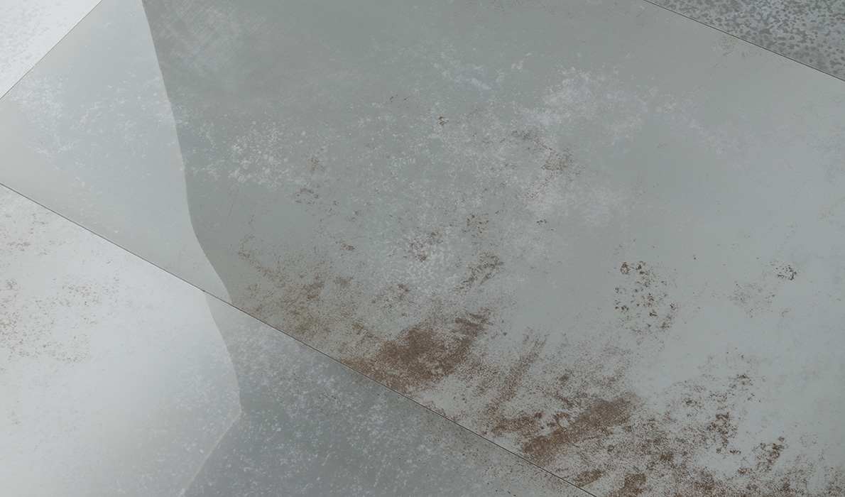 Narciso is an original collection inspired by the surfaces of antique mirrors, oxidized by atmospheric agents and dulled by the passage of time. Every detail is emphasized by the gloss semi-polished and matt semi-polished finishes, which produce original aesthetic and tactile effects. Available in four colours – Perla, Argento, Topazio and Zaffiro –, the collection is ideal for public and private areas with a striking visual impact.
