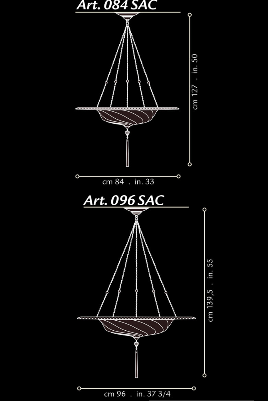 This lamp is ideal for large, sophisticated interiors. The light filters through the silk and penetrates the inlay of the decorative ring to create an evocative atmosphere.