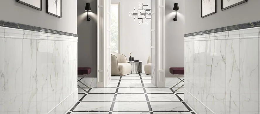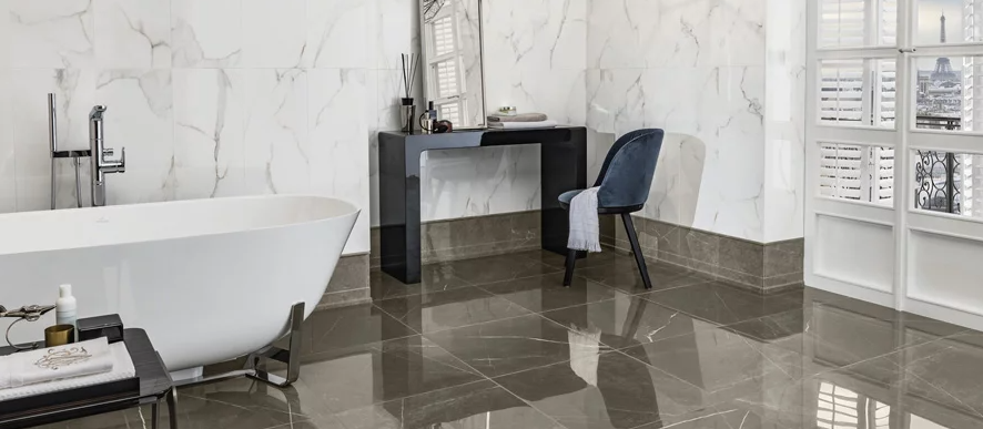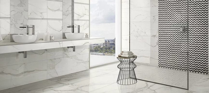 The authentic nonvitreous and glazed vilbostone porcelain stoneware wall and floor tiles recall the glory of old Venetian palazzos – but in the form of a modern forward-looking European style.