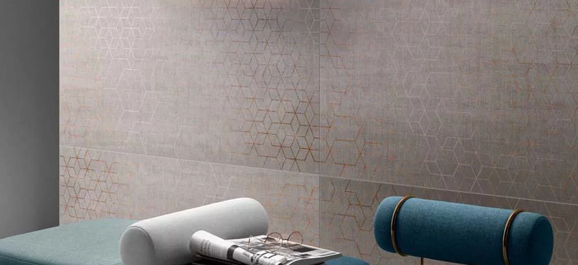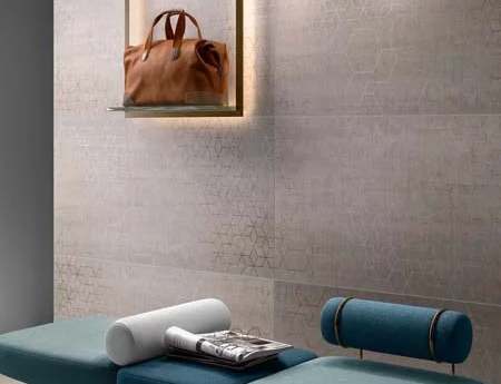 The highlight of METALYN is the multicoloured décor tile made of glazed vilbostone porcelain stoneware, which can be laid as a strip, as an accent or for full-surface installation. The sophisticated geometric pattern of fine, rust-coloured diamonds and cubes possesses a surprising trompe-l'oeil effect that presents each viewer with different and ever-new, three-dimensional shapes, depending on the incidence of light, the point of view and the mood.