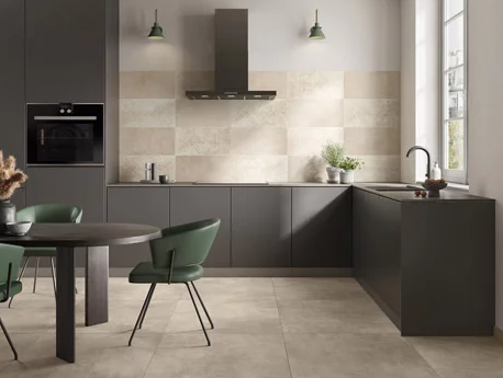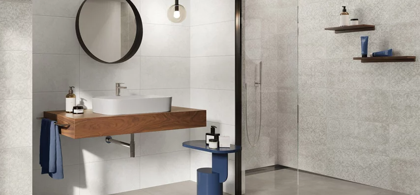 The PURE BASE wall tiles render the slightly cloudy concrete design a touch more subtly in light colours. Décor tiles in glazed porcelain stoneware are a special highlight, interpreting the historically inspired tile pattern in a patchwork variant which is underscored by a discreet used look.