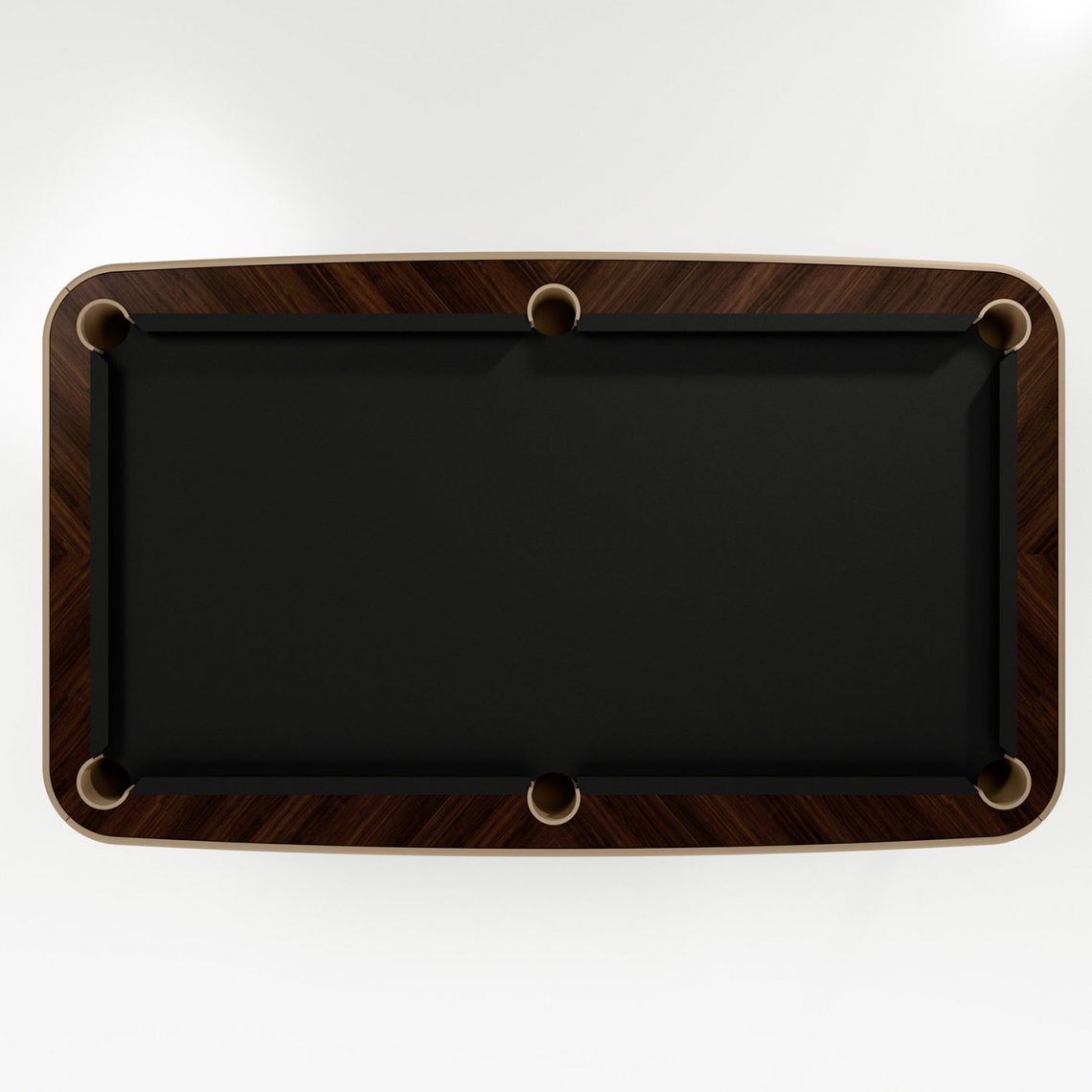 A new design by Vismara, this splendid pool table boasts clean and essential lines of contemporary flair.? Crafted of refined materials, ?it features a practical top in slate covered with a cloth made by leading company Simonis.? Resting on a fine leather-upholstered structure, the top sides of the table are exquisitely fashioned of Canaletto walnut. This piece is ideally paired to the Bobo Cue Rack.