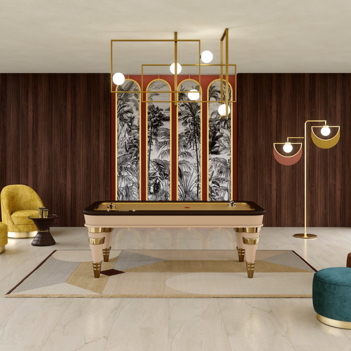 This air hockey table will be a wonderful addition to a private game room. Constructed of MDF, the frame is embellished with leather-upholstered edges, and a leather upholstery combined to gold-plated steel details enriching the wooden legs. The metal laminate playing field boasts small practical holes that guarantee the air backflow and is equipped with an engine that helps the disk to easily slide on the surface.? The piece is customizable in leather colors and finishes upon request to the Concierge.