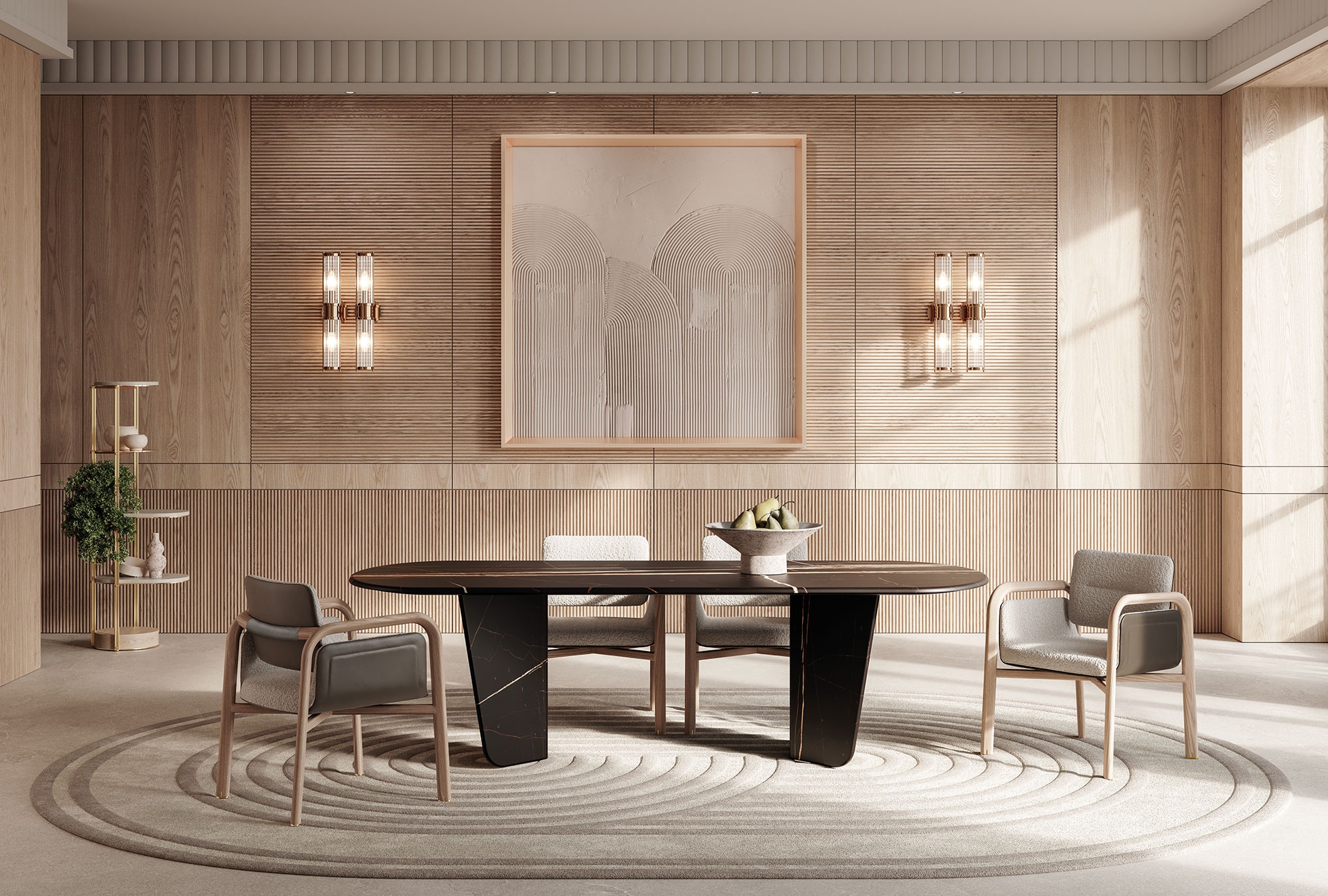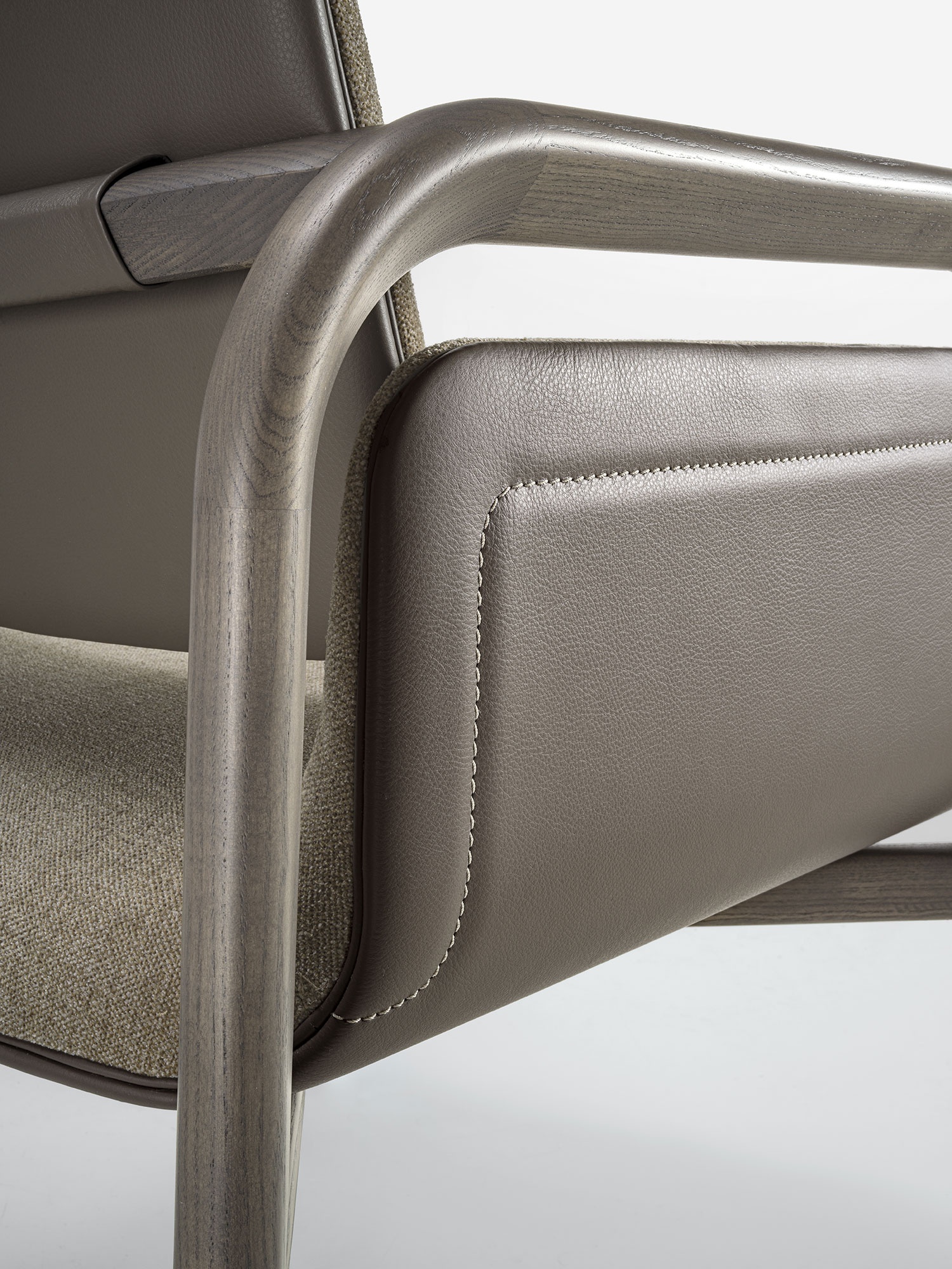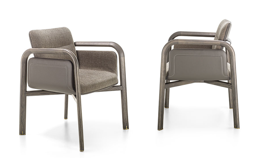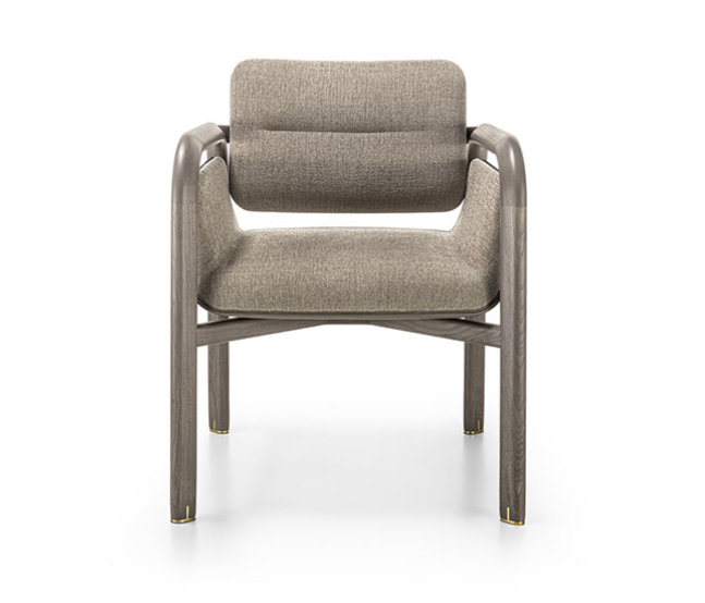 La sedia con braccioli Grace, design di Andrea Bonini, racchiude nel suo nome le preziose proporzioni della struttura in legno: le gambe in legno confluiscono nei braccioli per una silhouette ininterrotta ed un delicato fusto aereo. La continuità del design è esaltata dalla seduta imbottita e dalla parte esterna della scocca dei braccioli, finemente rifinita da un ricamo in rilievo. I dettagli metallici sono un ulteriore tocco di pregio.  Grace è una sedia da pranzo accogliente e delicata che offre un design raffinato e il massimo comfort.