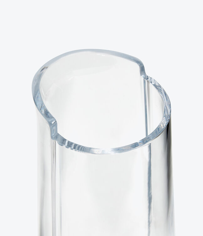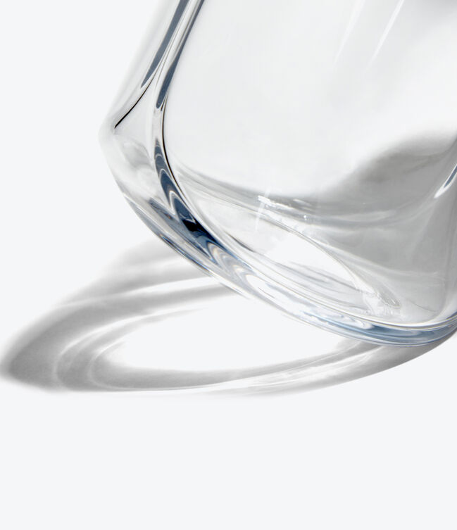 HEW Carafe, polished blown glass - subtle indentations carve the surface - creating channels that extend and widen from the rim to merge seamlessly.