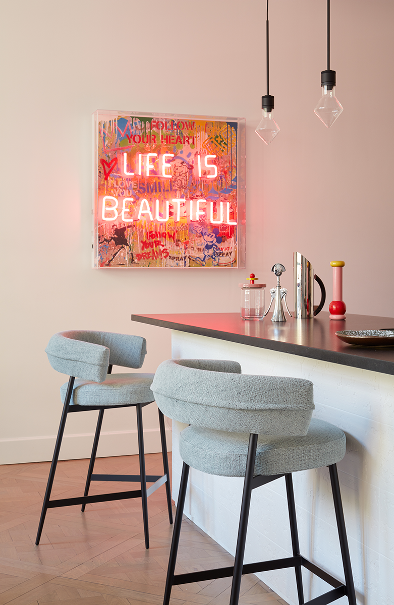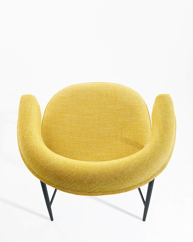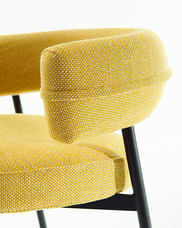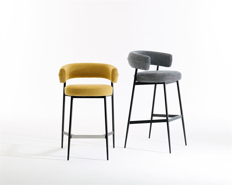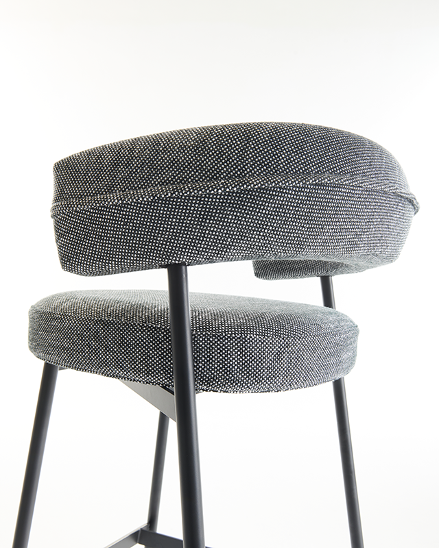 凳子。石墨黑或啞光黑色漆面鋼架機構(gòu)。坐墊填充漸變聚氨酯,靠背填充自熄性聚氨酯泡沫??刹鹦恫剂匣蚱じ镒o套。覆面擱腳采用緞面不銹鋼制成。