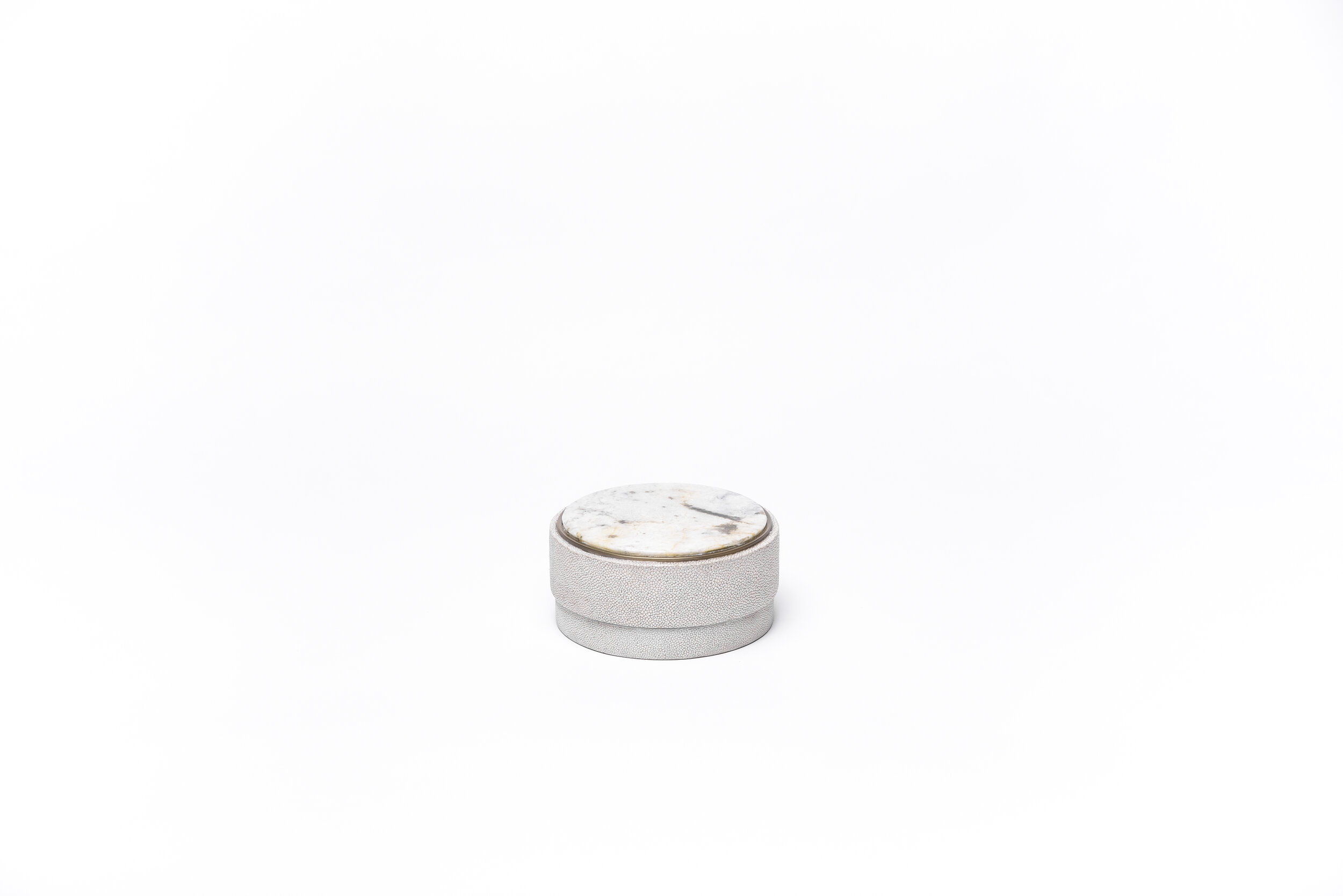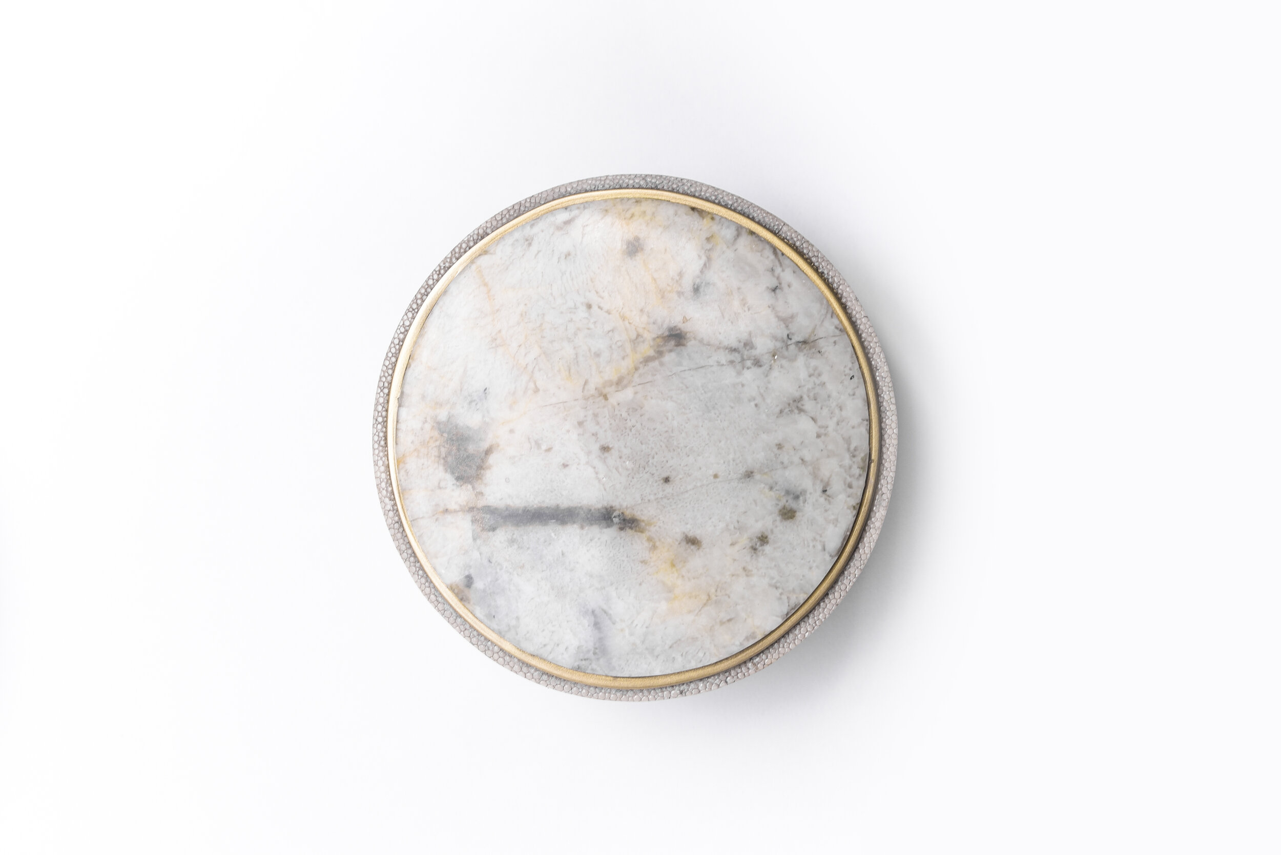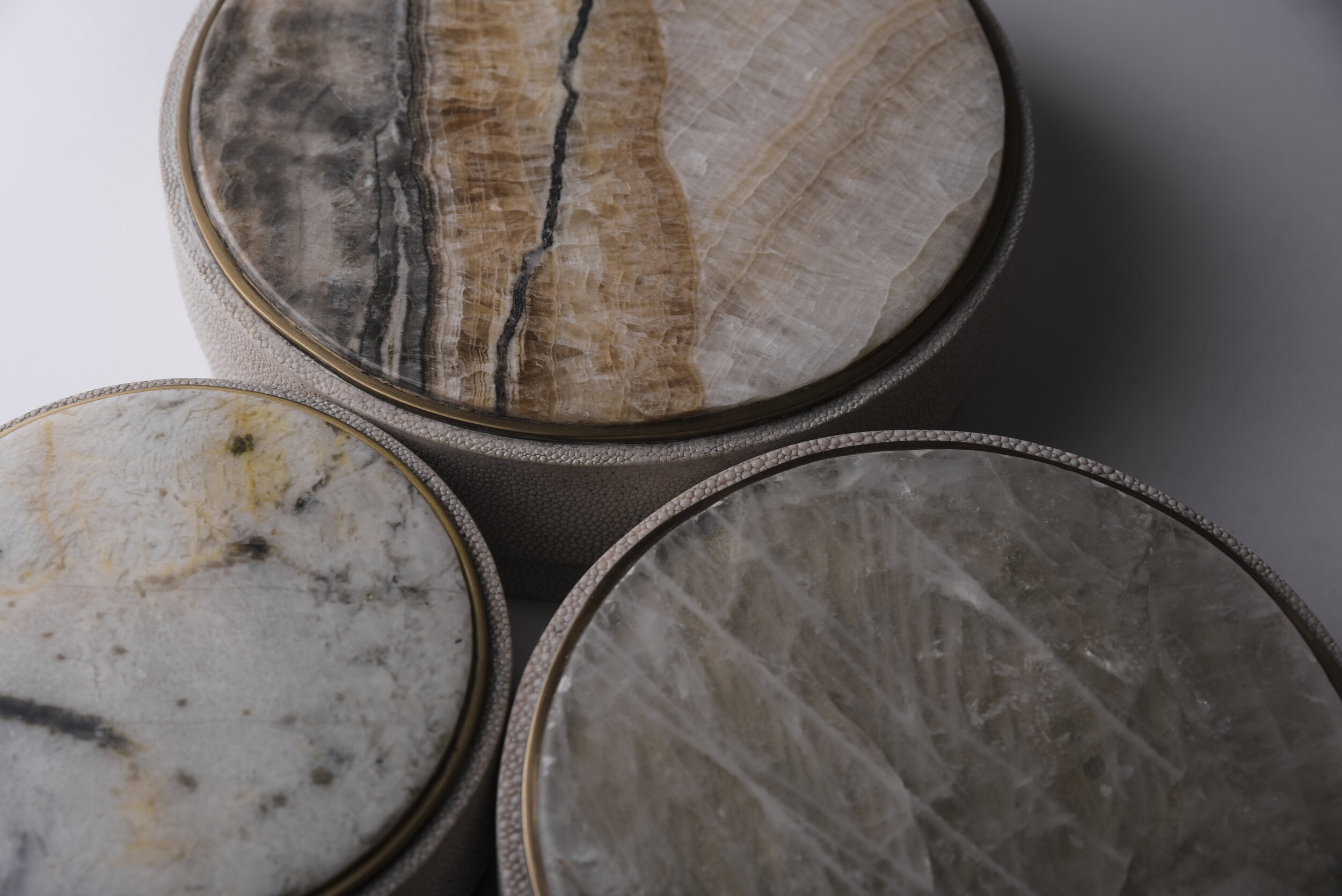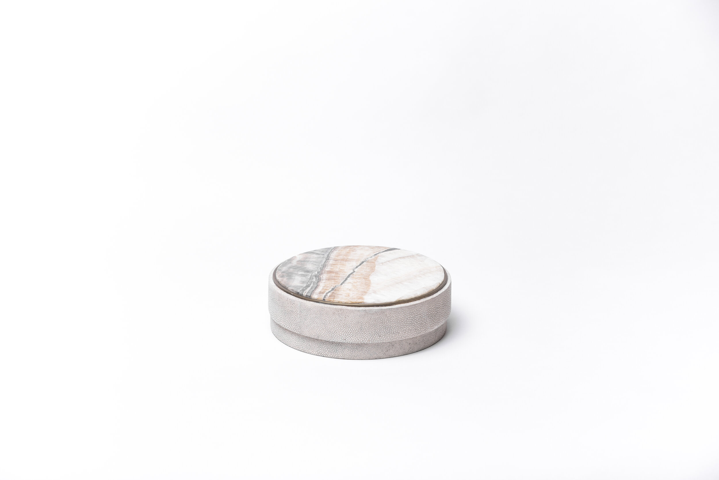 This classic box is a luxurious update to the everyday staple accent. These boxes are inlaid on the top with different semi-precious stones: Patagonia, Smokey White Quartz and Onyx. The piece is finished off on the side with antique natural shagreen and framed with a discreet metal indentation.