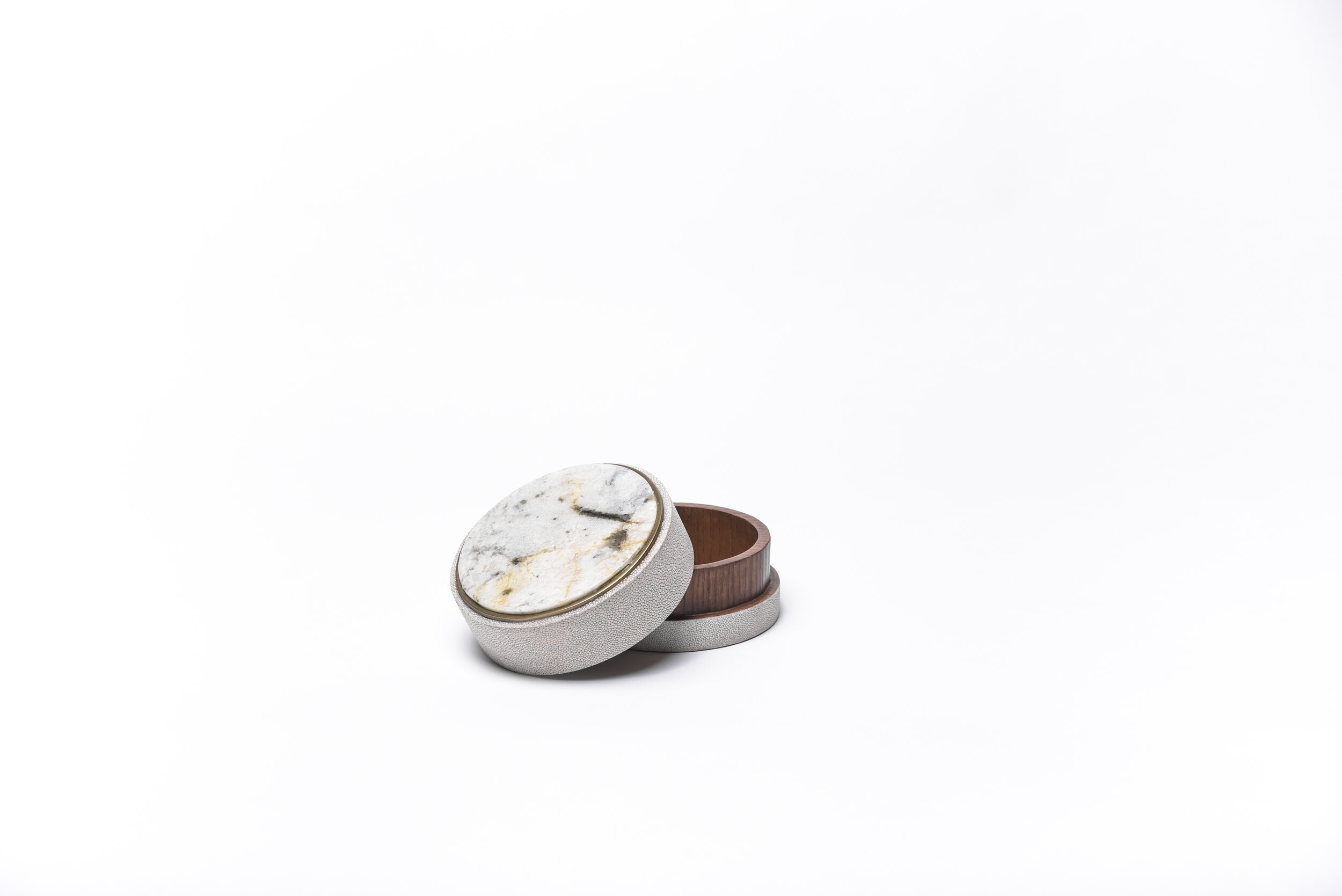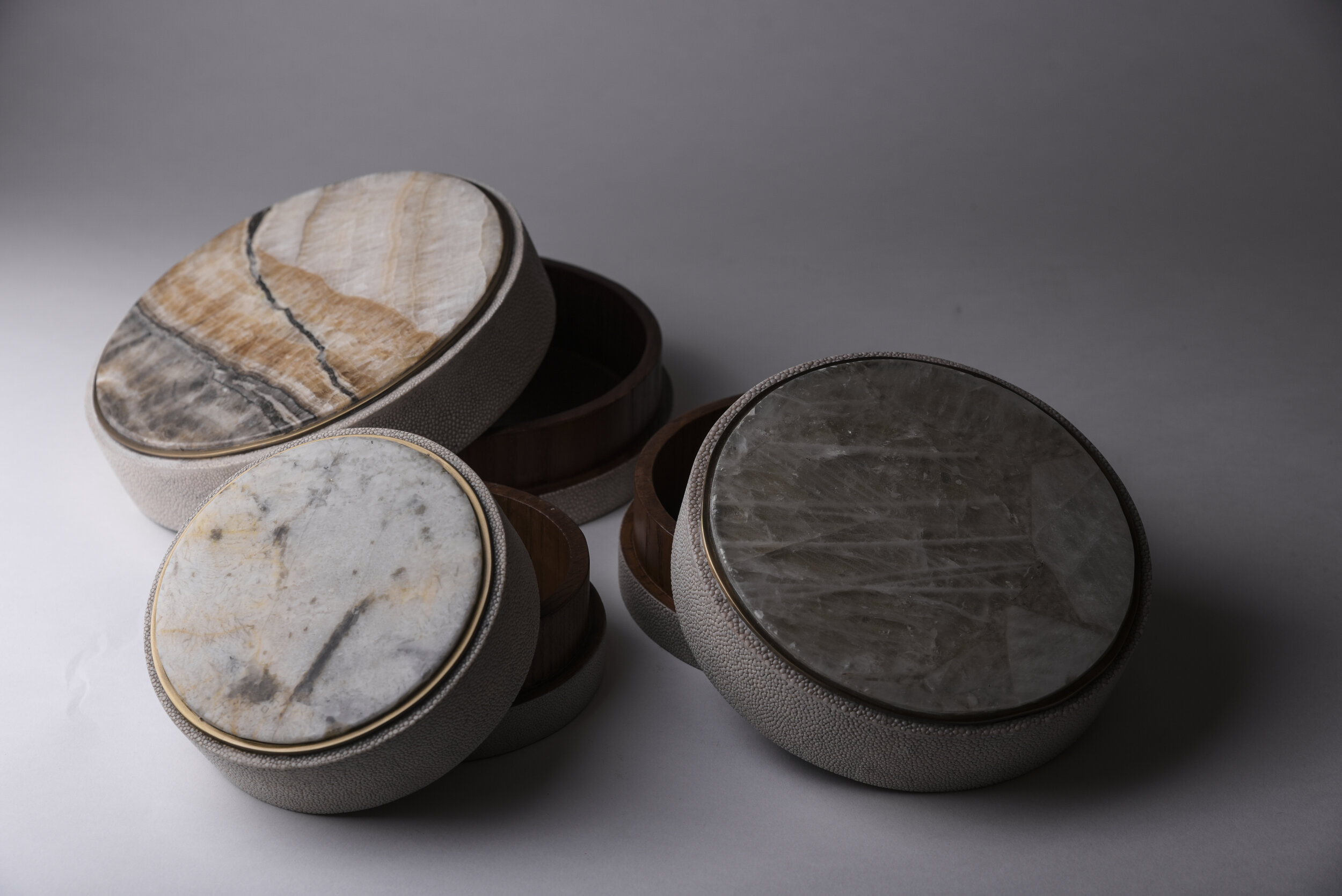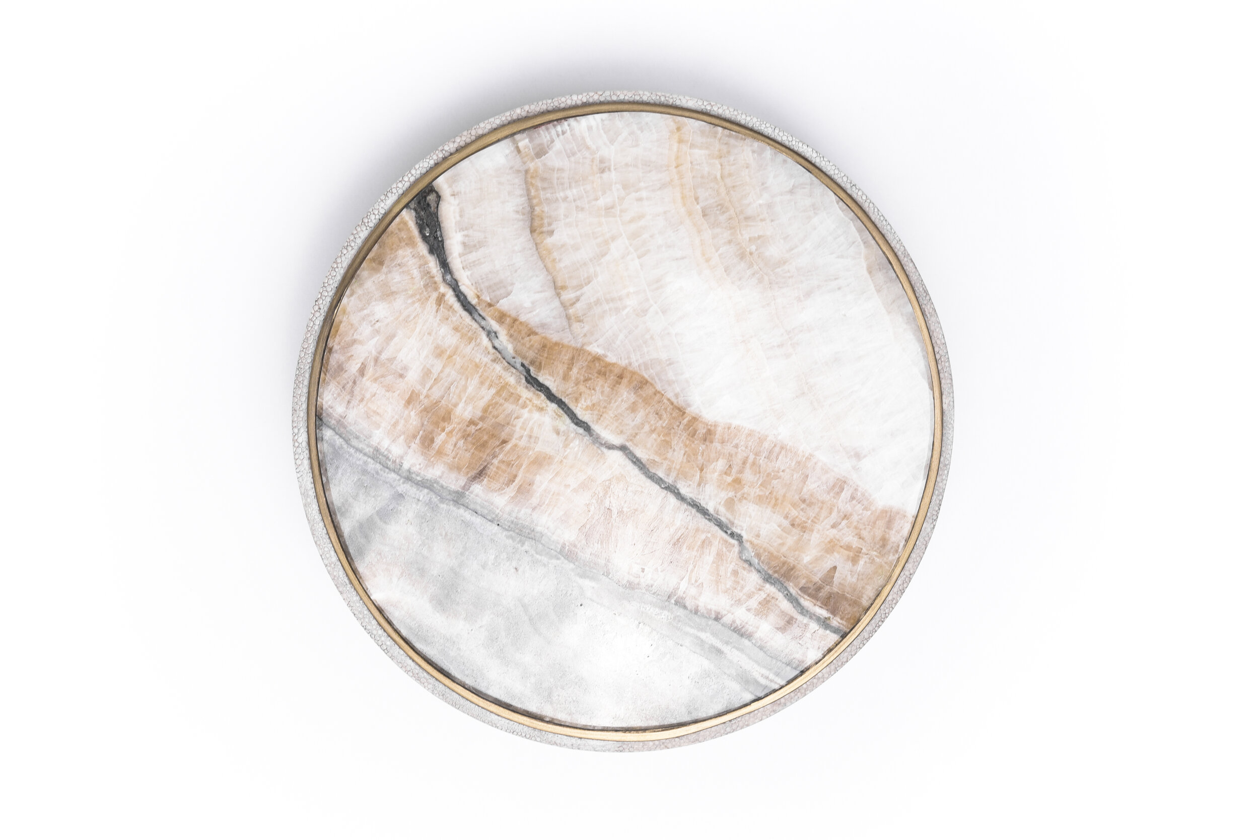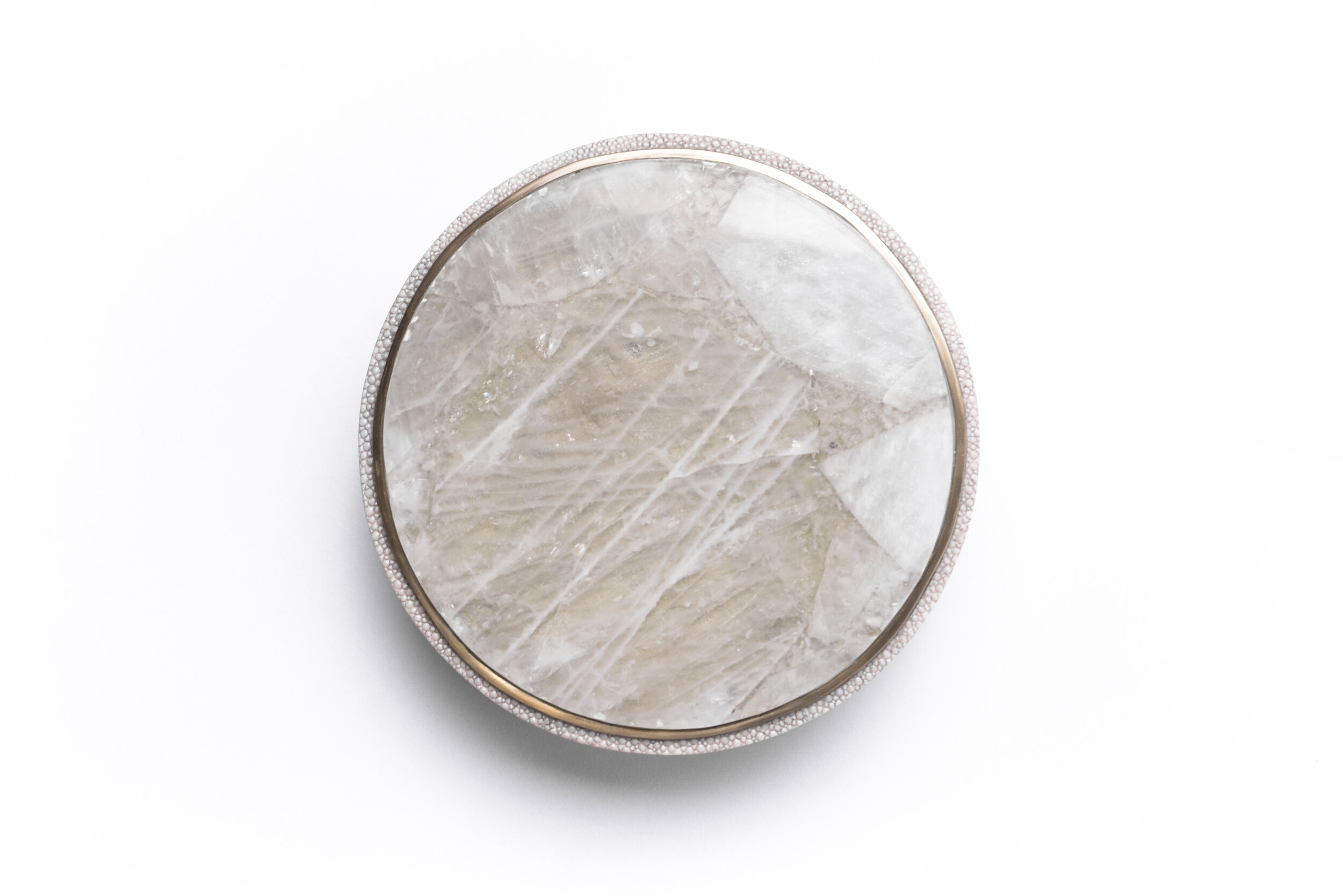 This classic box is a luxurious update to the everyday staple accent. These boxes are inlaid on the top with different semi-precious stones: Patagonia, Smokey White Quartz and Onyx. The piece is finished off on the side with antique natural shagreen and framed with a discreet metal indentation.