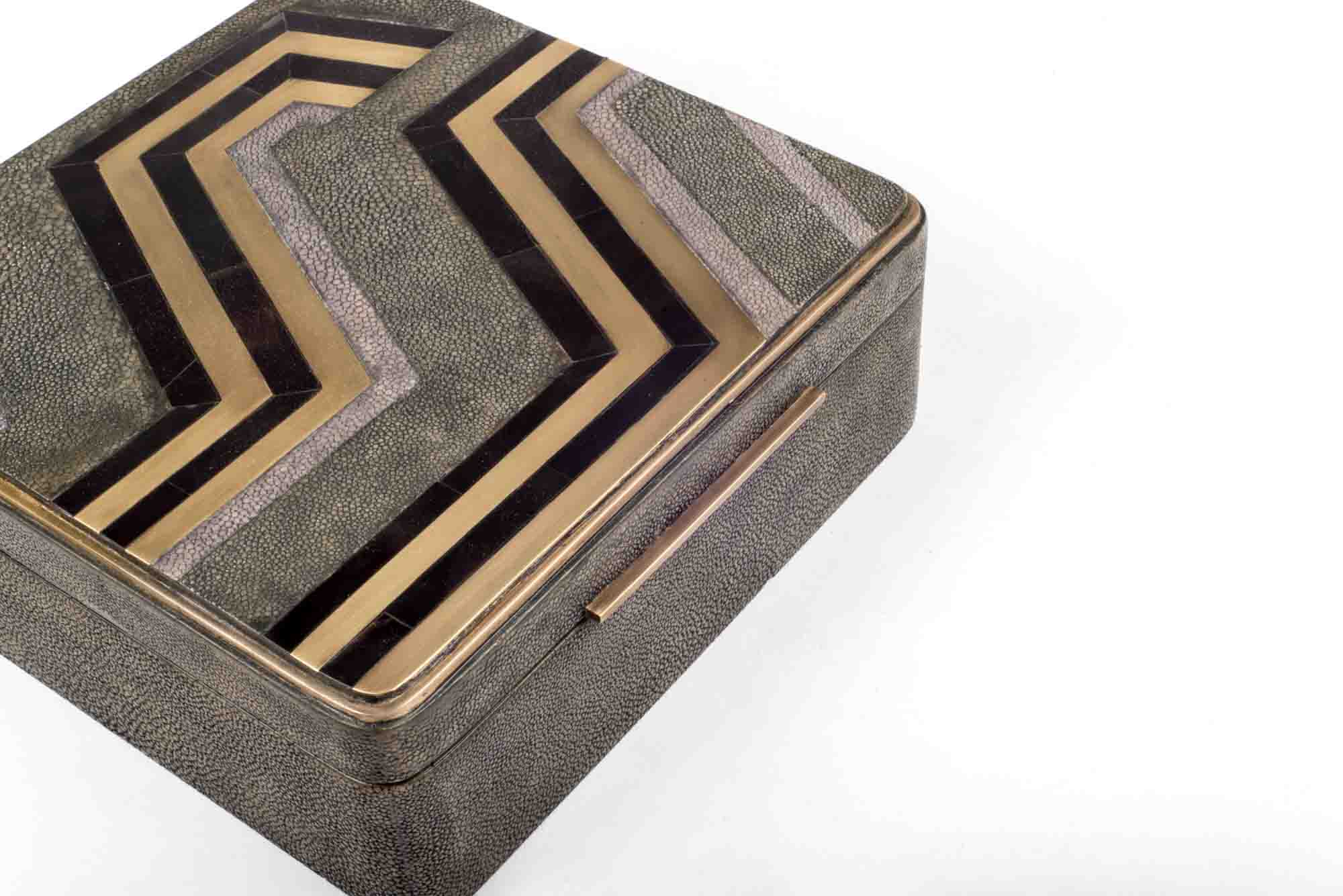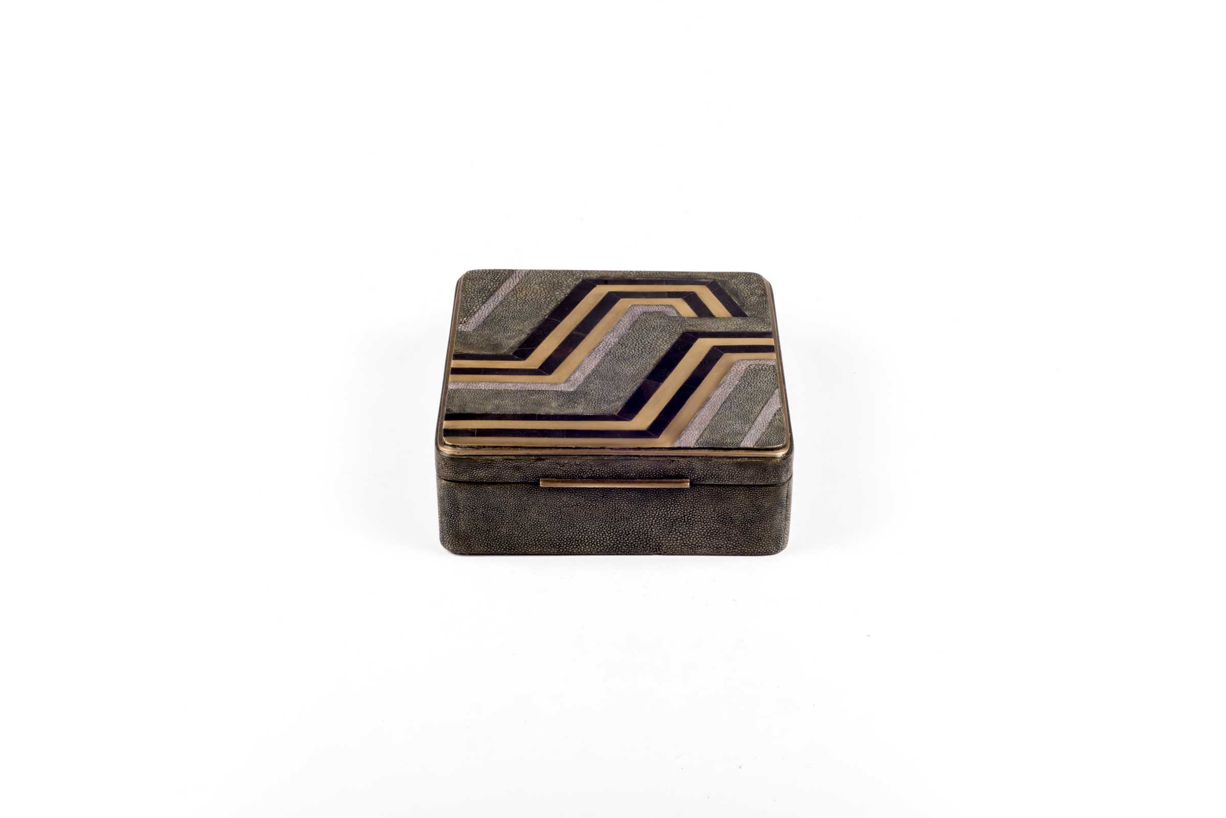 The Blade Runner Dark Jewelry Box, includes intricate inlay work to create this bold & modern pattern. This item comes with a removable velvet interior box. Available in other finishes and sizes.