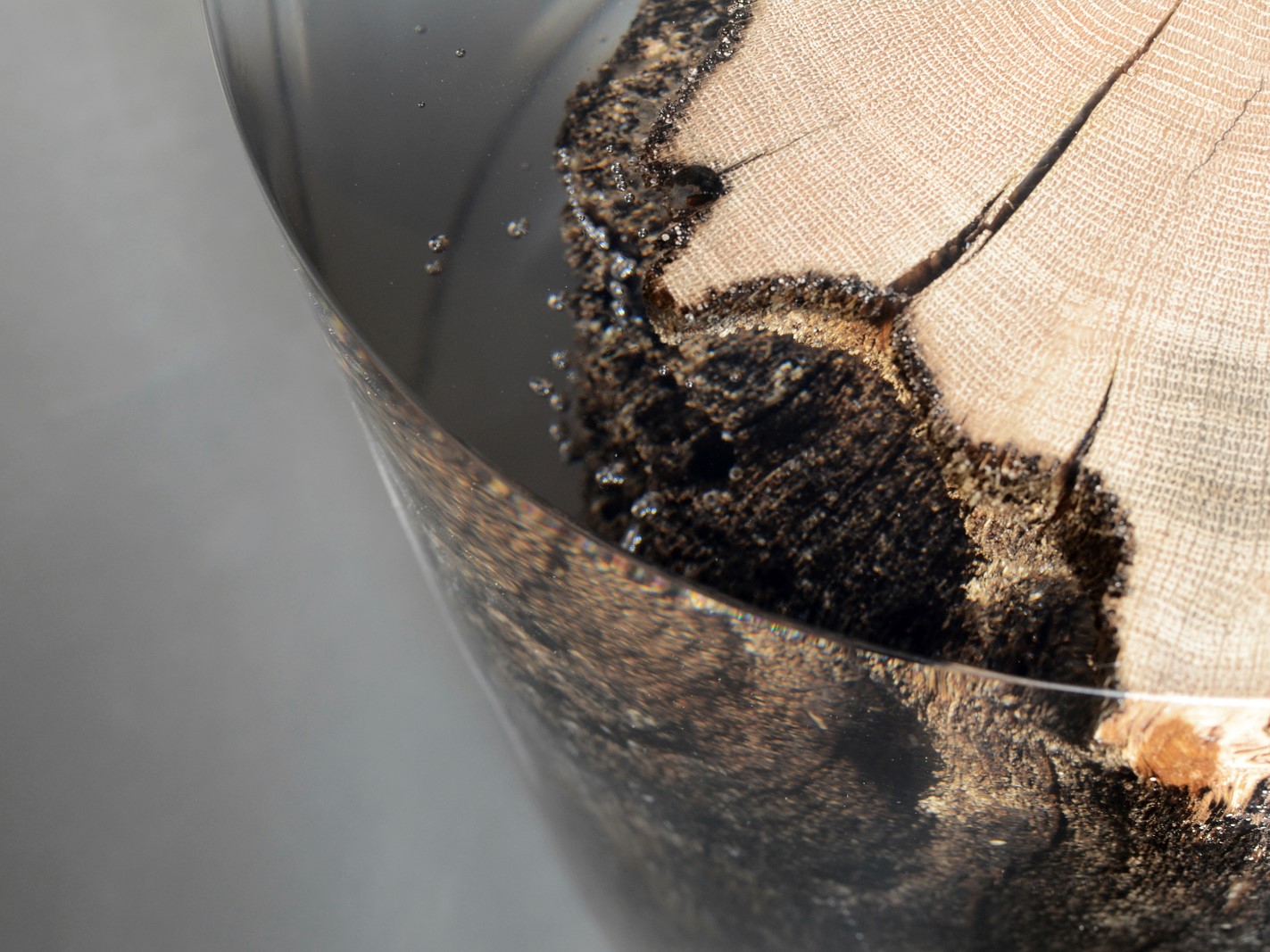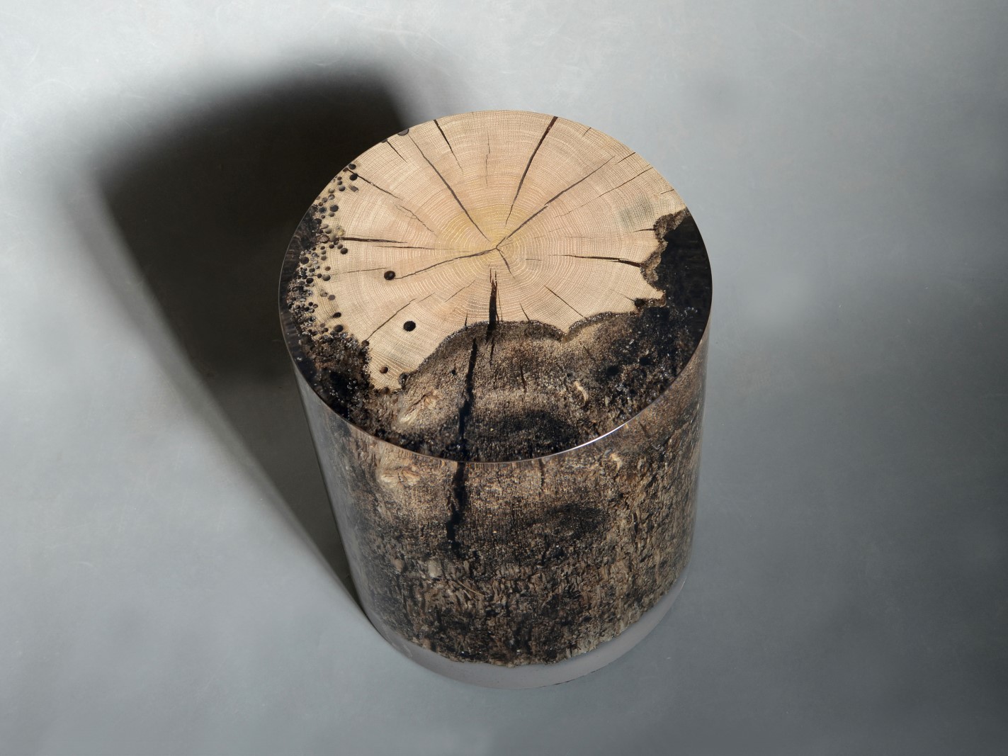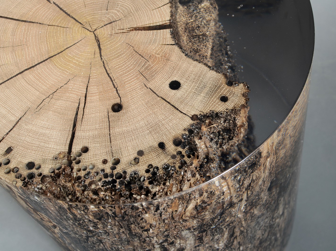 Surfacing FishEye is made of bricola wood, obtained from the timber poles that form the foundations of Venice, driven into the lagoon’s caranto layer – a mixture of solid clay and sand situated at great depths. In spite of everything, Venice continues its fight against the muddy ground and ever increasing water levels. Surfacing FishEye, which is sculpted by water, salt, shipworms and time, is a tribute to this epic submarine struggle that has transcended millennia. During their stay in the Laguna, these Oak logs are deeply sculpted by Teredo Navalis, shipworms that leaves traces of their passing on the wooden surface producing striking patterns of circular holes, whilst avoiding the inner core of the log, allowing it to maintain its health and strength. This creates a beautiful contrast between outer decay and inner robustness. The assiduous labour of the elements necessitates the replacement and scrapping of the poles, providing an organic material that has traversed by life.