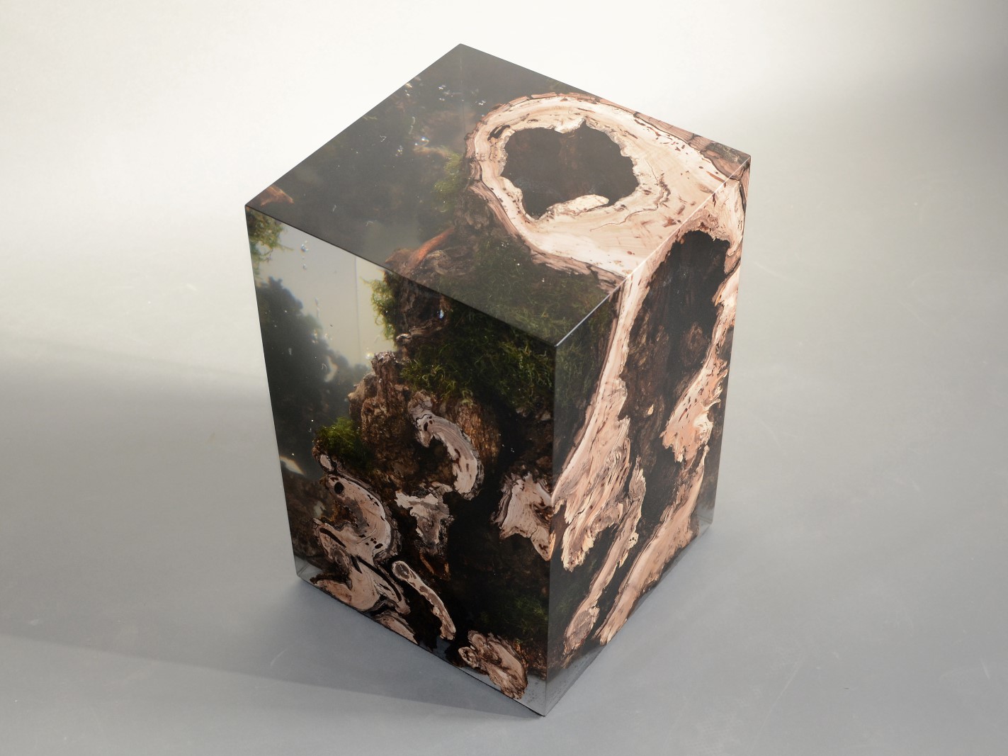 alcarol recover discarded pieces of logs from the undergrowth of the Italian Dolomite mountains and preserve the natural bark surface with their native populations of plants, which are embedded in a resin resembling the water that generated their life.