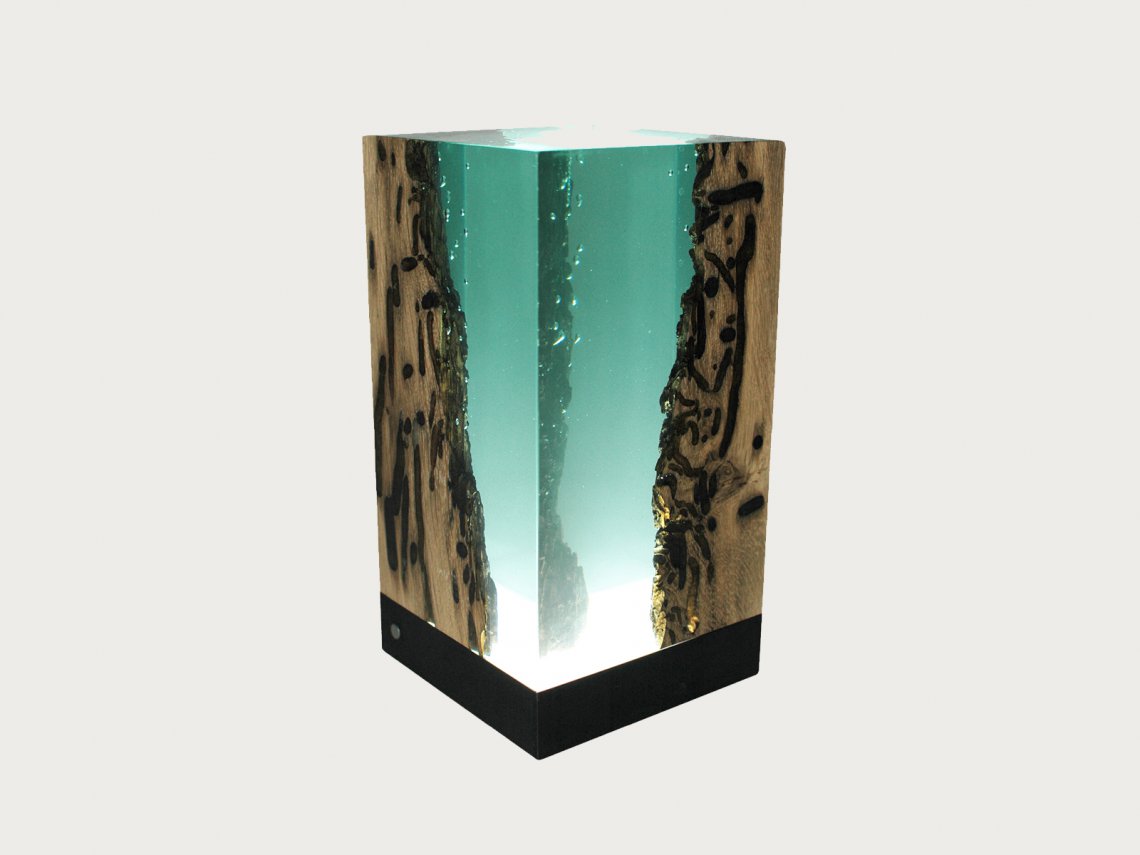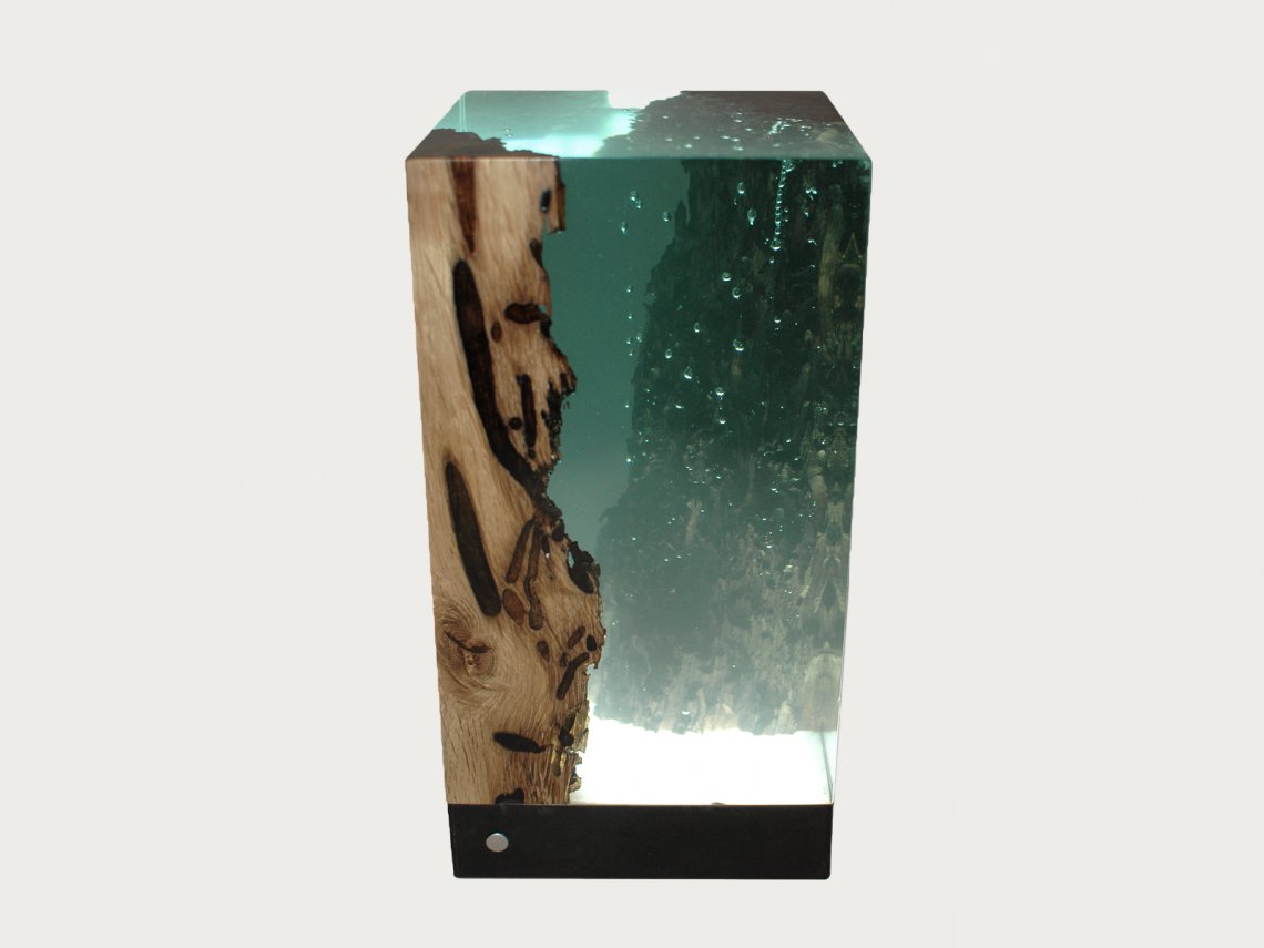 Abyss is a real immersion in a Venetian canal. Touching the metal base you can see the scene with different light intensities, variables such as the weather and the sun in the historic lagoon city.  So when the light reaches the aquamarine resin gives us the thrill of a ray of sunlight filtered through the Lagoon waters, and capturing the underwater air bubbles that bring the wood back to its original place.  The piece of wood is a real fragment of Bricola, that are the famous timber poles planted in the Lagoon seabed. The result is like a submerged cross-section of this extraordinary uderwater world.
