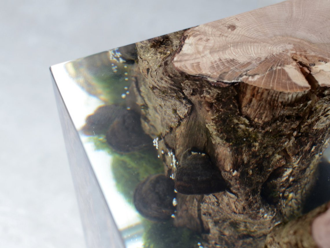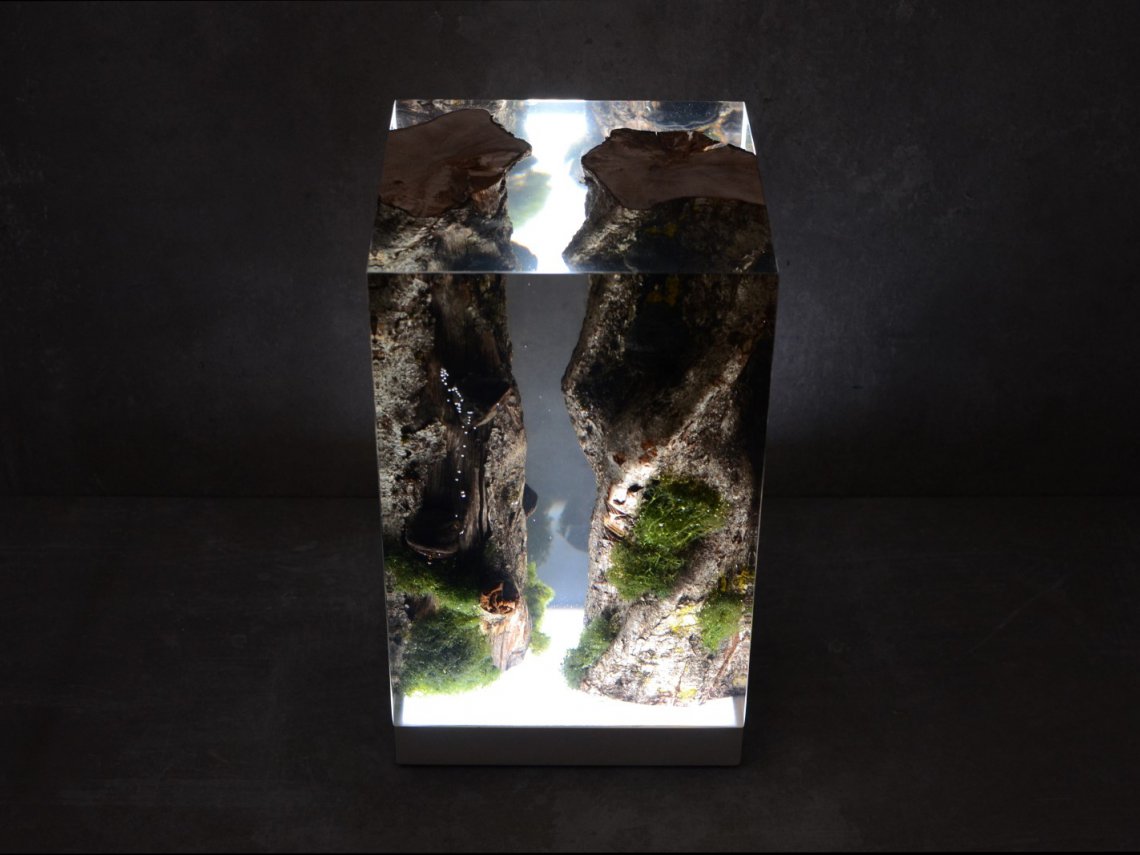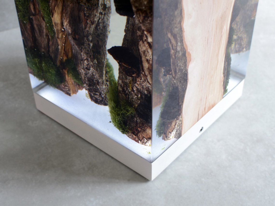 Created by some logs from the undergrowth of the Italian Dolomite mountains, alcarol has conceived Moss Lamp preserving the natural edges of the wood with their native populations of mosses, which are embedded in a resin resembling the water that generated their life.
