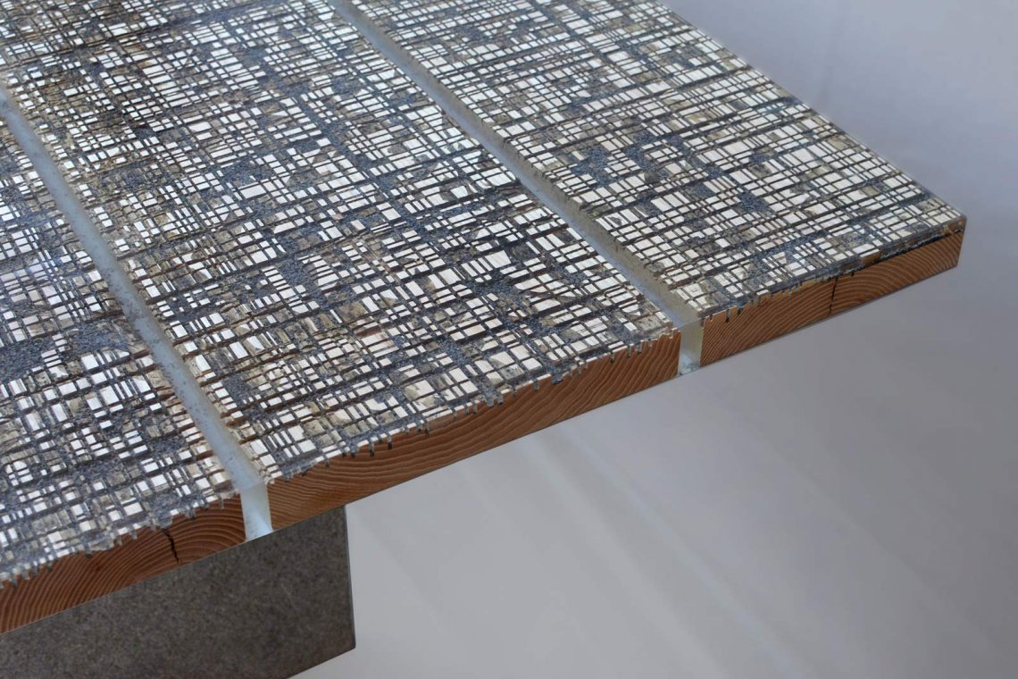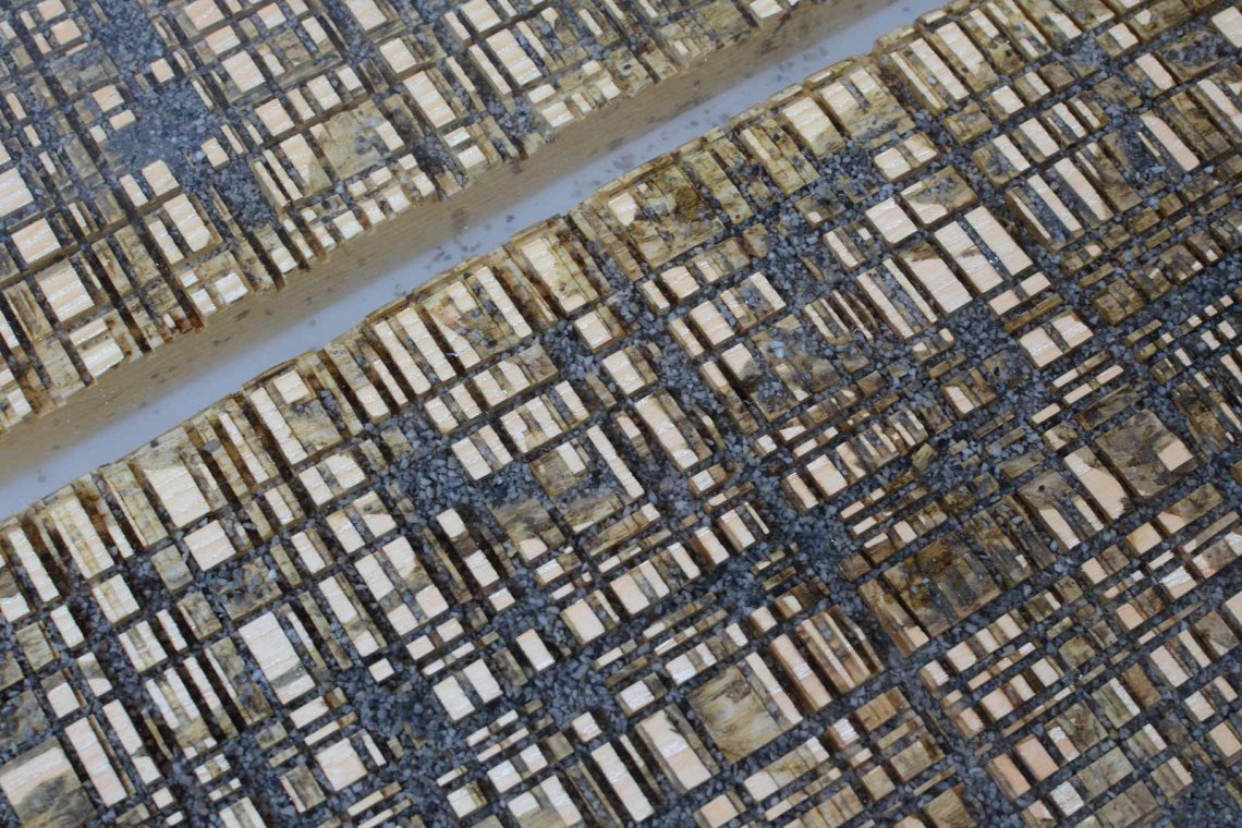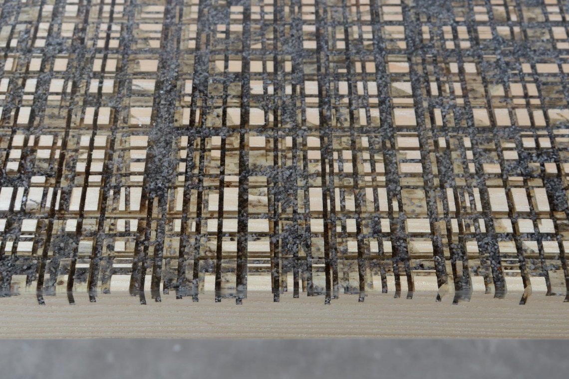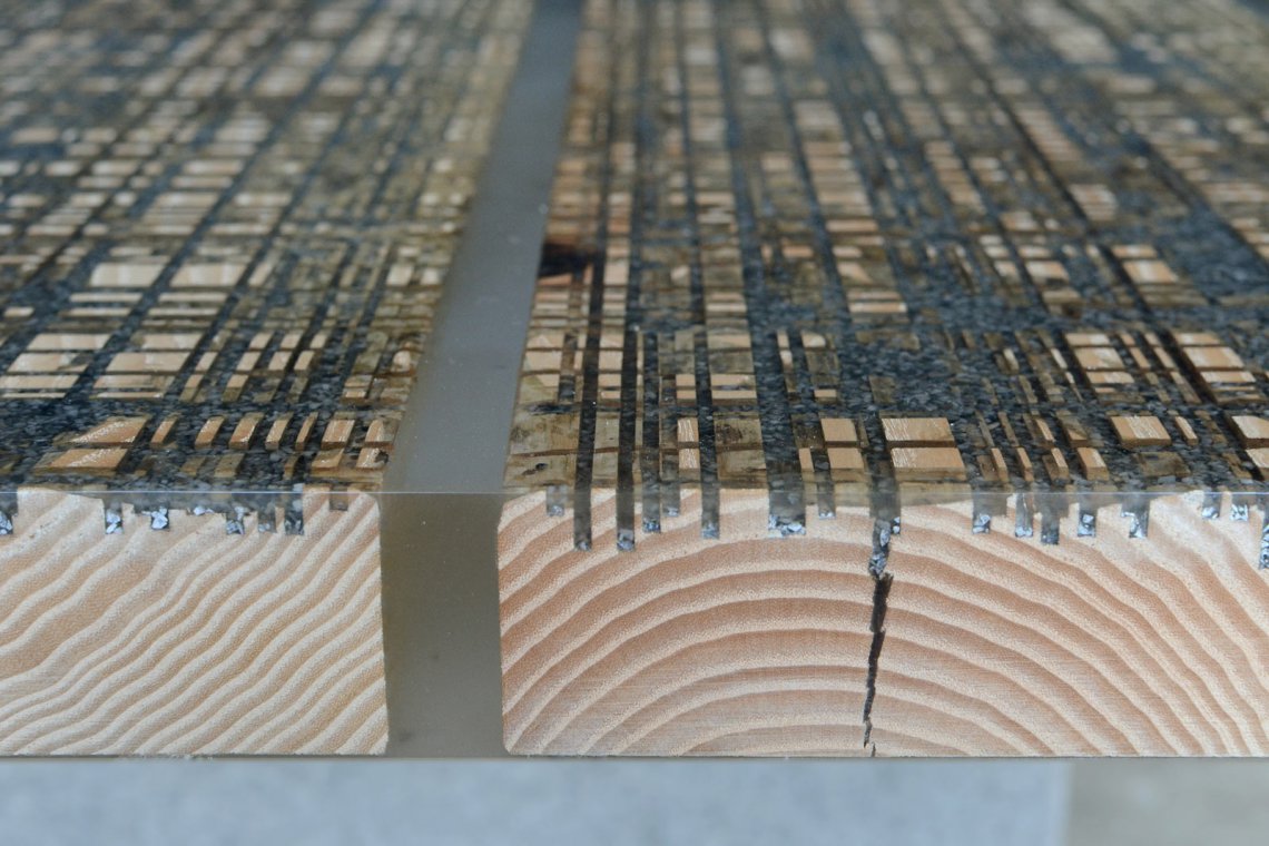 Like the water flow of the cutting operations, a transparent resin is poured on the uneven wood surface to encapsulate marble residues and level all the roughness.